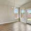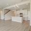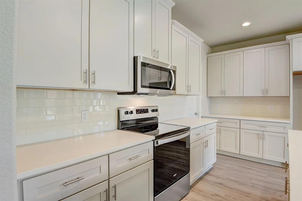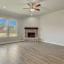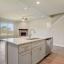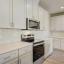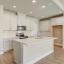 The bright and airy kitchen features white soft close cabinets, quartz countertops, and overlooks a spacious living room anchored by a cozy wood burning fireplace and lined with windows for an abundance of natural light.