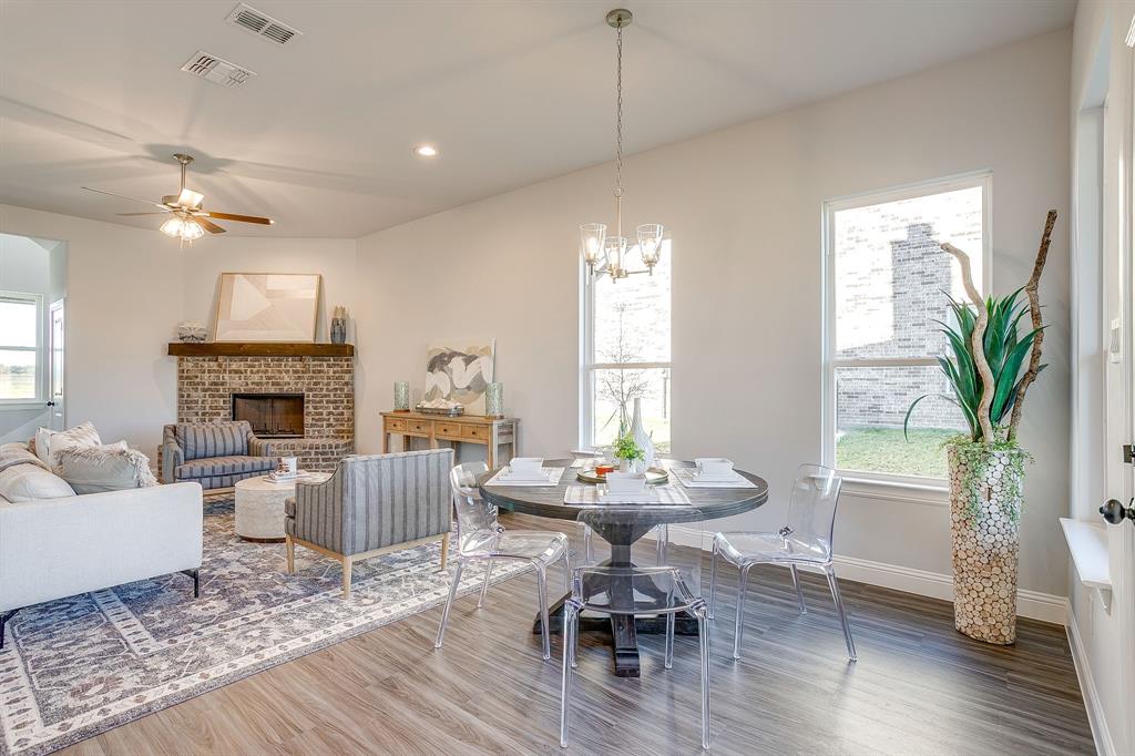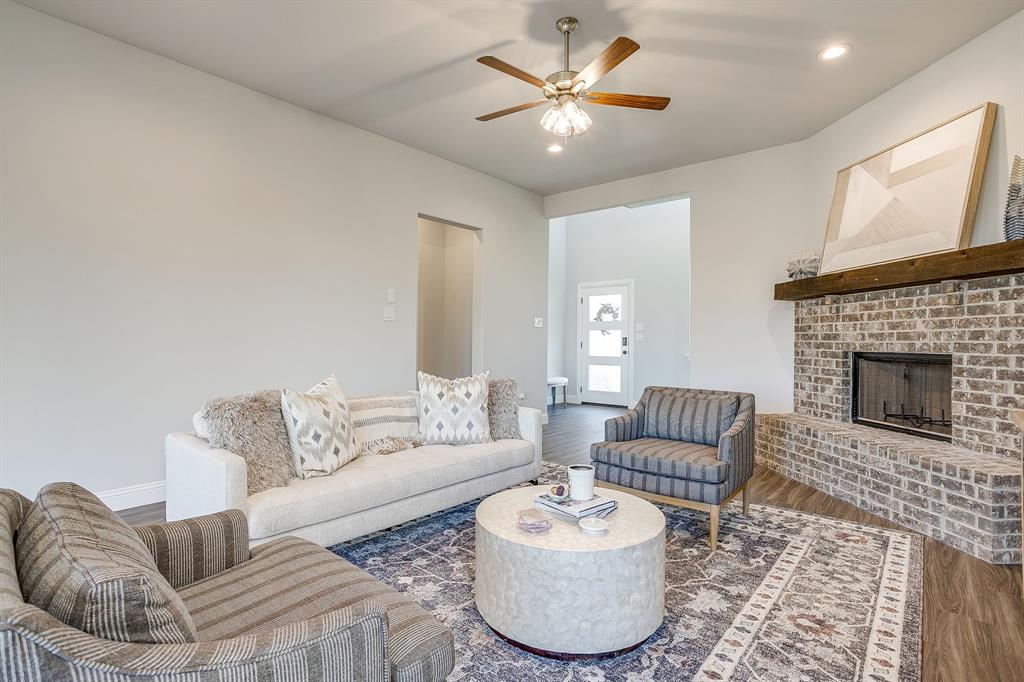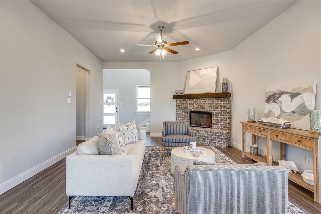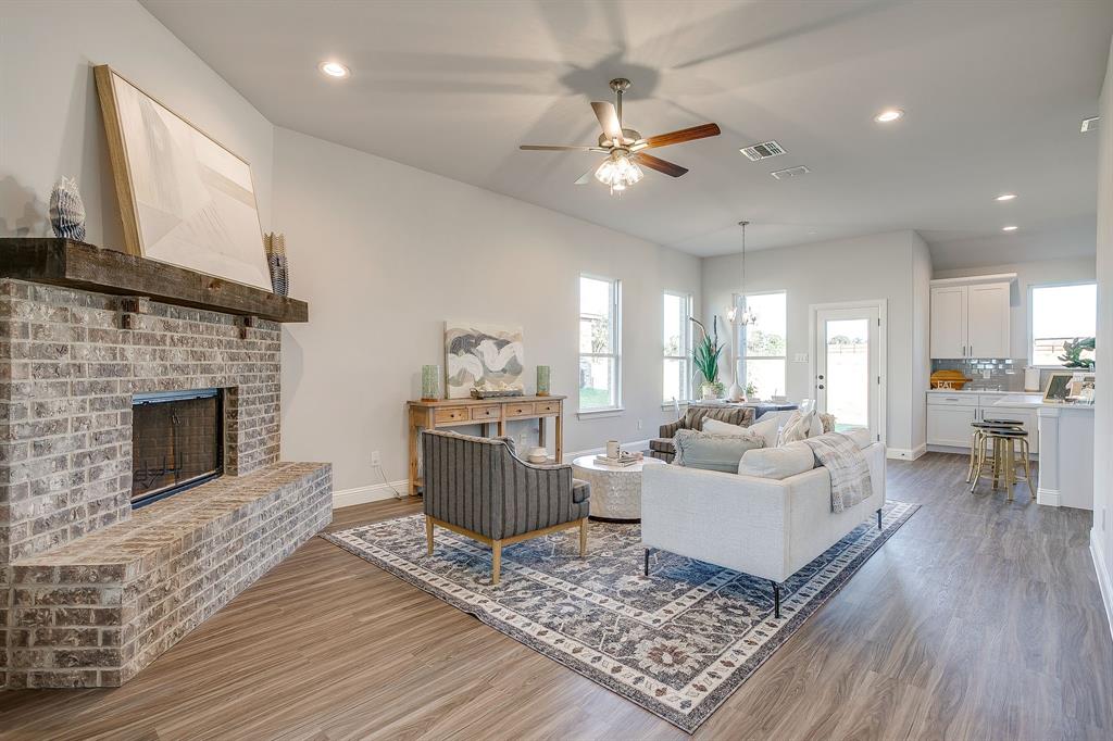 Step into the open-concept kitchen, where you'll find a large island with no sink for uninterrupted prep space, cabinet pulls, and a wide picture window above the sink; providing a stunning view of your open backyard. The cozy living room is anchored by a corner wood burning fireplace, perfect for relaxing evenings at home.