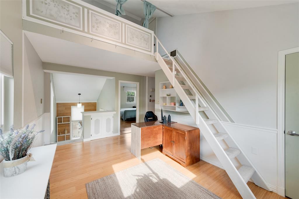 Charming two bedroom home with so many personal touches. You can see the pride of ownership as you walk up to the house with the beautiful landscaping. Light and bright living room that leads to the dining room with vaulted wood ceiling. Great nook under the stairs for kids play or storage. Upstairs you have a sitting area that can be used as a play room or bonus room with stairs that lead to a loft that's great for storage or kids play area. The primary bedroom has vaulted ceilings and is very spacious, with personal touches like a laundry chute plus so much more. The other bedroom has decorative sliding window covering to block light. Cast iron plumbing has been replace August 2025. The backyard is beautiful with a screened in porch where you can enjoy peaceful mornings. Community pool is included in your HOA. Don't miss out on the charming home.