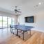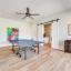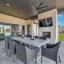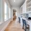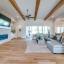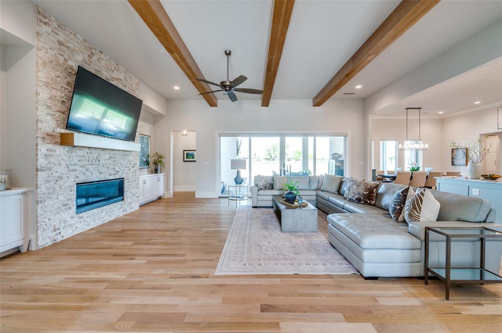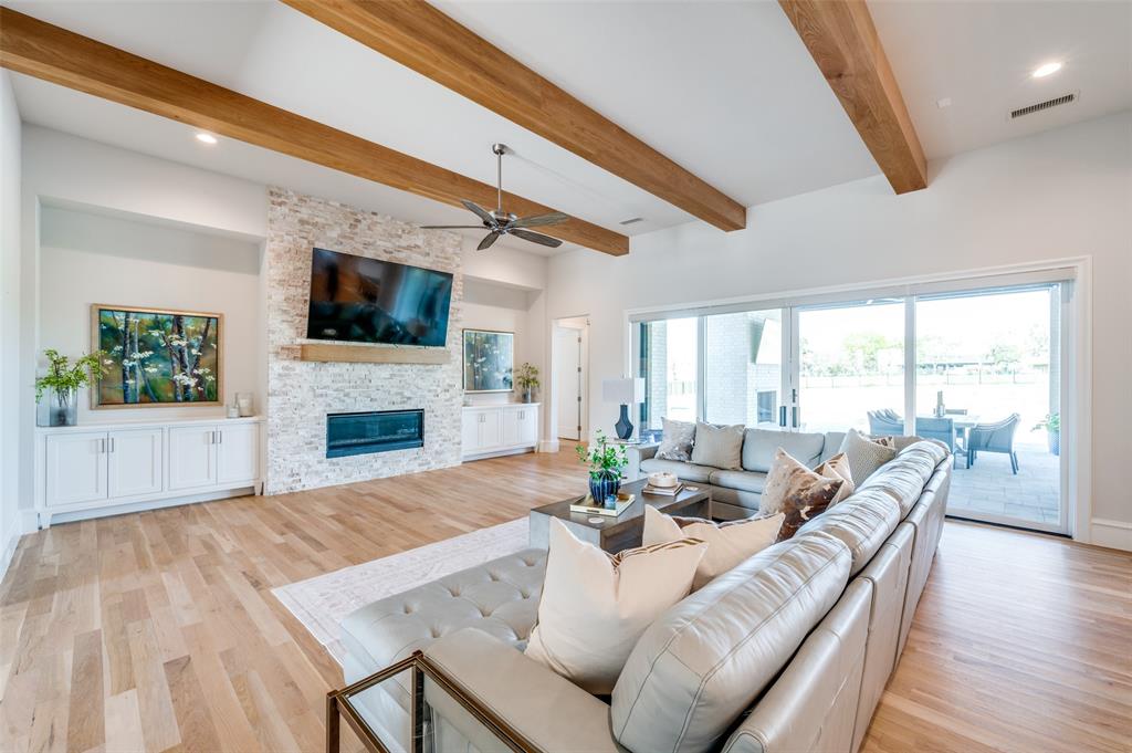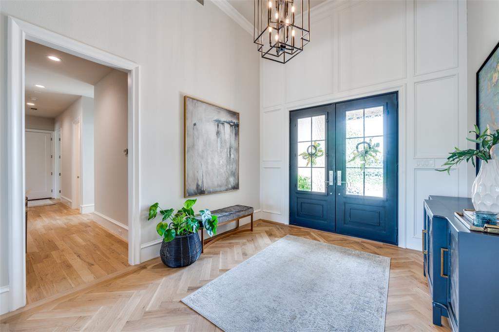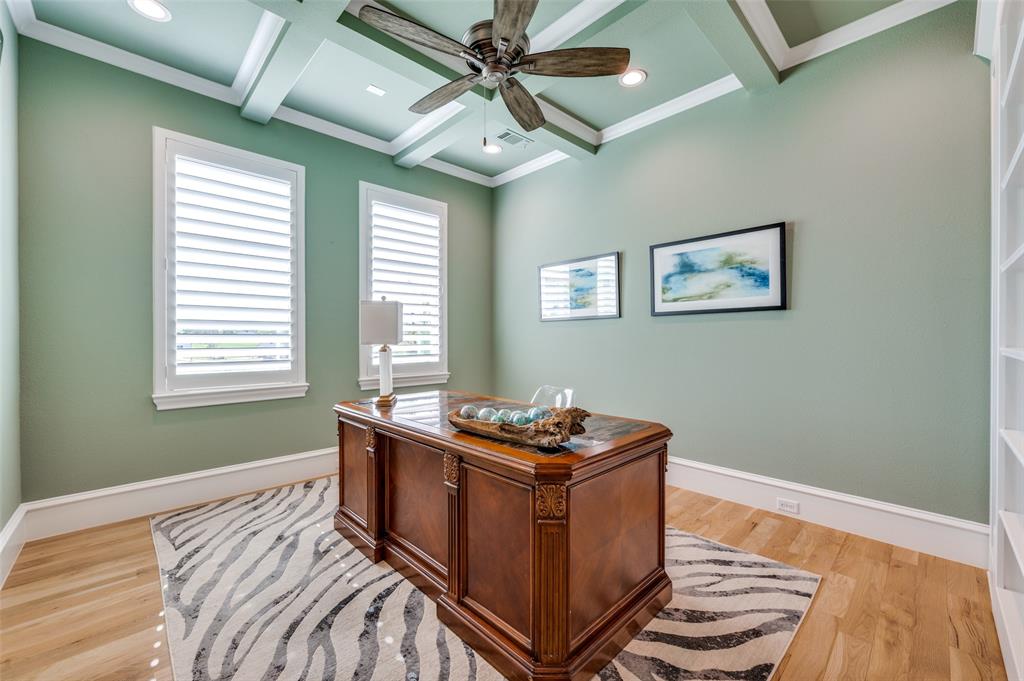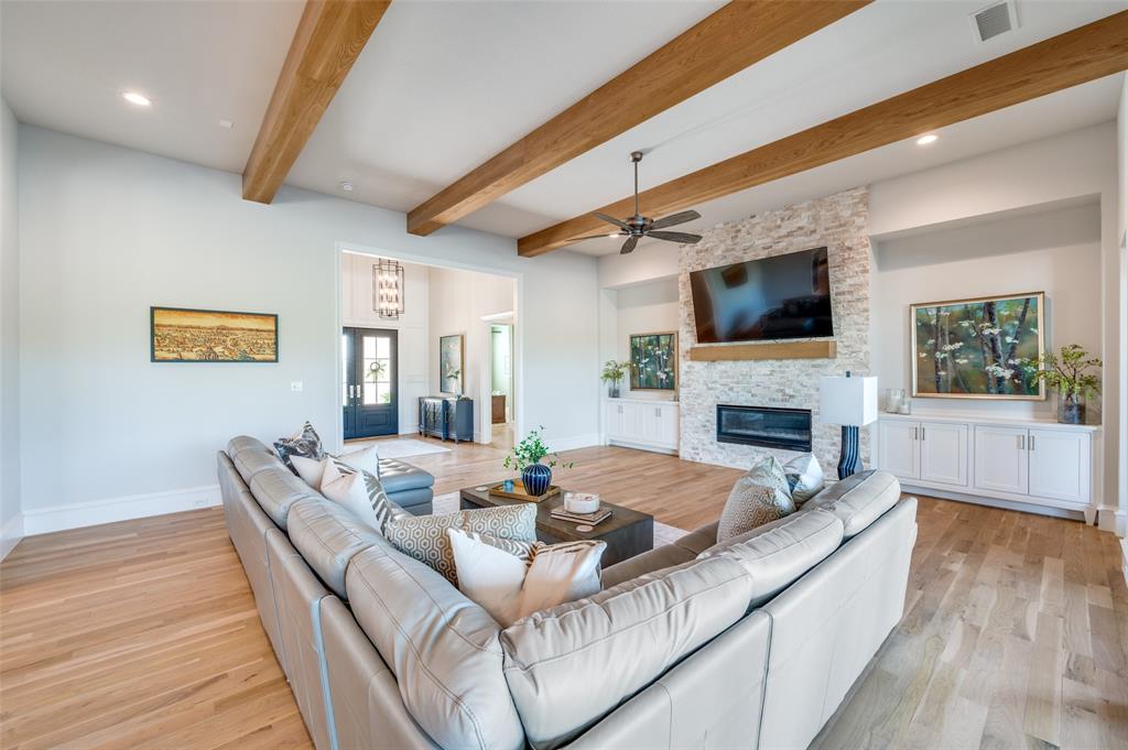 Wood flooring with a Herringbone accent in the entry flows throughout this expansive home with tile only in the wet areas. Features include raised beam ceilings, built ins, pocket doors, motorized screens and Plantation Shutters.