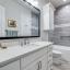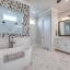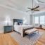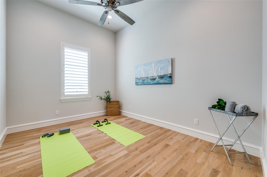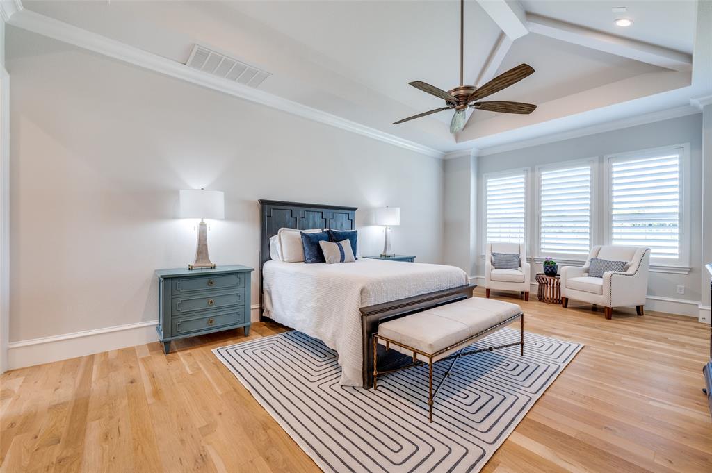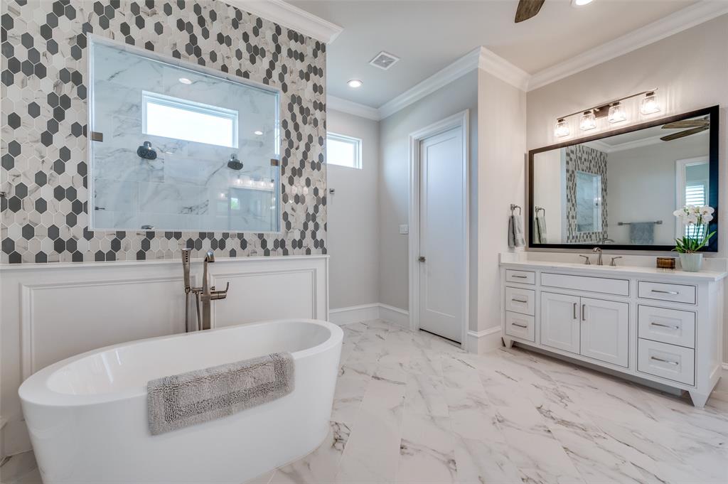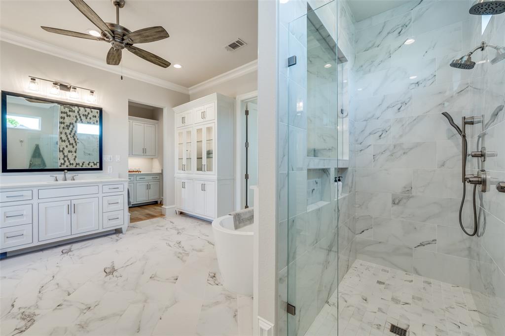 A beautiful free-standing tub, an oversized shower and separate vanities give a spa feel to the master bath. Don’t miss the built-in cabinetry with glass fronts! The spacious master bedroom also has a beamed ceiling and gorgeous views of the HUGE back yard! Don't miss the connecting exercise room, 2nd study, or nursery!