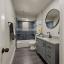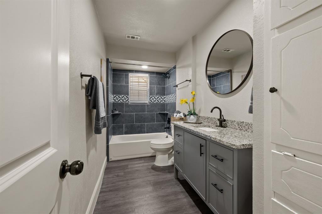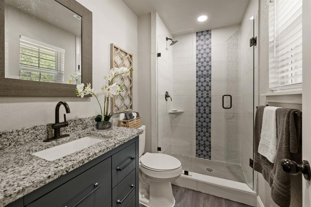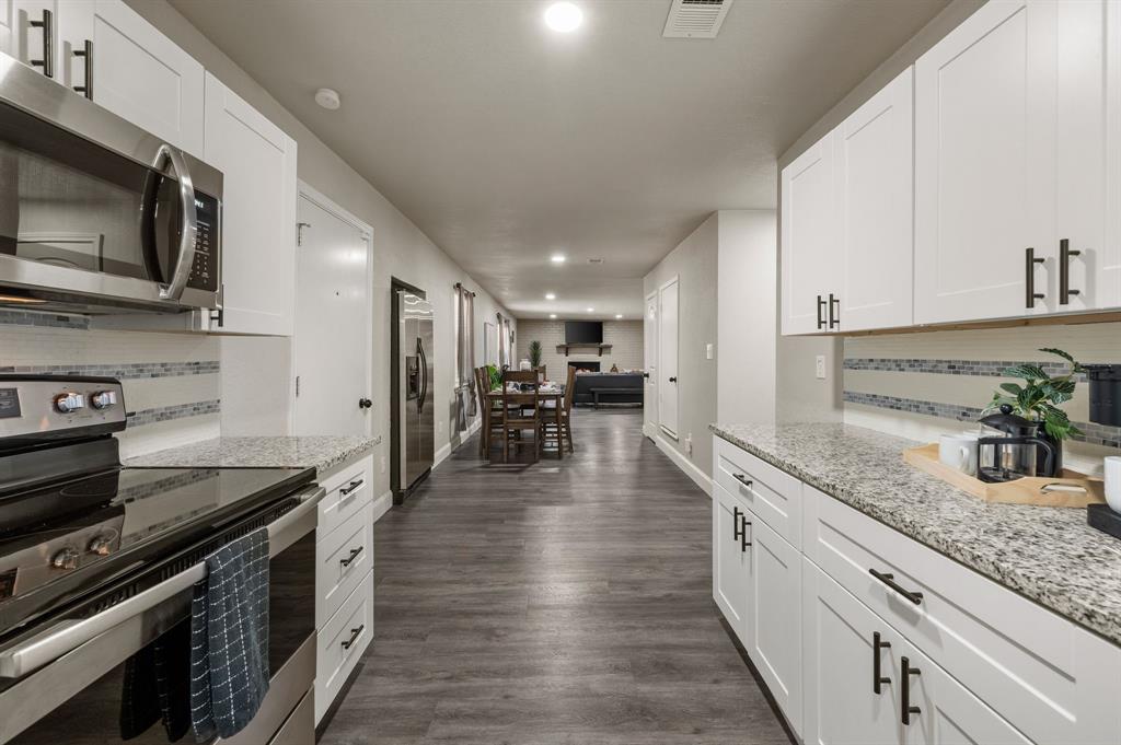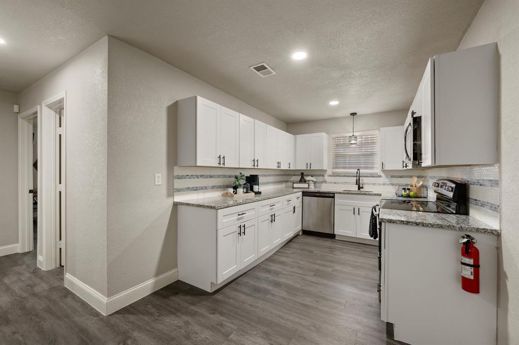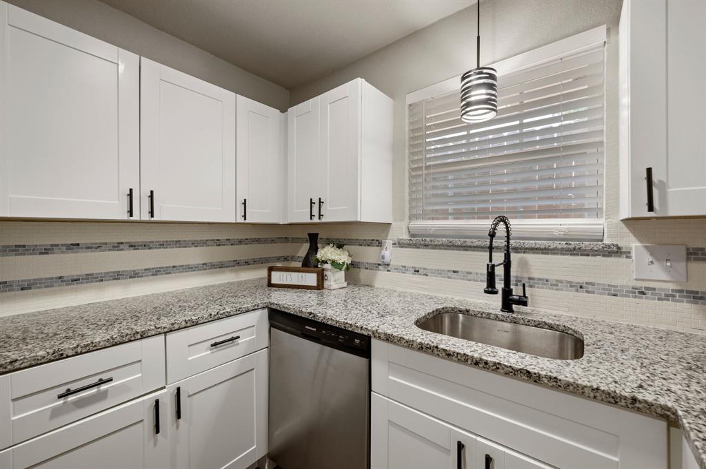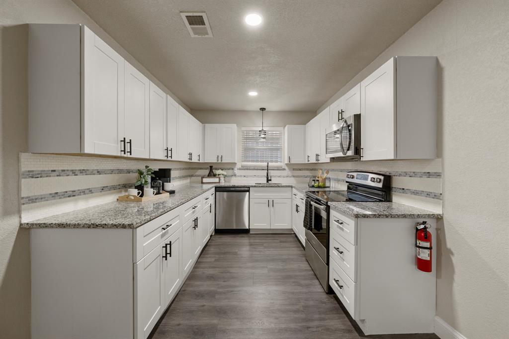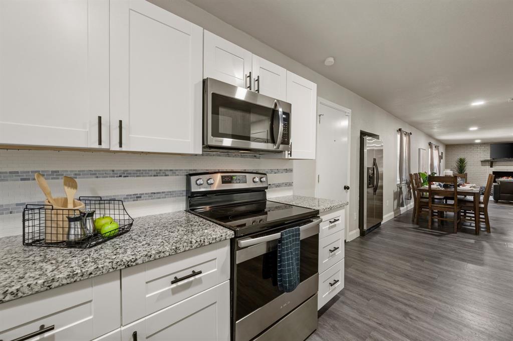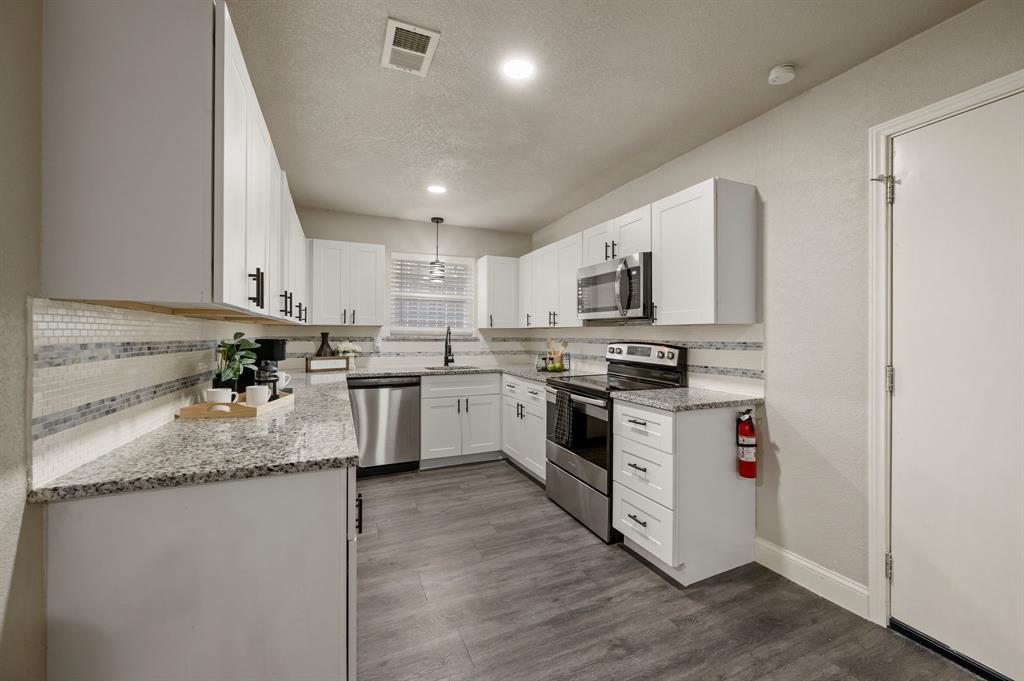 The fully renovated kitchen includes white shaker cabinets, granite countertops, stainless steel appliances, and a subway tile backsplash. Both bathrooms have been tastefully remodeled with modern finishes and fixtures.