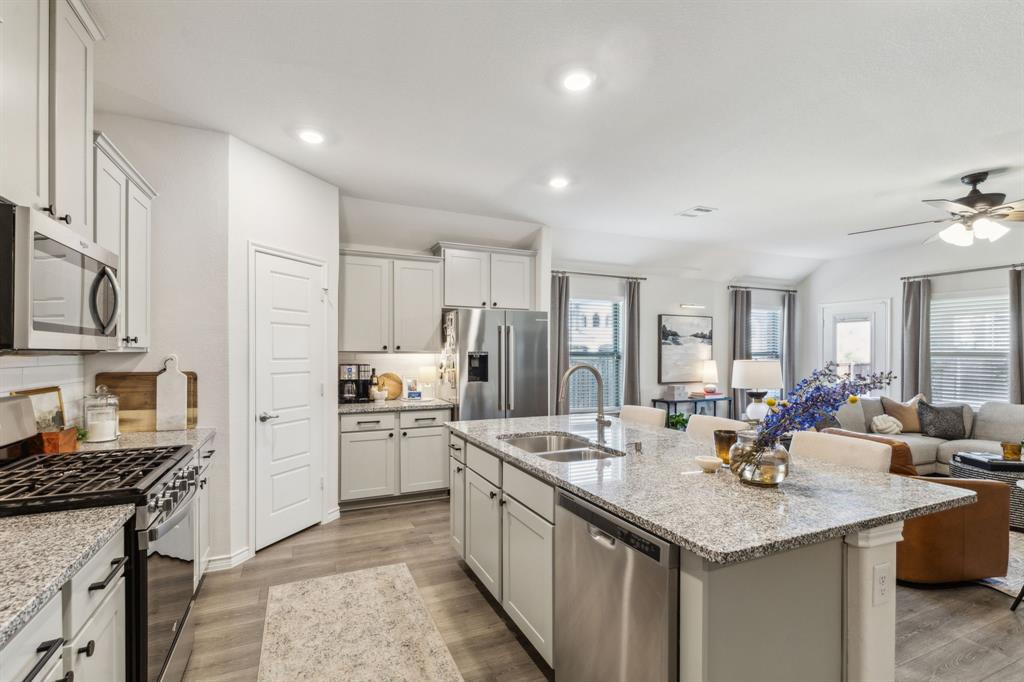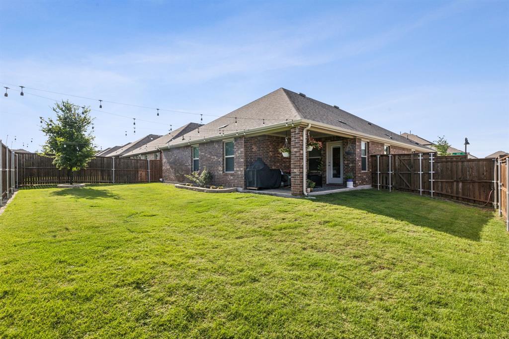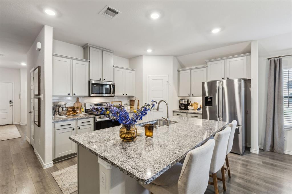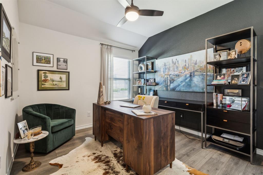 Located in the sought-after Bluewood Community in Celina TX on a desirable corner lot, this professionally decorated one-story home offers four bedrooms, three full bathrooms and a dedicated study. The gourmet kitchen features a gas cooktop, breakfast bar with seating, granite countertops and stainless steel appliances. The front guest room includes its own full bath. The primary suite offers a spa-style bathroom with walk-in shower, painted cabinets and an oversized walk-in closet. Two secondary bedrooms share a well-appointed hall bath and the fourth bedroom serves as a media room or second living space. A private home office is located just off the entry.
