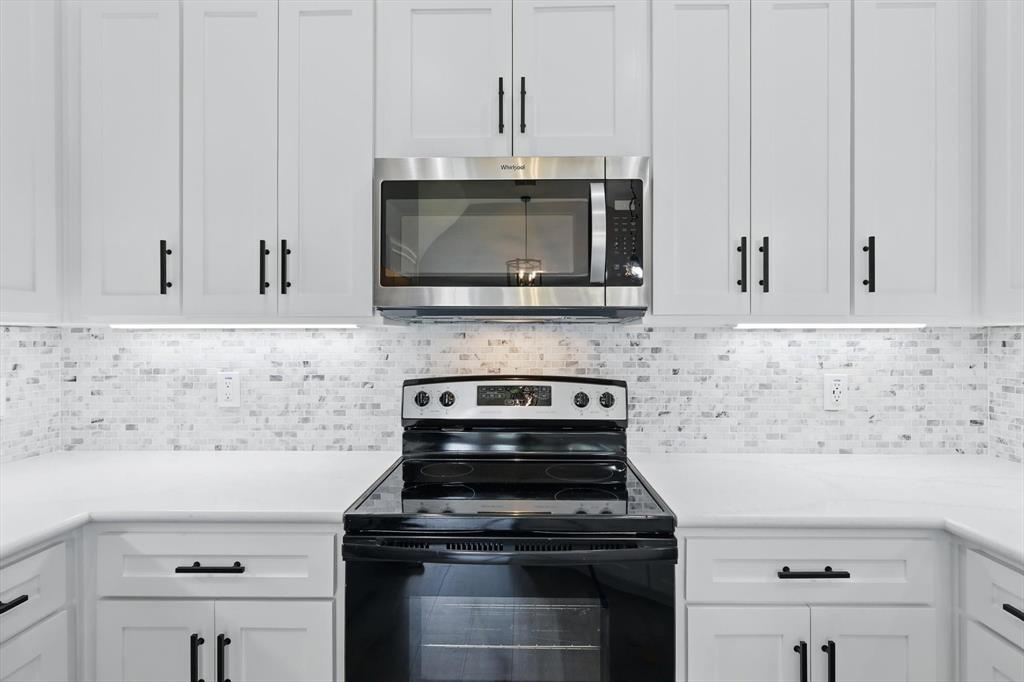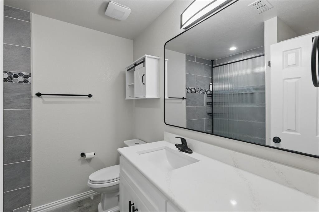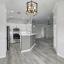 The fully remodeled kitchen boasts all-new appliances, updated cabinets with modern hardware, pendant lighting, under-cabinet lights, and a sleek French door refrigerator. Both bathrooms have been completely renovated.