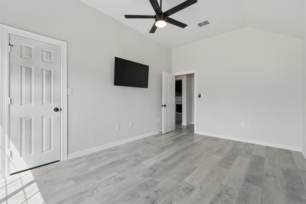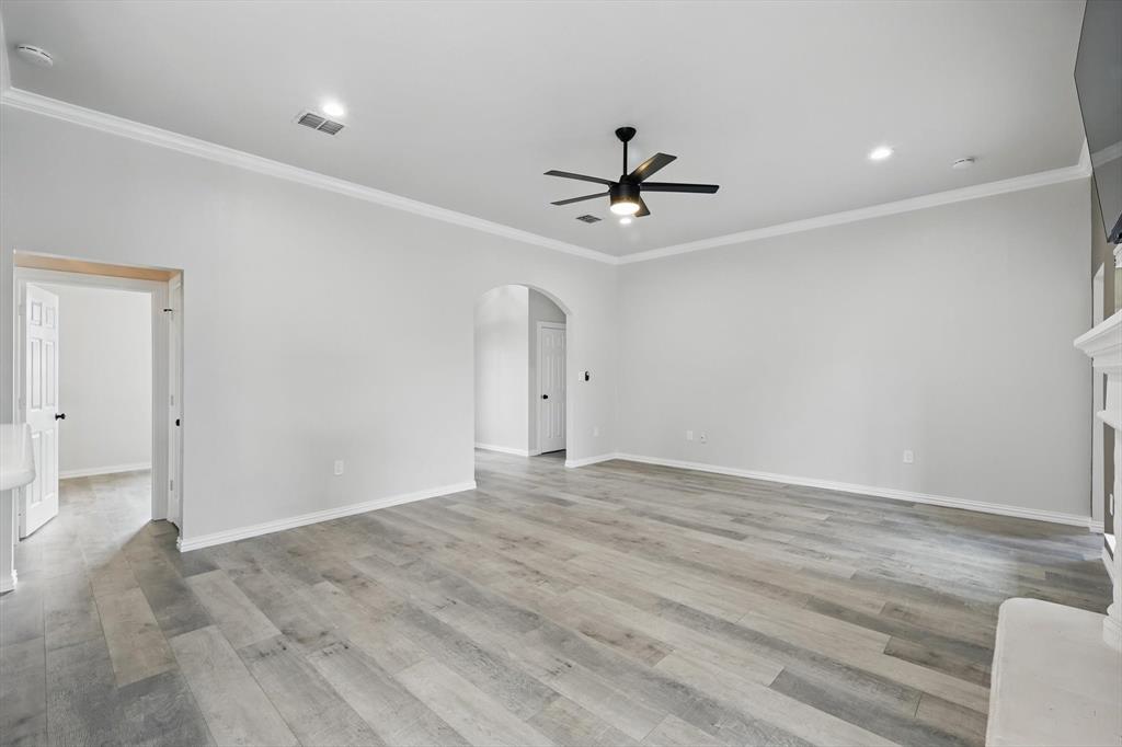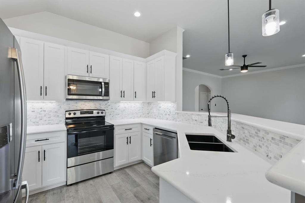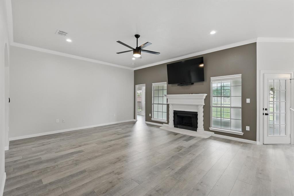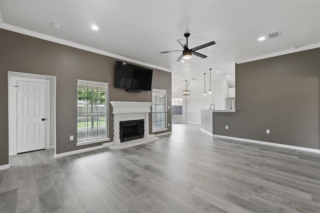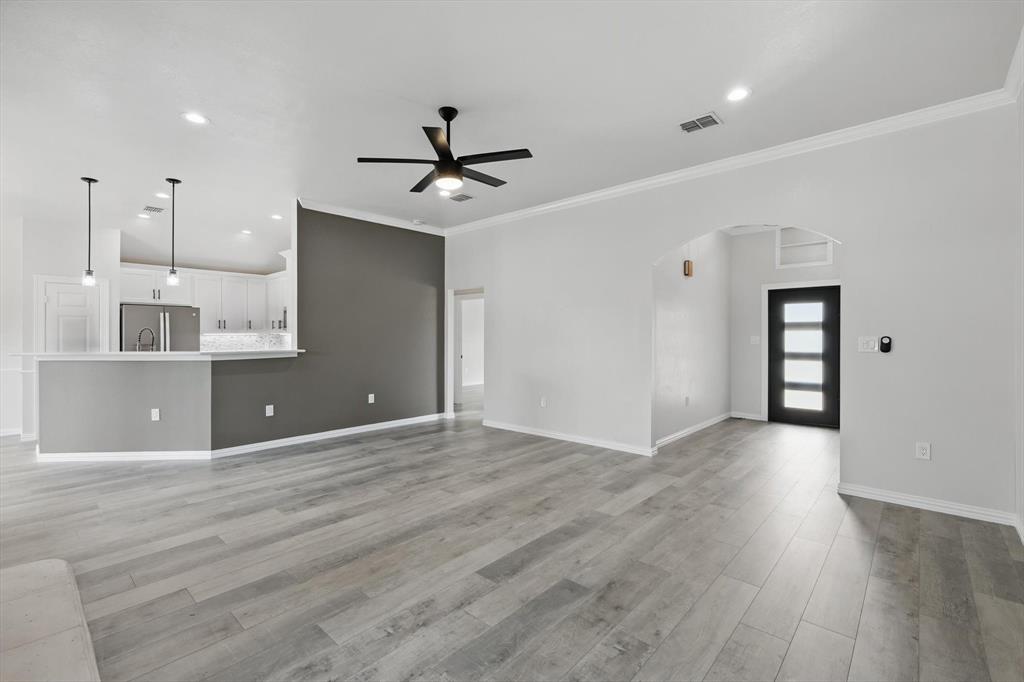 A beautifully upgraded home that combines modern comfort, smart technology, and thoughtful design. With extensive renovations completed since June 2024, this property offers exceptional value and turn-key living in a charming community. Step inside through the new custom iron front door and be greeted by fresh interior paint, stylish accent walls, and brand-new waterproof laminate flooring throughout the home. The spacious living room features a mounted 70 inch flat-screen TV with sound bar included, recessed lighting, and a remote-controlled ceiling fan, creating an inviting space to relax or entertain.