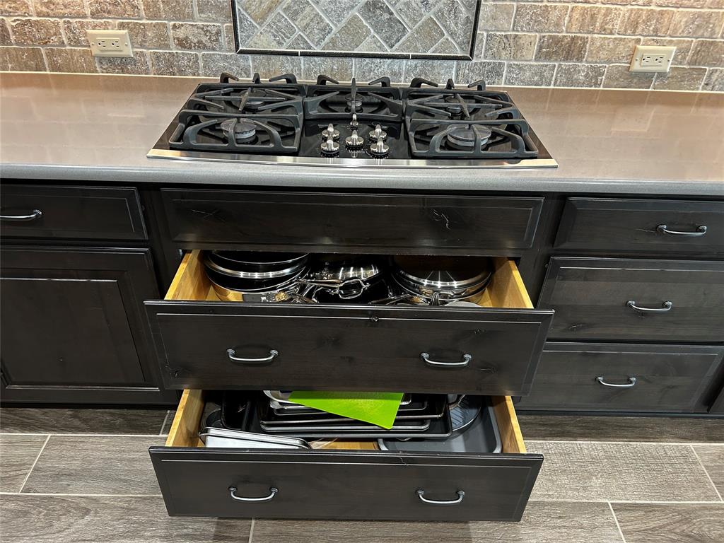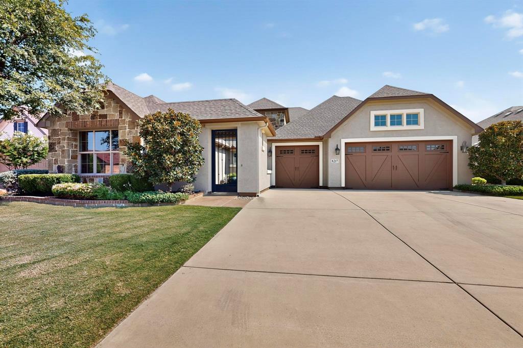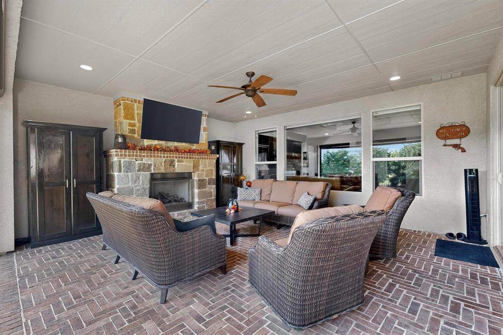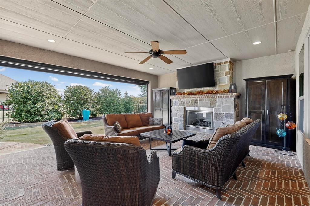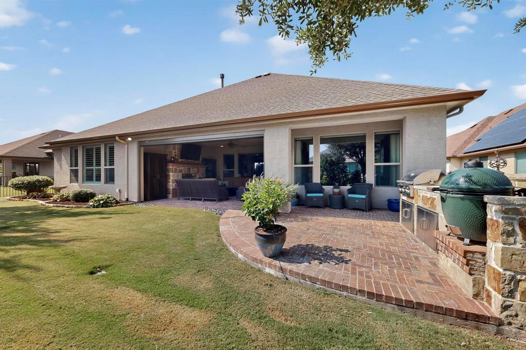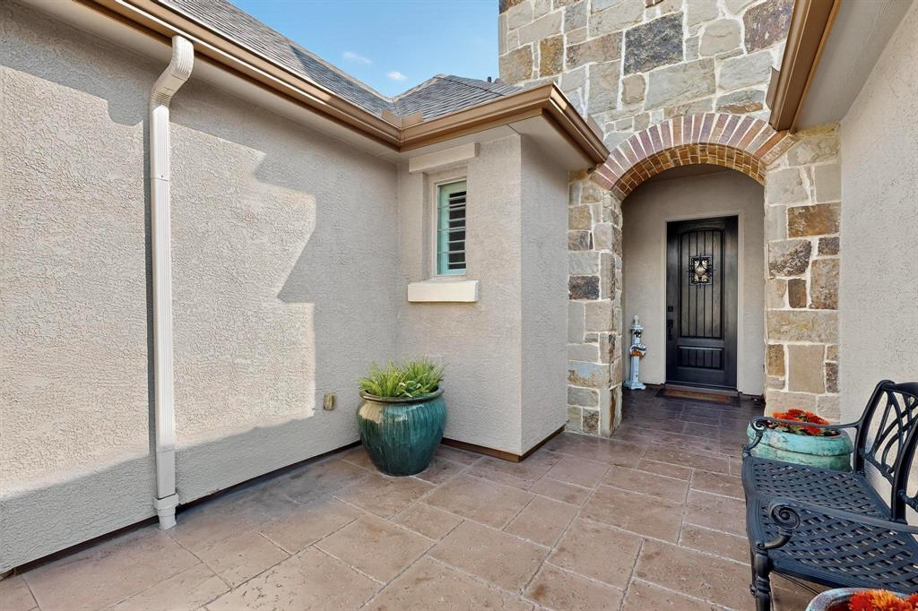 This upgraded Aubrey home with a Casita will check all your boxes. 3 bedrooms and 3.5 baths. The garage measures 31 x 29 and has 8 ft carriage style doors with daylight windows and is fully insulated. The front courtyard has a stamped concrete floor and lots of space for seasonal decorations. The living room has faux beams, large windows, built in media center, a stone gas fireplace with a heatilator. There is a dry bar with stemware and wine holders. This room is open to the kitchen for easy entertaining. The kitchen features Tacoma Knotty Alder cabinets, quartz counters, an island with seating, gas cooktop, wall oven and Advantium microwave. The sink is granite, there are roll out shelves, undercounter lighting, pendant lights, dovetail drawers and hidden trash and recycle bins. The butler’s pantry is an excellent place to keep all your small appliances, it features a sonic style ice maker. There is a walk-in pantry to top it all off. The dining room overlooks the beautiful backyard with a water feature and privacy shrubs. Wood look tile flooring throughout. The primary bedroom has crown molding, a fan, plantation shutters, tiled shower with niche, medicine chests and framed mirrors. The second primary bedroom has plantation shutters, a walk-in closet, fan, and a tub-shower combo. The 3rd ensuite bedroom is the casita-guest quarters. This is a private room for your guests or in-laws. It has upper and lower cabinets with a counter, a beverage center, tiled shower, closet, fan and door with mini blind inserts. The office has a built-in cabinet and shelving, a fan, French doors and a double window with pediment. The half bath features tiled wainscotting and full vanity. Now for the outstanding extended back patio. A place where you’ll be proud to invite your guests. There is a brick herringbone floor, plenty of room for chairs and tables, a gas fireplace with heatilator, remote shades, outdoor TV ready, a built in BBQ grill, a fan and recessed lights.