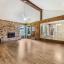 The main living area impresses with soaring vaulted ceilings, exposed wood beams, full wood paneling, and a striking floor-to-ceiling brick fireplace flanked by built-ins. A split-level formal dining area with ornate iron railing adds charm and architectural interest, overlooking the expansive living space. The primary suite is a dream with an ensuite bath that features double vanity, separate shower, and two walk in closets. The other two bedrooms share a Jack-and-Jill bath but have their own closets. Located separately, is a large bedroom that can be a perfect space for a game room, or as an extra space for guests.