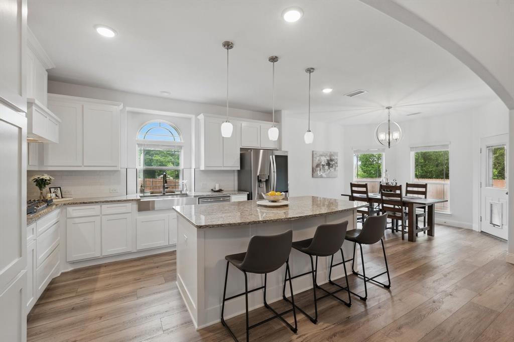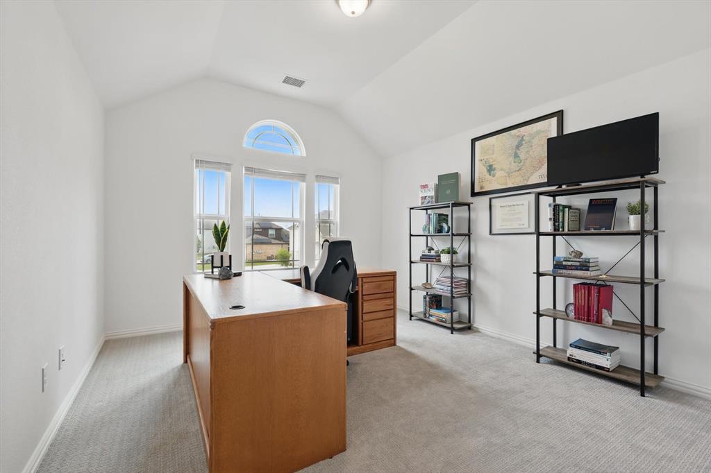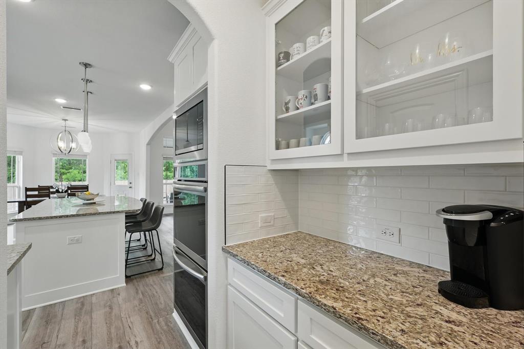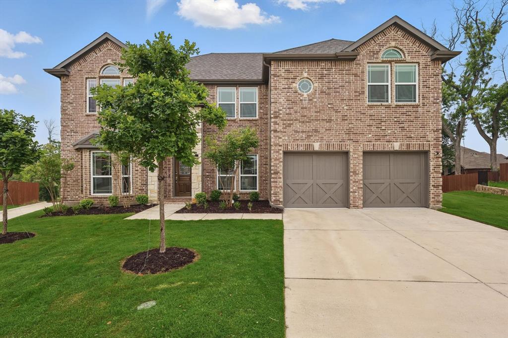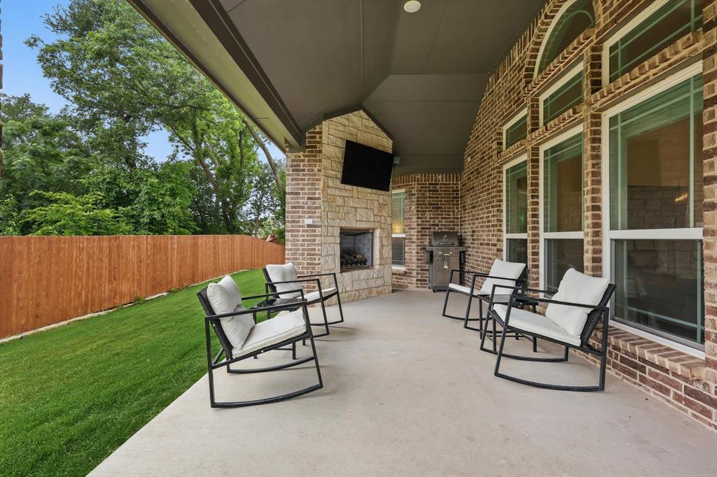 Situated on a spacious 0.64 ACRE LOT WITH A TREED BACKYARD and in a peaceful cul-de-sac, this beautiful 4,188-square-foot home was built in 2022 by First Texas Home. It offers 5 spacious bedrooms, 4 full bathrooms, a dedicated office, a versatile loft, and a relaxing media room, making it ideal for comfortable family living and entertaining. The home features an open-concept layout. The chef inspired kitchen includes a 5 burner gas cooktop, double ovens, shaker-style cabinetry, a spacious California island with pendant lighting, a farmhouse sink, and a walk in pantry. Between the kitchen and dining area, there is a wet bar for convenient entertaining. Adjacent to the kitchen, the expansive living area boasts a vaulted ceiling and a cozy stone fireplace, creating an inviting atmosphere. The primary suite provides a serene retreat with a spacious walk-in closet and an ensuite bathroom featuring dual vanities with ample counter space and storage, a separate shower, and a soaking tub. The large covered patio, complete with a fireplace, overlooks the backyard, extending the living area outdoors. Situated on a generously sized lot of over half an acre, the home enjoys a prime location that offers exceptional privacy and a peaceful setting, making it an ideal retreat. Additional features throughout the home include luxury vinyl plank flooring, upgraded carpeting, and granite and quartz countertops, adding both durability and elegance to the living space. Located within the Midlothian Independent School District, it is close to schools, parks, and shopping centers. With no HOA fees, residents enjoy greater flexibility and privacy.