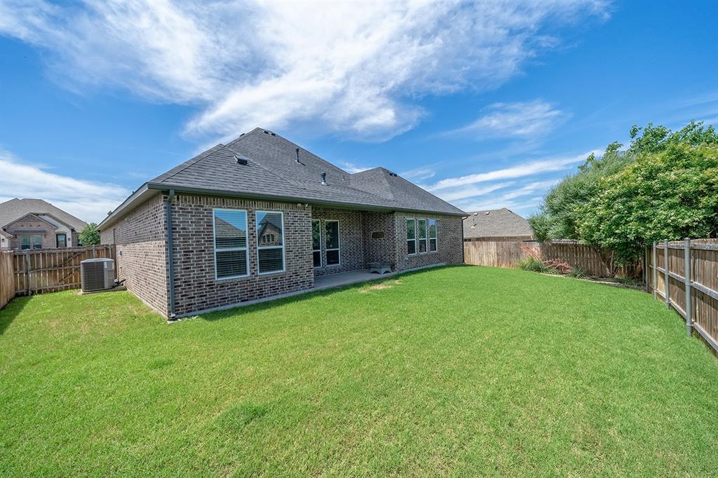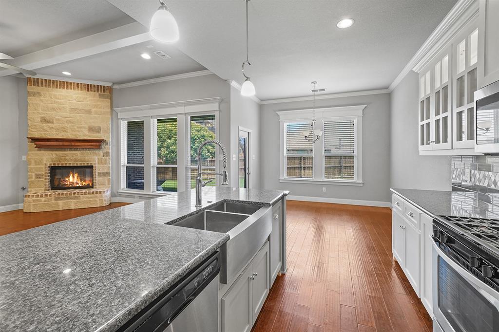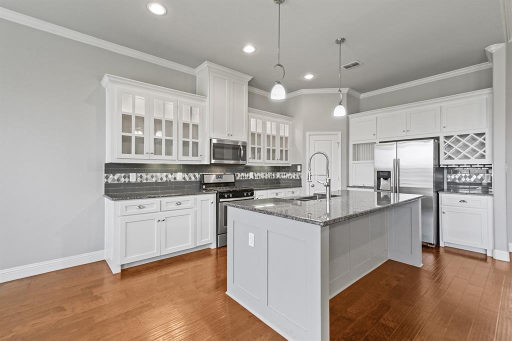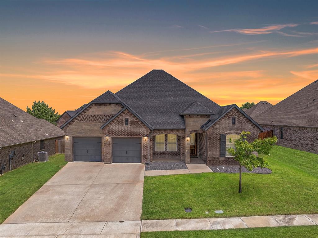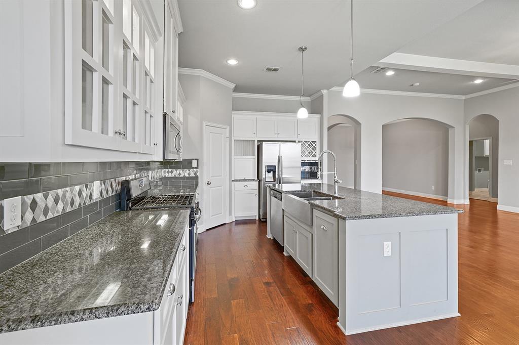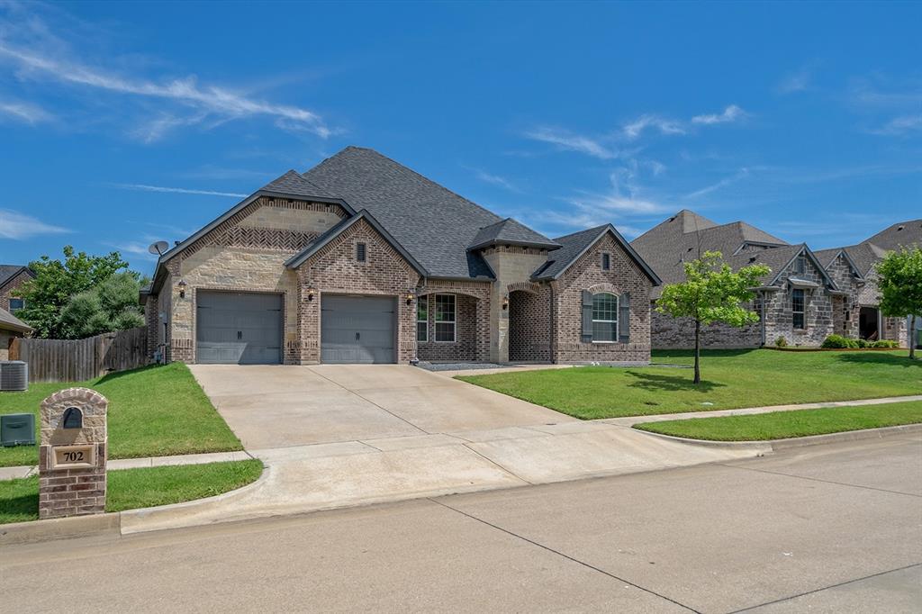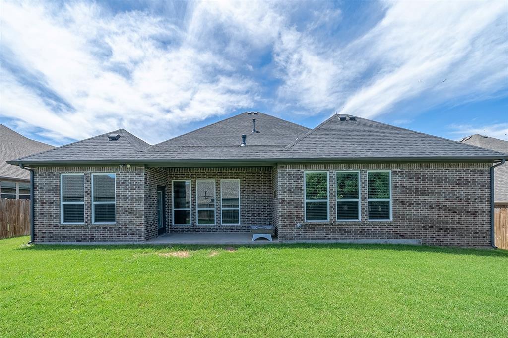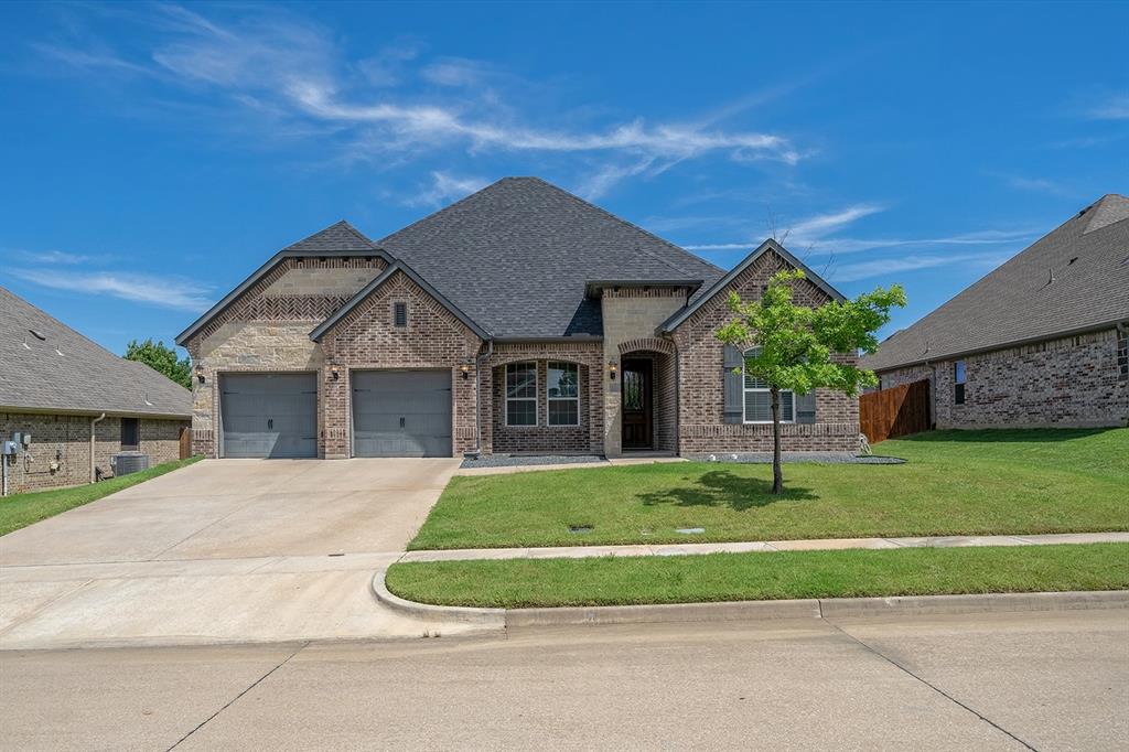 Welcome to your dream home, a beautifully custom-built residence that exudes elegance and functionality. Step inside to find engineered wood floors that flow seamlessly throughout the living room, hallways, office, dining room, kitchen, and breakfast area, creating a warm and inviting atmosphere.The heart of the home features a spacious open-concept design, where the full-size dining room effortlessly connects to the living room. Here, a stunning stone fireplace serves as a focal point, complemented by large windows that provide picturesque views of the backyard.The kitchen is a chef's delight, boasting custom shaker-style cabinets, granite countertops, a spacious working island with additional seating, a farmhouse sink, a custom tiled backsplash, and a dedicated wine rack. A small appliance garage keeps the space organized, while the adjoining breakfast area offers a cozy spot for morning meals.The master suite, tucked behind the living room for privacy, is generously sized and filled with natural light. It features separate vanities, dual walk-in closets, a luxurious soaking tub, and a beautifully tiled walk-in shower.Two additional bedrooms at the front of the house share a full bathroom, complete with granite countertops and a tiled shower combo, making it perfect for family or guests. A dedicated office space offers versatility, functioning as a playroom, second living room, or even an extra bedroom.Step outside to discover a covered back porch, ideal for outdoor entertaining, alongside a spacious backyard perfect for play or gardening. This custom home combines thoughtful design with high-quality finishes, making it a true sanctuary for modern living.Don’t miss the opportunity to make this exceptional property your own!