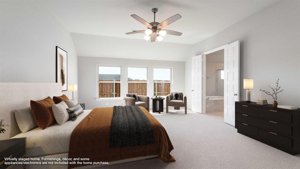 As you step off the front porch you are greeted by the open family room with a wood mantel fireplace and 10-foot ceiling. The dining area connects the living space with the kitchen which boasts an island with built-in seating, 5-burner gas cooktop and a corner walk-in pantry. A wall of windows embraces the covered side-yard patio. The primary bedroom features a wall of windows. The primary bathroom boasts dual vanities, a glass enclosed shower, garden tub and a dual walk-in closet. The secondary bedrooms are at the front of the home and each feature a walk-in closet and a shared bathroom. The utility room and mud room are off the rear two-car garage.
