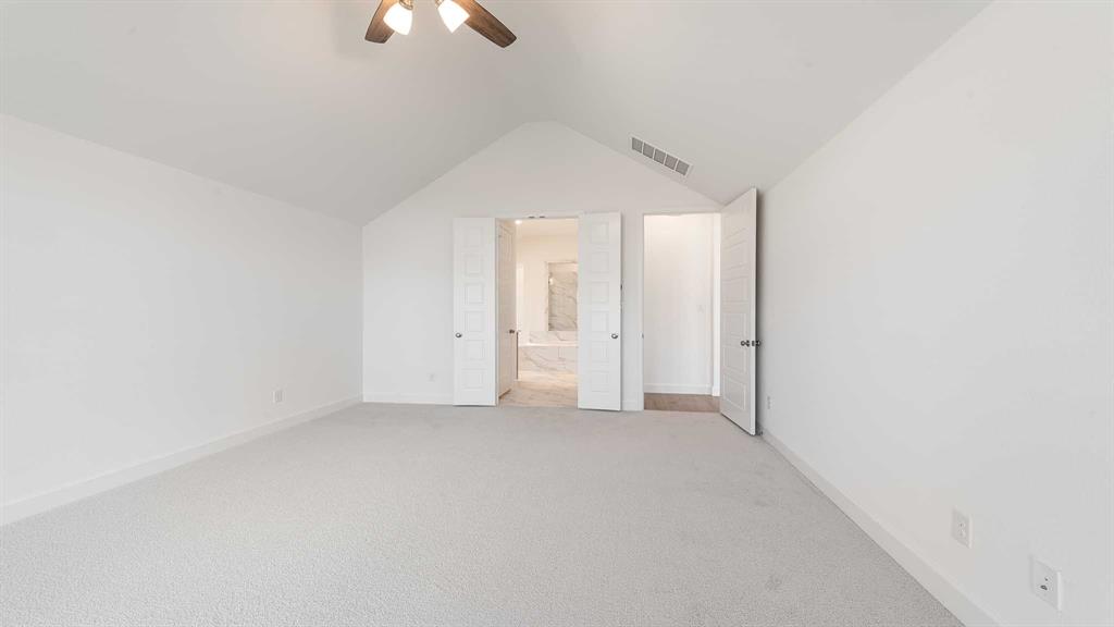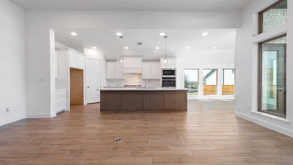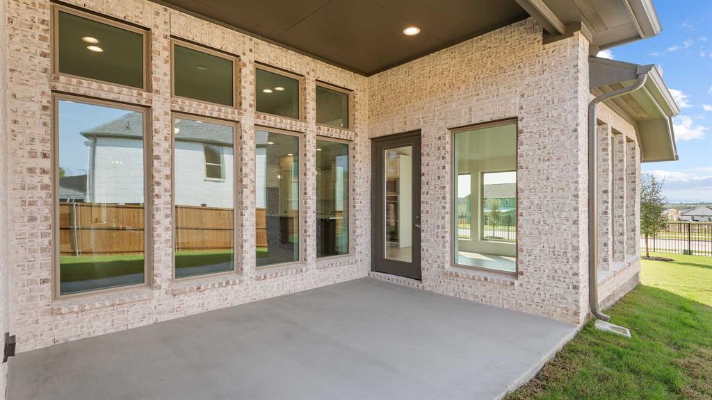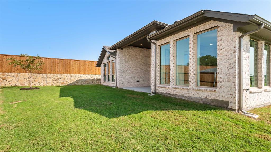 Home office with French doors set at entry with 12-foot ceiling. Coffered extended entry leads to open family room, kitchen and dining area. Family room features a wood mantel fireplace and wall of windows. Kitchen features corner walk-in pantry, 5-burner gas cooktop and generous island with built-in seating space. Primary bedroom highlights 12-foot ceiling and wall of windows. Double doors lead to primary bath with dual vanities, garden tub and separate glass-enclosed shower with separate walk-in closets. A guest suite with private bath adds to this one-story design. Covered backyard patio. Mud room off two-car garage.