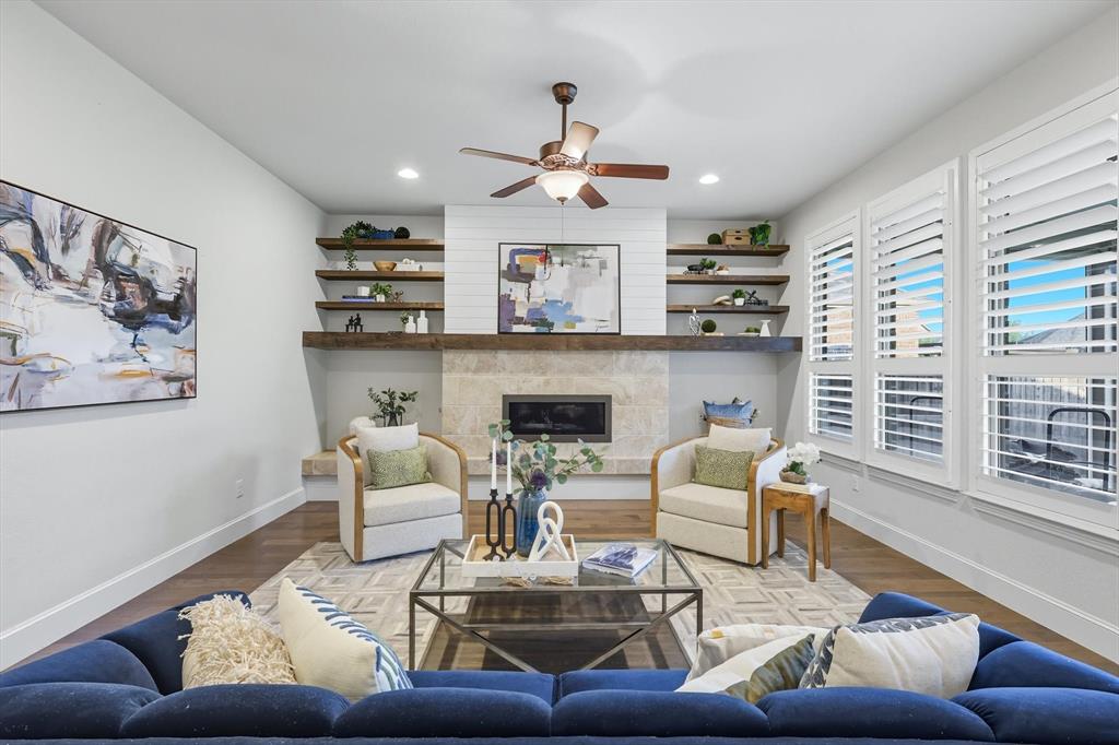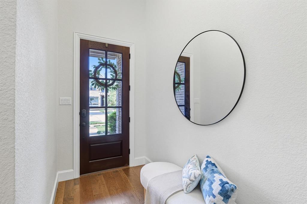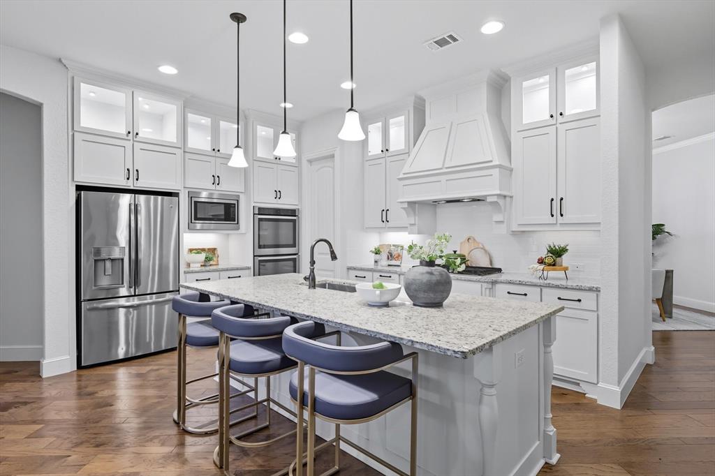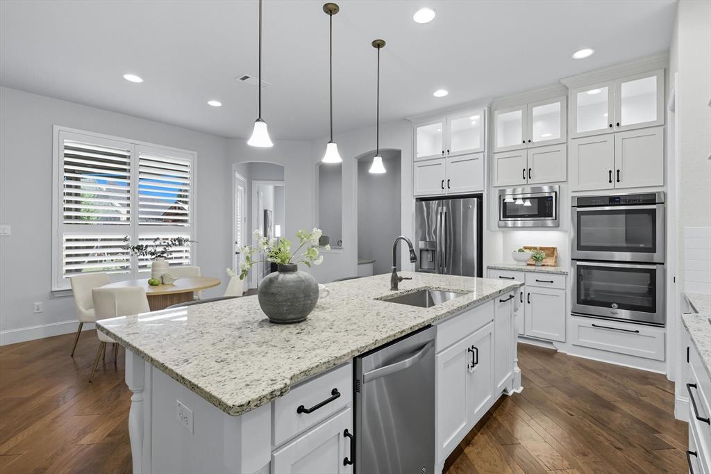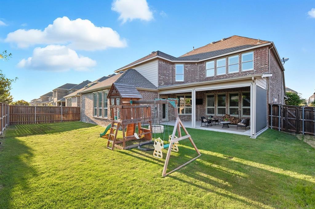 Discover the captivating charm of this home at 11171 Progreso Street, Frisco, TX, where elegance seamlessly blends with functionality. From the moment you enter, the open floor plan and welcoming atmosphere will enchant you. As you step inside this north facing residence, you are greeted by high ceilings and exquisite wood floors that enhance the spacious and luxurious feel of the home. All carpet throughout the home has been recently replaced with fresh, new carpeting, adding comfort and a move-in ready touch. At the heart of the residence lies the kitchen, perfectly outfitted for entertaining with double ovens, a large island, and stylish large cabinets with under lighting. This culinary haven flows effortlessly into the living room, creating an ideal space for hosting guests or enjoying cozy evenings by the fireplace. A versatile flex space adjacent to the kitchen offers the perfect spot for a home office.