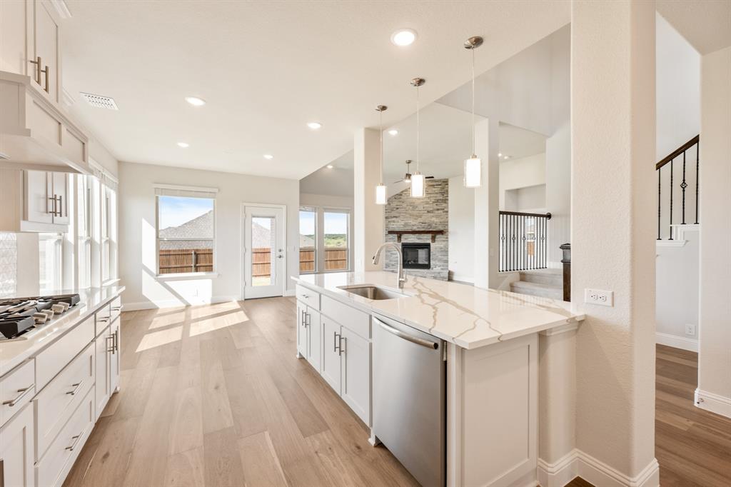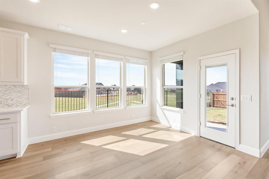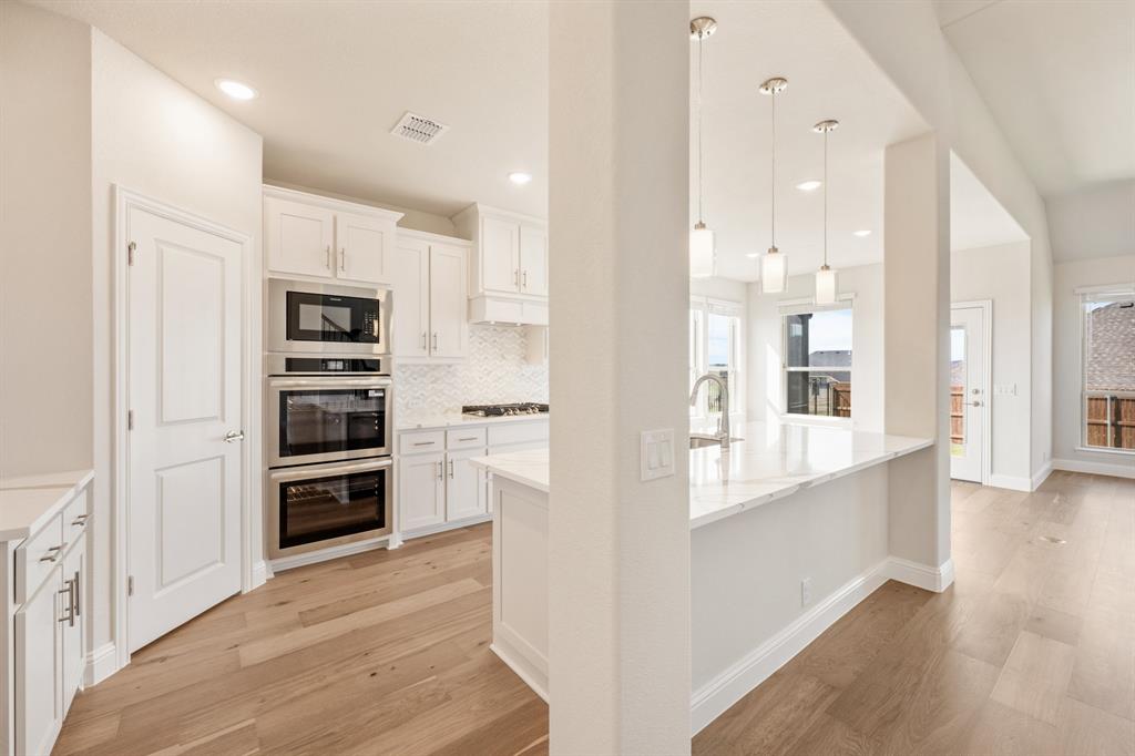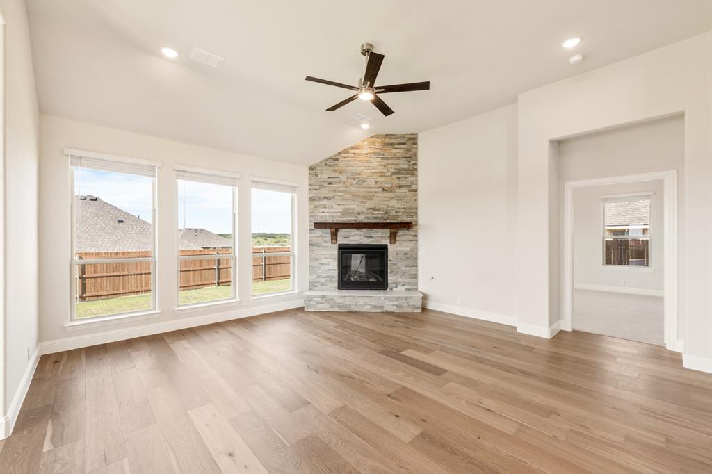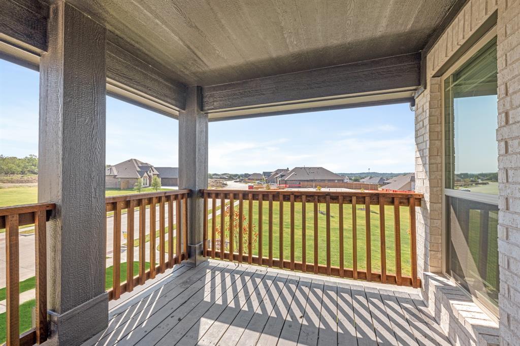 Outdoor living includes a covered patio with gas drop for grilling, a backyard siding to a greenbelt park, 6 ft stained wood fencing with metal posts, 2 gates and wrought iron fencing along the view. Home also includes 2” faux wood blinds, full gutters, front yard landscaping and fully sodded yard with sprinkler system. Located in a highly desirable community with wonderful social activities, swimming pool, playgrounds, walking trails and top-rated Joshua ISD schools. Our Brand-New, on-site elementary school is now under construction!!