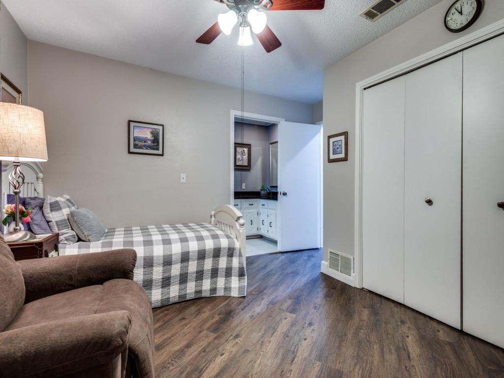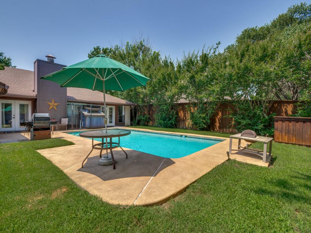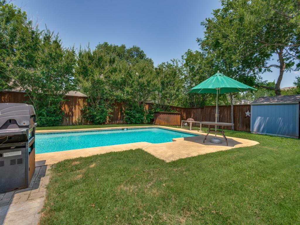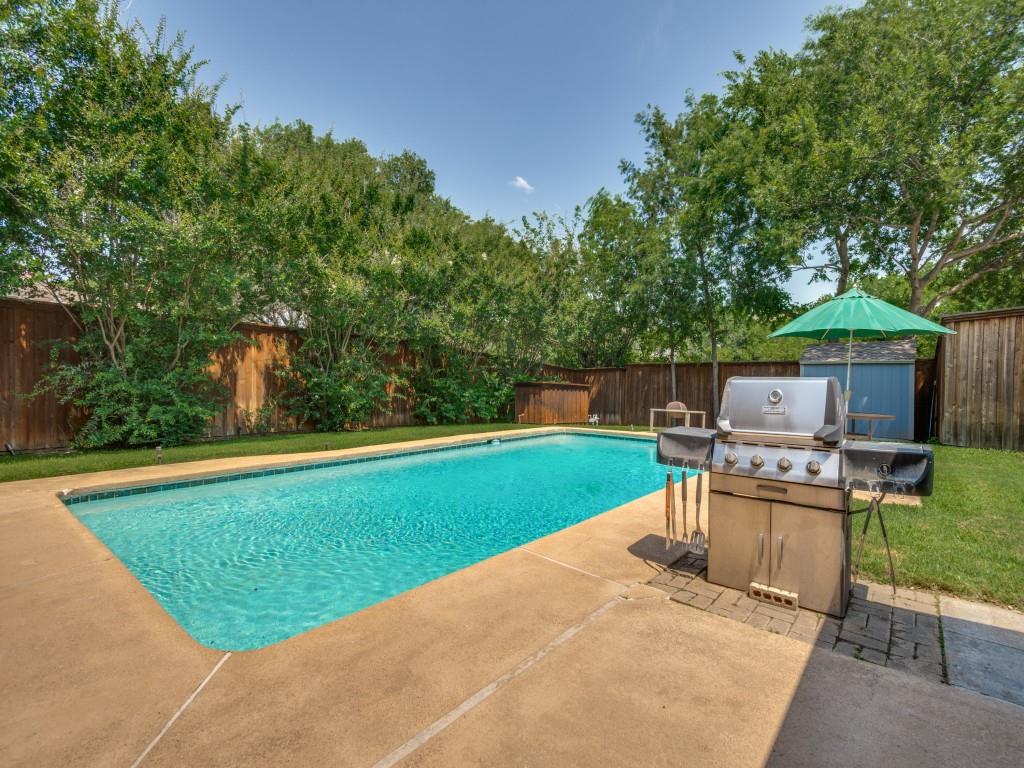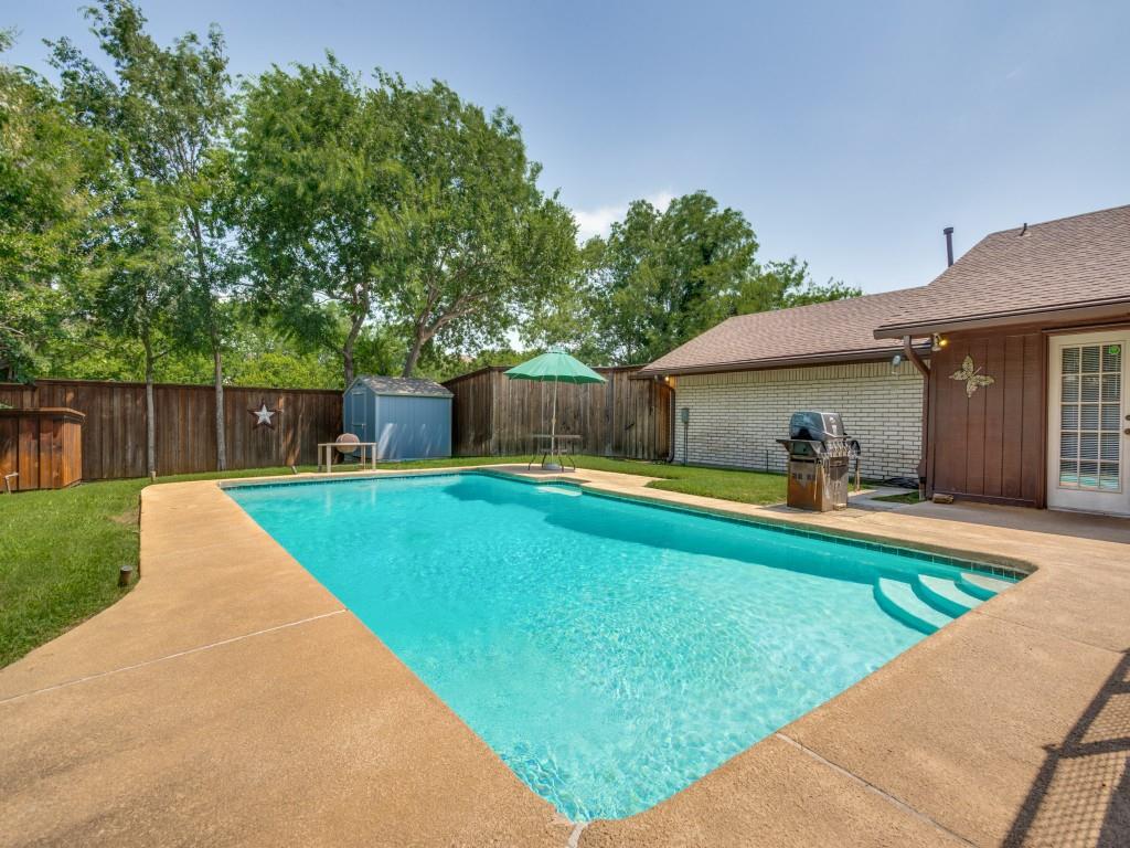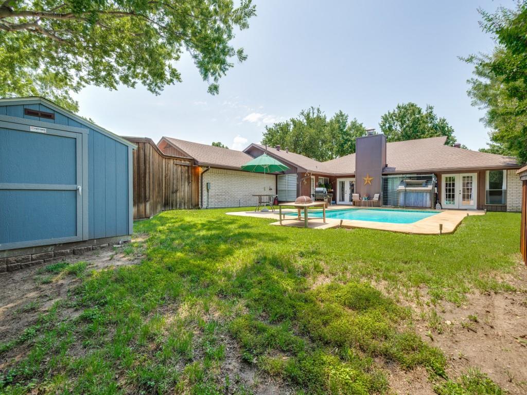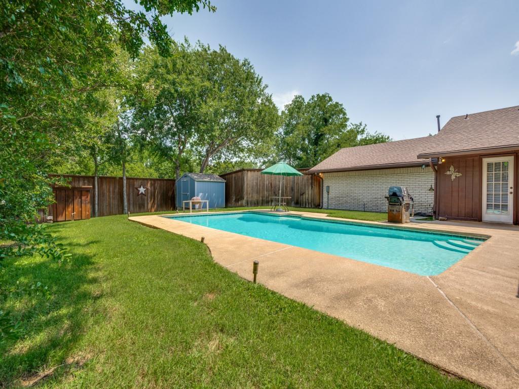 Discover this family retreat in the heart of Lewisville. Spacious home with split bedrooms and a unique floor plan. You'll be greeted by an inviting atmosphere that flows through the one-story home featuring 4 generous bedrooms and 3 appointed bathrooms, providing ample space for relaxation and comfort. The backyard is a true highlight and very private with an over sized lot (.370) and 8 foot fence. Imagine warm sunny days spent splashing in the pool, hosting barbecues, or simply unwinding in your tranquil outdoor space. For pet lovers, this home comes equipped with a large dog house featuring air conditioning, ensuring your furry friends stay comfortable year-round. Additionally, there's a convenient storage building to keep your outdoor belongings organized. Located in a friendly neighborhood, this home is designed with families in mind, offering comfort, space and a sense of community, near The Shops at Highland Village, Lewisville High School, I-35 and all kinds of shopping!