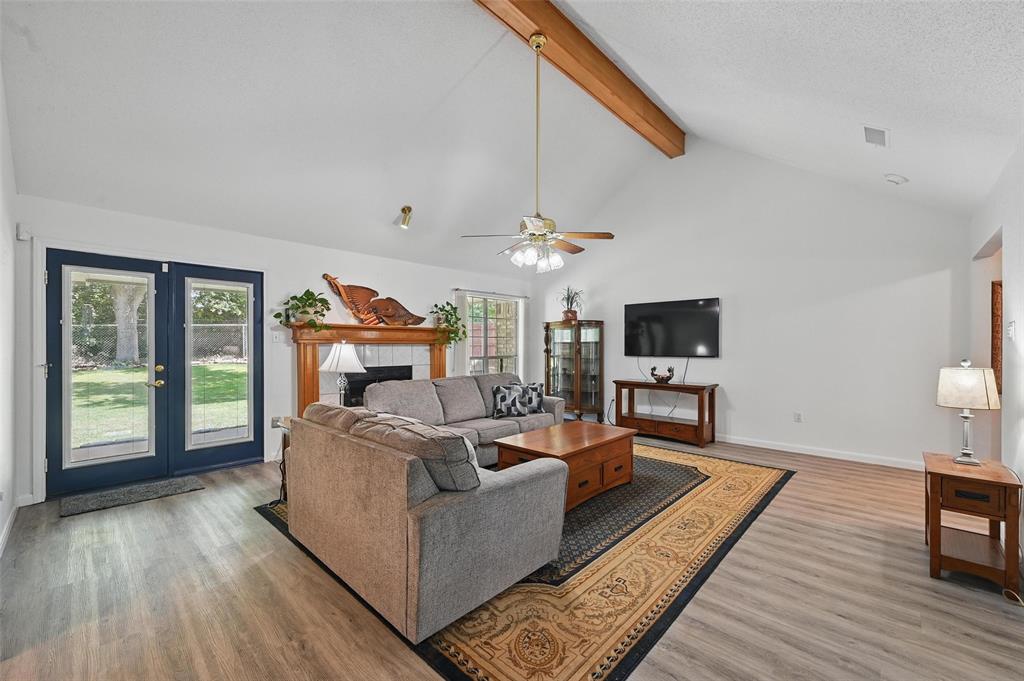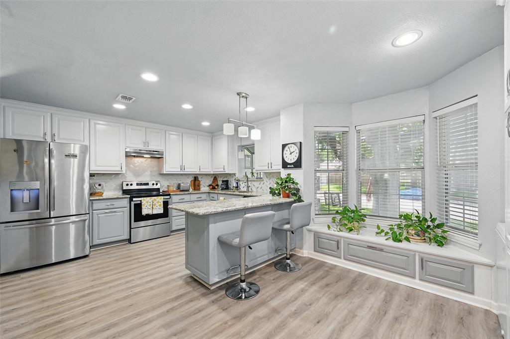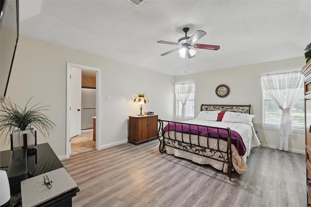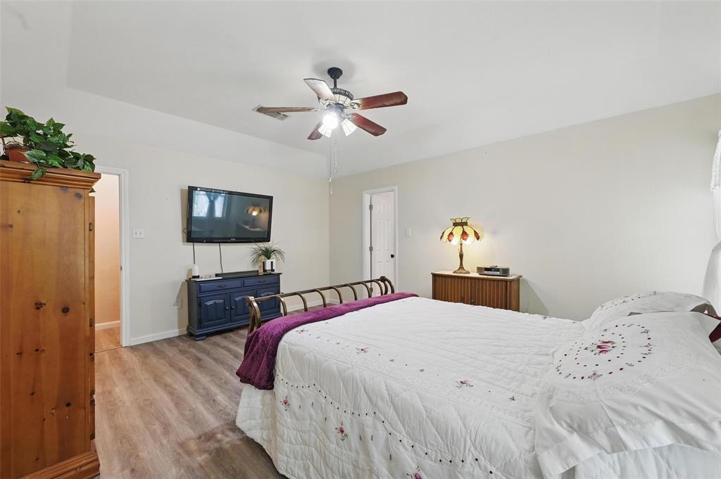 Recent updates have elevated the home's appeal, with fresh paint throughout and new wood-look laminate and tile flooring. The kitchen showcases custom cabinetry, while the primary suite offers a remodeled shower, dual walk-in closets, and a dual vanity for added comfort. Additionally, the home benefits from a durable 30-year roof, installed just eight years ago.