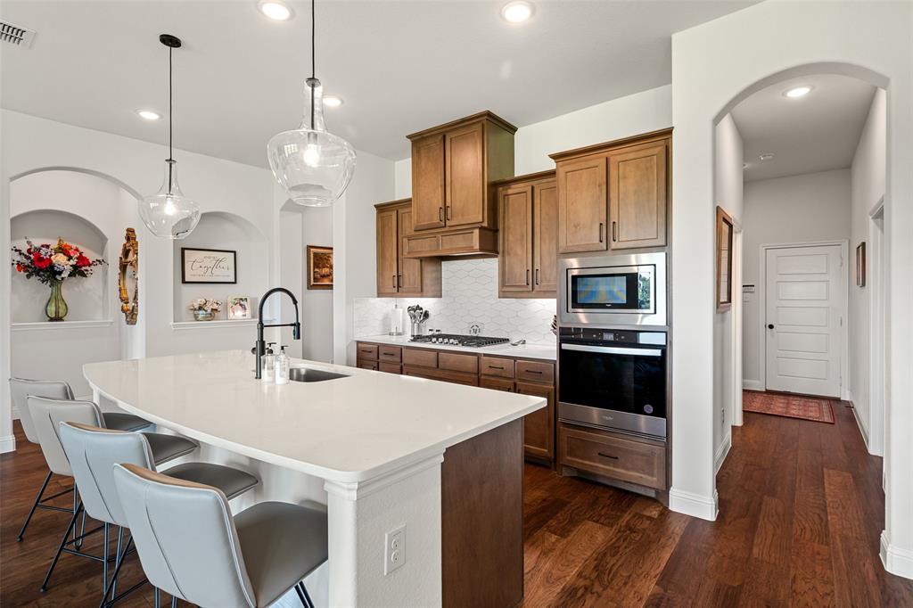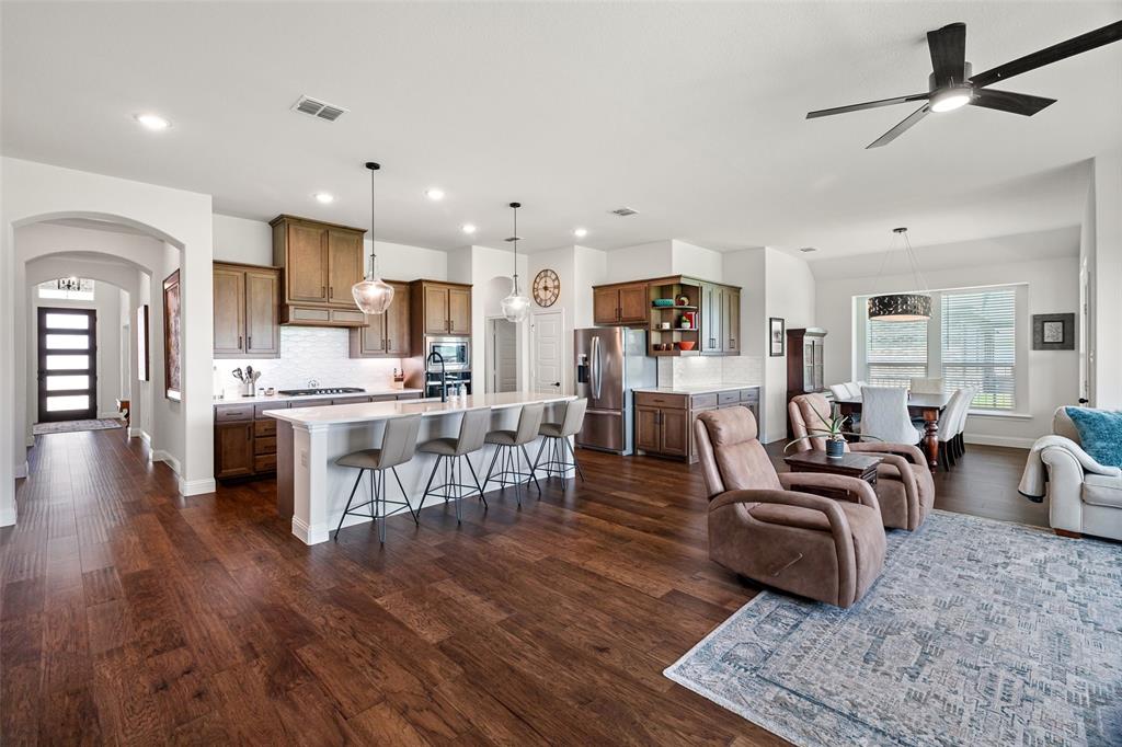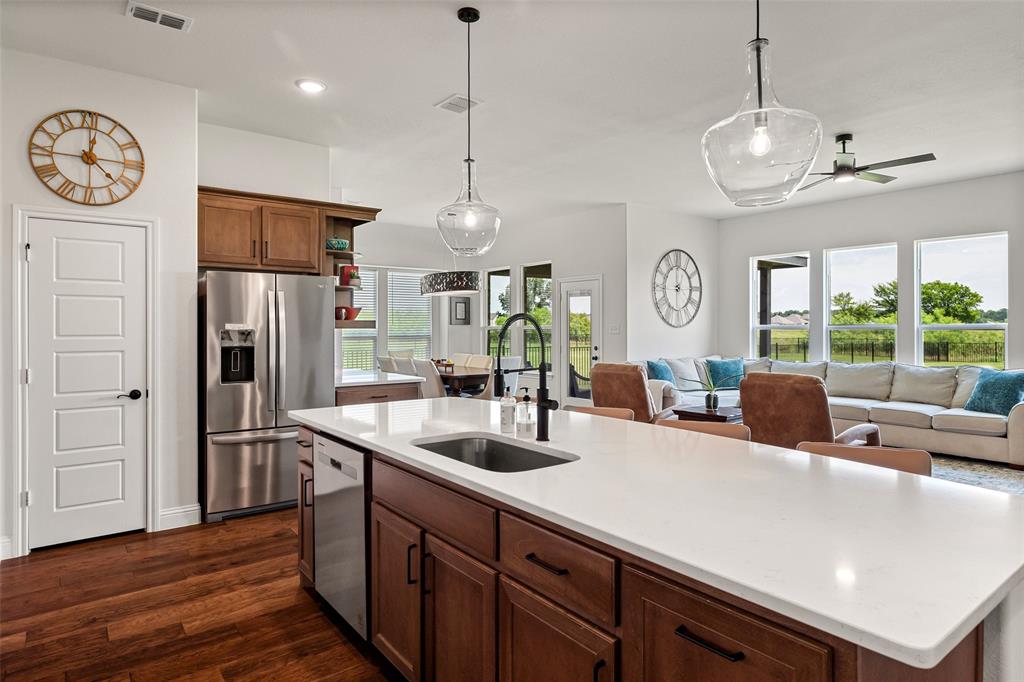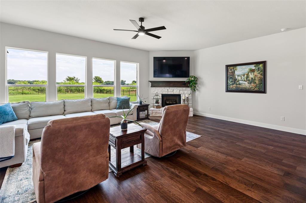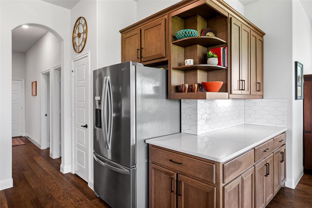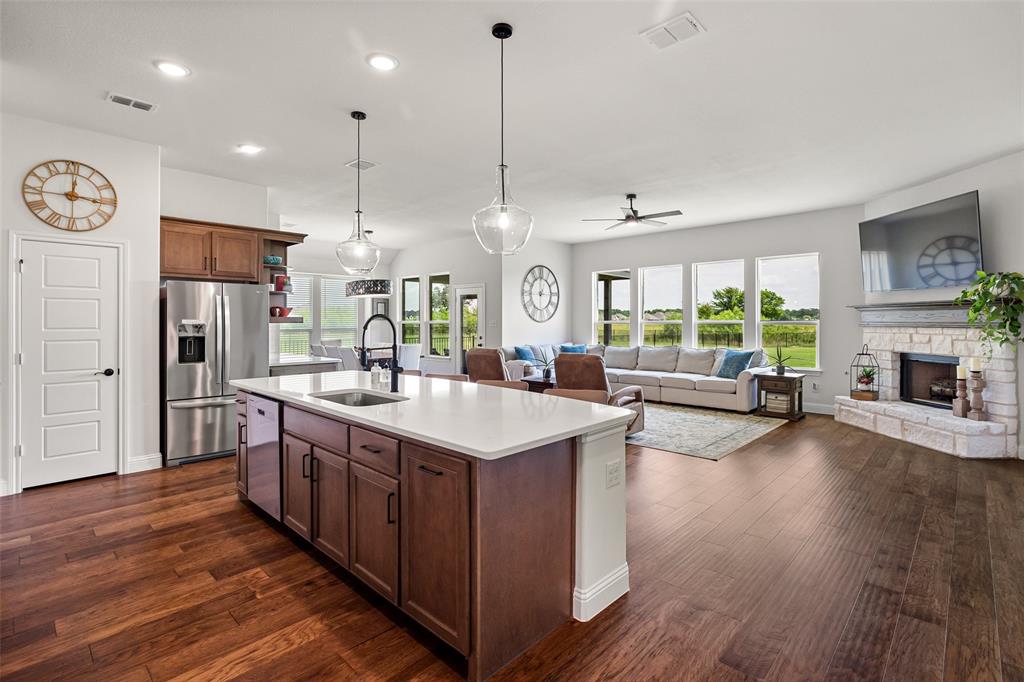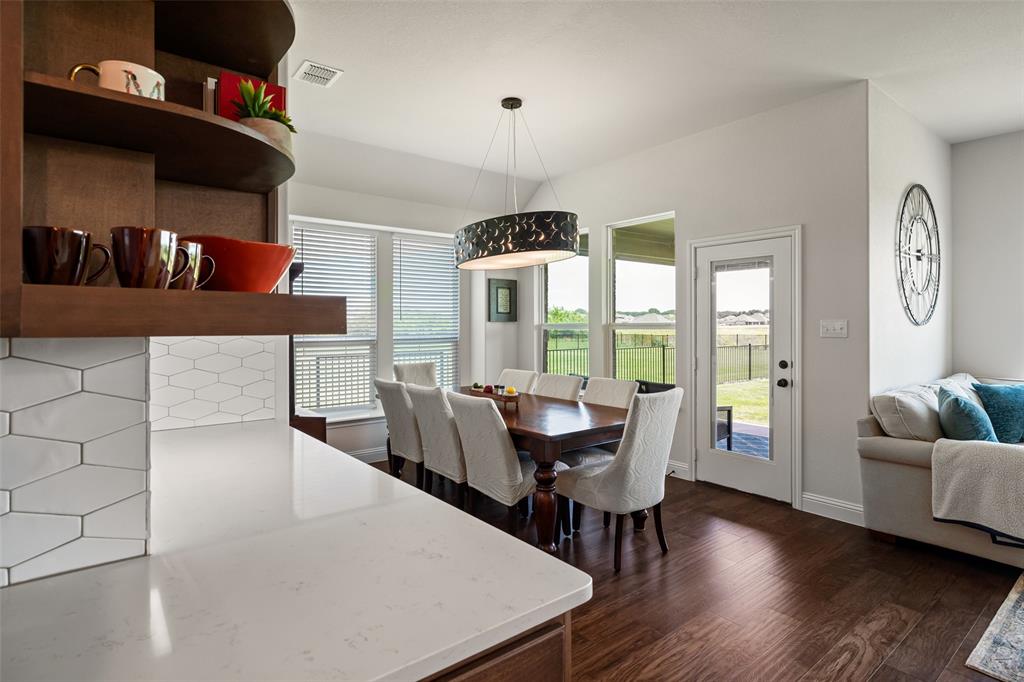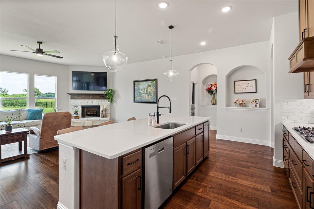 Located in the community of Abe’s Landing, this well maintained all-brick home offers 3 beds, 2.5 baths and multiple living spaces designed to fit your lifestyle. A dedicated office can serve as a fourth bedroom, while the formal dining room - currently used as an additional living area - provides flexibility for gatherings, hobbies or quiet relaxation. When you arrive, you’ll be greeted by curb appeal - mature shade tree, manicured flower beds and a welcoming front porch seating area. Inside, tall ceilings, large windows and a blend of engineered hardwood and tile create an airy, light-filled environment with no carpet to maintain. The oversized living room centers around a wood-burning fireplace with gas starter, while the kitchen serves as the heart of the home - complete with a generous island seating four, a five-burner gas cooktop, built-in coffee or beverage nook, hidden trash storage and a sunny breakfast area. A guest powder bath is conveniently located near the main living areas and each bedroom offers ceiling fans and large closets. The second bath features dual sinks with a separate toilet and shower room - perfect for busy households. In the master suite, enjoy tall ceilings, abundant natural light and a spa-inspired bath with separate vanities, soaking tub, walk-in shower, framed mirrors and a spacious walk-in closet. A large utility room with washer and dryer hookups, folding space and hanging storage keeps life organized. Outdoors, the fully fenced backyard and large covered patio are ideal for entertaining and unwinding - made even better by the privacy of no rear neighbors. Abe’s Landing offers community amenities including a neighborhood pool while being just minutes from Lake Granbury, the historic downtown square and local shopping and dining. Whether your days are filled with boating, theater nights at the Opera House, or simply enjoying the quiet beauty of home, this property offers the perfect balance of comfort, convenience and community.