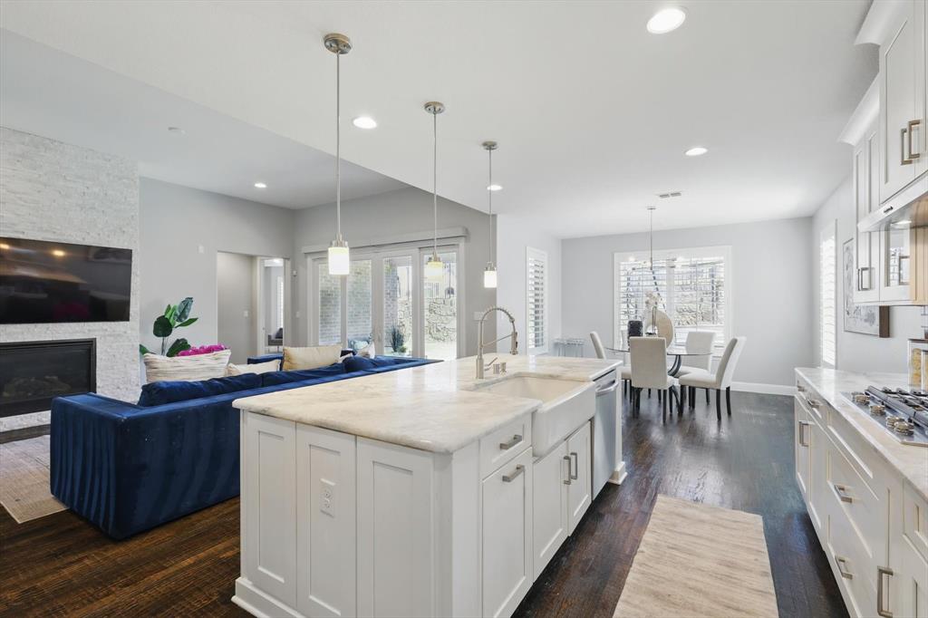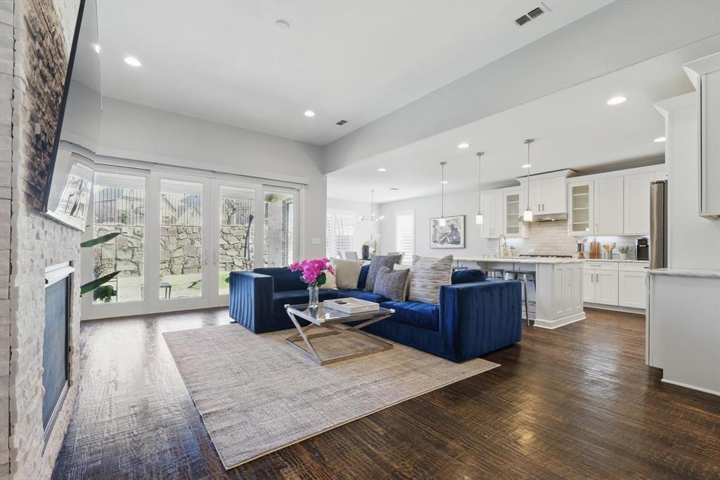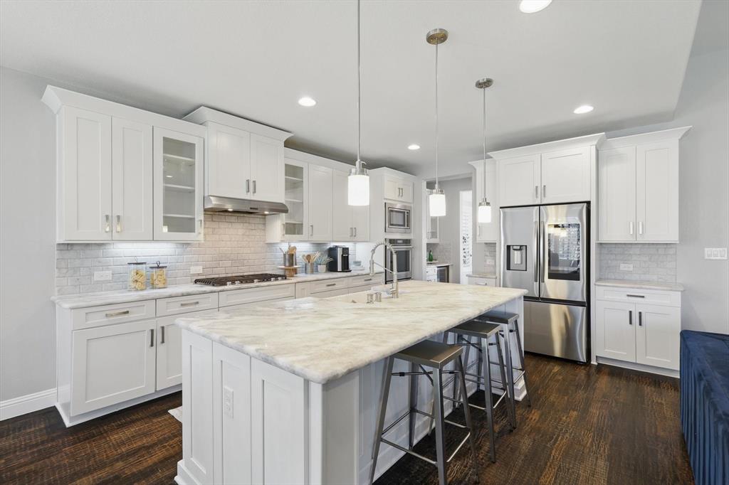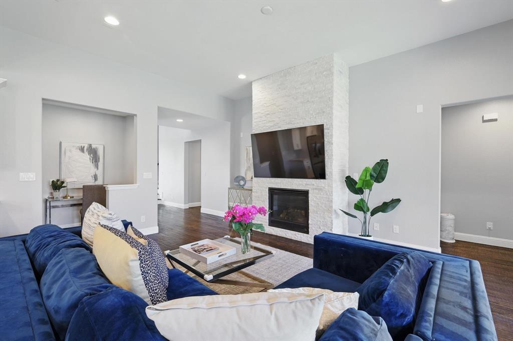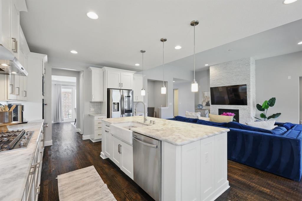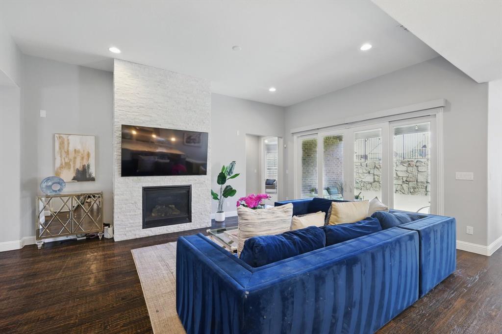 Stunning best selling 5 bedroom model plan backing to green belt in the heart of Austin Waters! Entertainer's dream! Wide open design with TWO outdoor living spaces anchored with 3 sets of custom slider doors! Tons of natural light! Huge gourmet kitchen with WHITE cabinetry, farmers sink, quartzite counters & spacious eat-in island. Primary with bay window, study plus guest bedroom featuring an ensuite spacious bath with walk in shower downstairs. Huge game-flex space, pocket office & 3 huge bedrooms upstairs. High-end transitional finishes include: extensive wood flooring on first floor plus staircase, designer lighting, new paint & carpet, gorgeous fireplace and custom plantation shutters. Incredible energy efficiency with foam encapsulation! Gorgeous home! A must see!