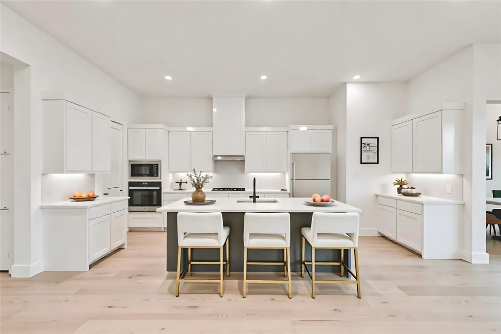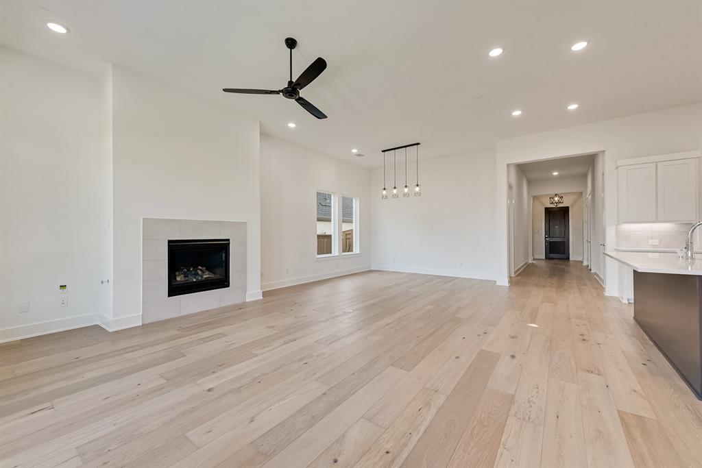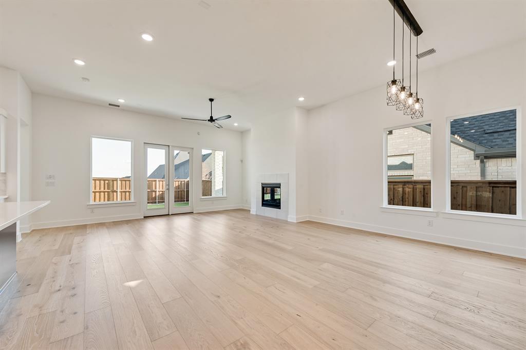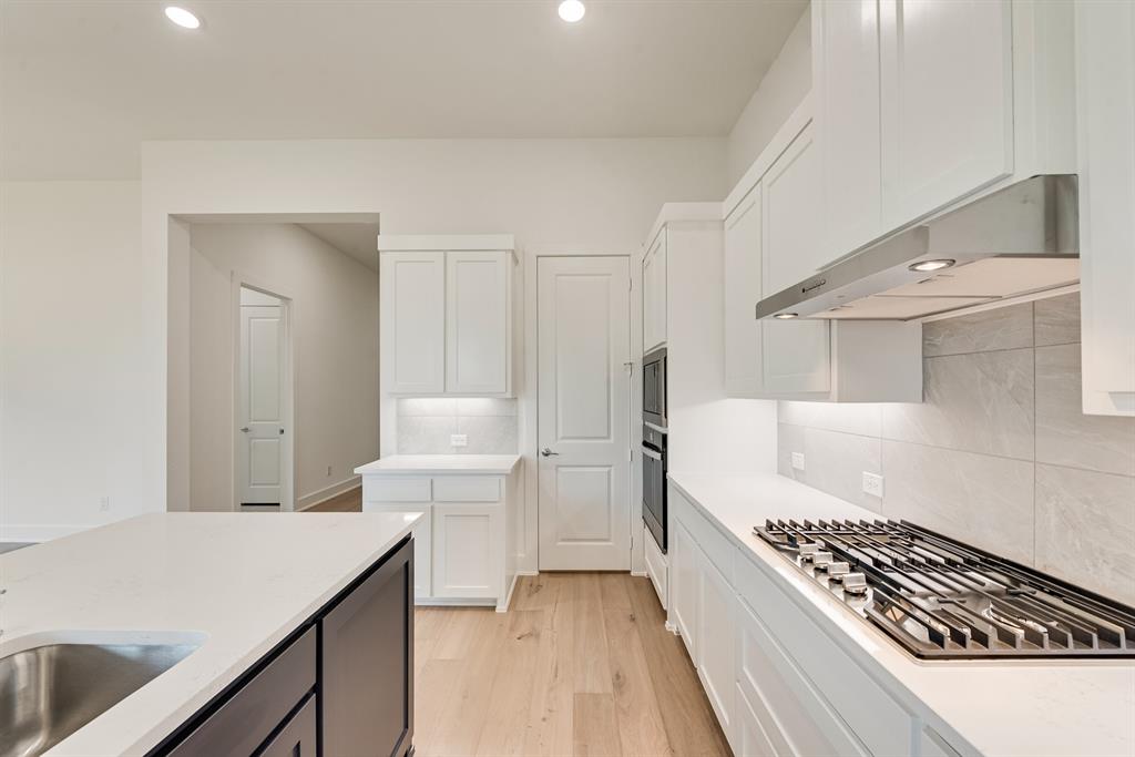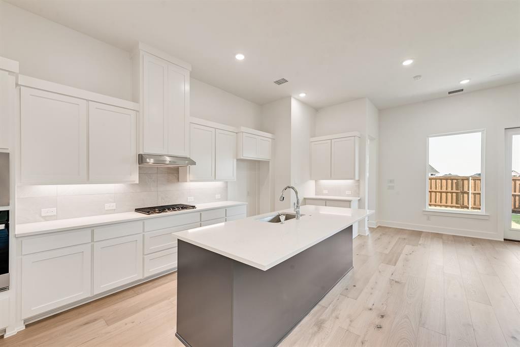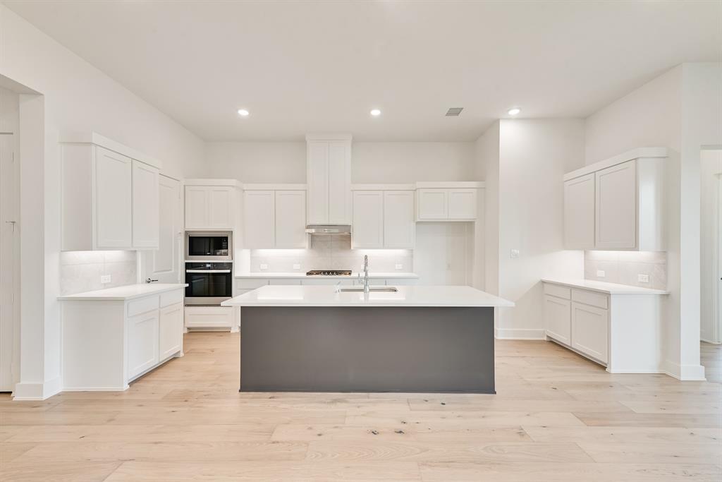 Rare One-Story 4-Bedroom Quick Move-In Opportunity – Barton Plan Impressive white brick exterior with dark trim. Warm wood flooring in the main living areas and light, bright neutral colors. The kitchen features white cabinets, quartz countertops, and a navy accent-color island. Upgraded tile and carpet throughout. Surround sound pre-wiring in the family room and two camera pre-wire locations. Boutique, hilly community with low HOA dues!