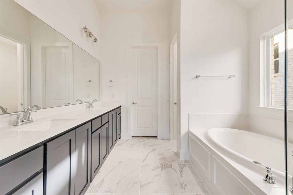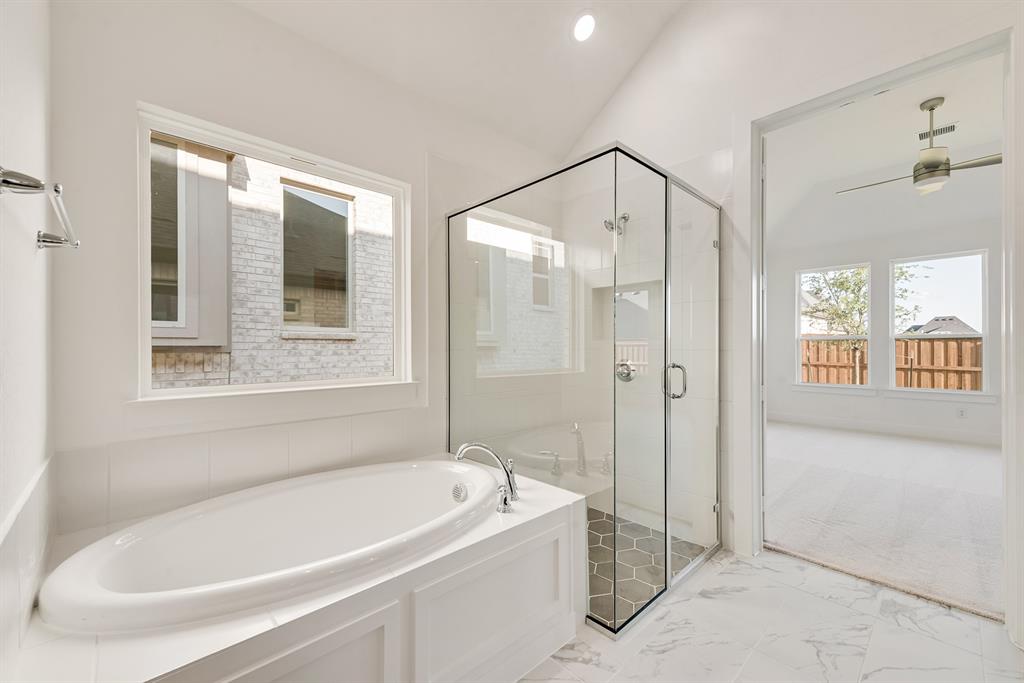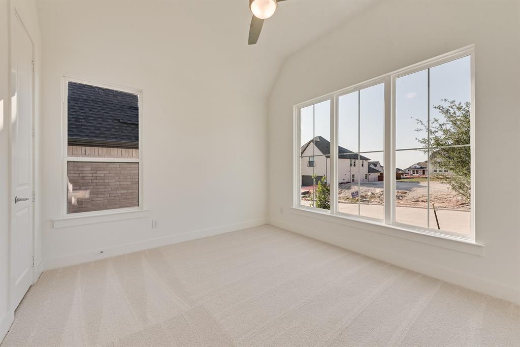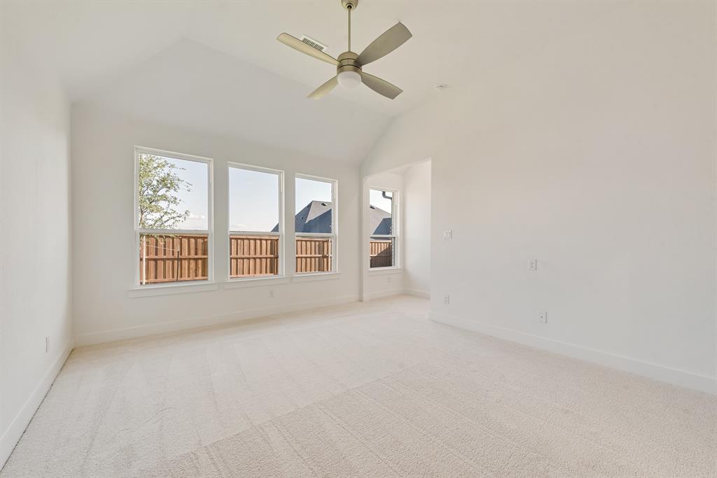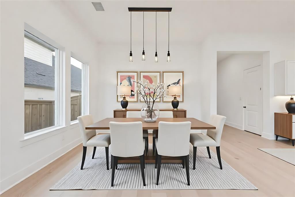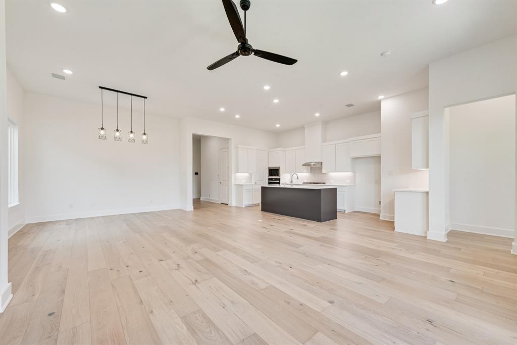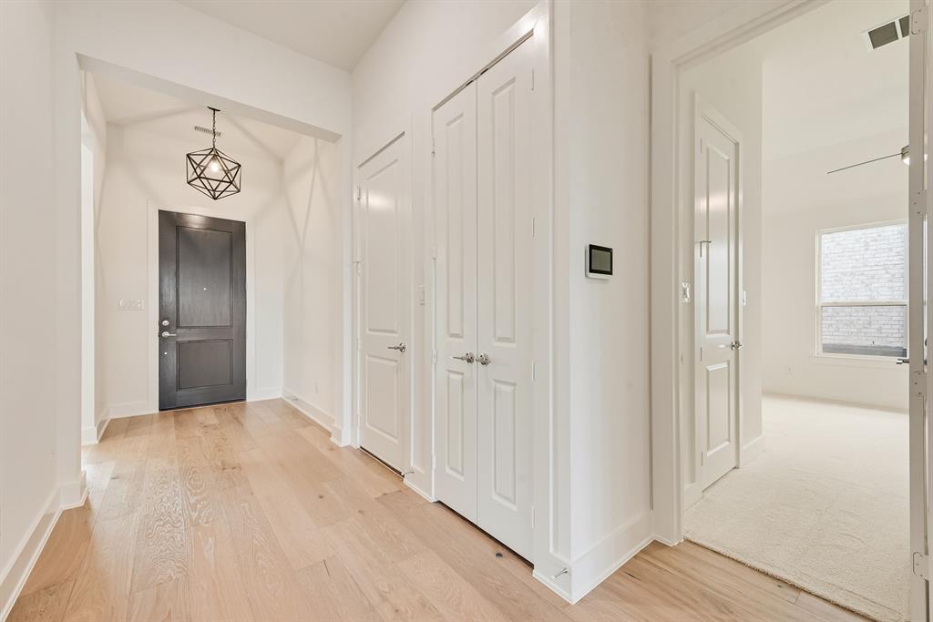 Rare One-Story 4-Bedroom Quick Move-In Opportunity – Barton Plan Impressive white brick exterior with dark trim. Warm wood flooring in the main living areas and light, bright neutral colors. The kitchen features white cabinets, quartz countertops, and a navy accent-color island. Upgraded tile and carpet throughout. Surround sound pre-wiring in the family room and two camera pre-wire locations. Boutique, hilly community with low HOA dues!