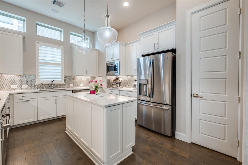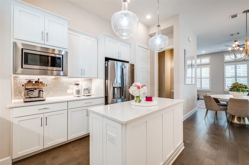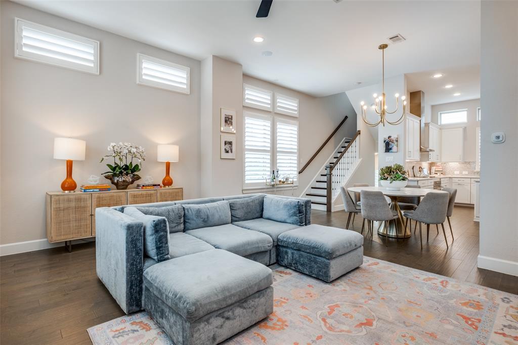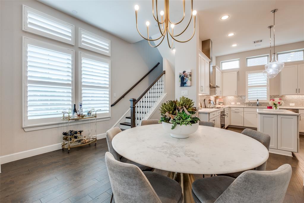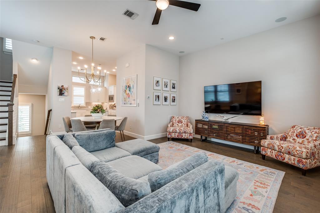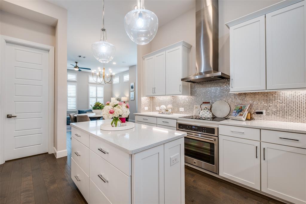 Seller is offering a 2% credit toward closing costs or an interest rate buy down! This multi-level townhome sits on a desirable corner lot and offers exceptional private outdoor space—including a fenced front yard, side yard, and a rooftop deck with panoramic views of downtown Dallas. Thoughtfully designed and well maintained, the home features wood floors throughout, 4-inch hidden tilt wood shutters and custom lighting. The kitchen is both functional and stylish, with quartz countertops, stainless steel appliances, and modern fixtures. An adjacent dining area, oversized living room with soaring ceilings, and a sleek powder bath make the second floor ideal for entertaining. The primary suite includes a spacious walk-in closet and a spa-like bathroom with dual vanities and a large shower. Two additional bedrooms each have private ensuite baths, offering comfort and privacy for family or guests. Conveniently located near Love Field, and Dallas’ top dining and entertainment districts!