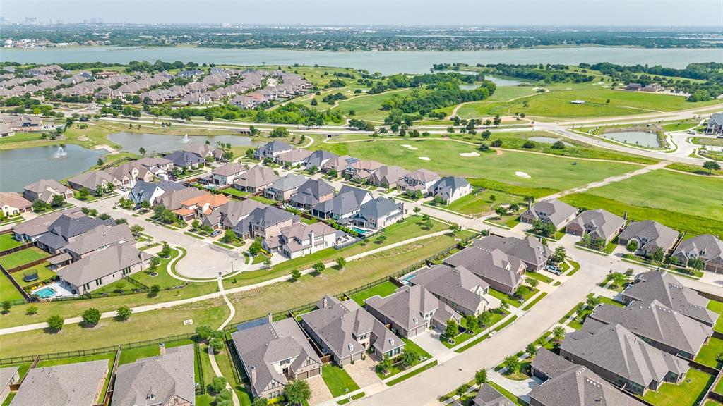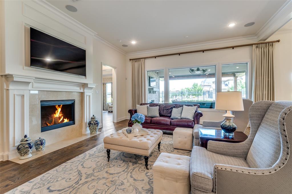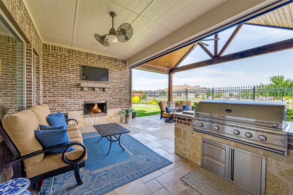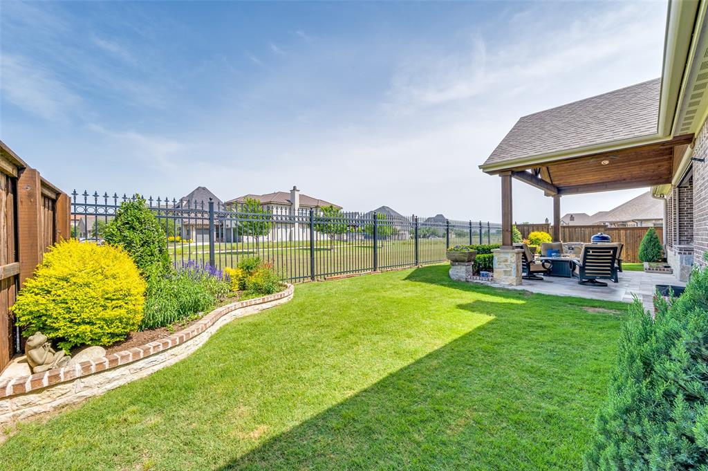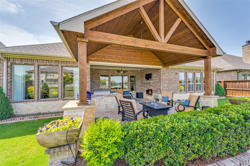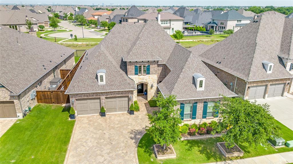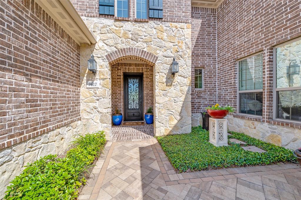Welcome to 7617 Windsor, a stunning single-story home located in prestigious Waterford Point Village of The Tribute—a resort-style, lakeside, and golf community in the heart of North Dallas. Situated on an oversized lot with no rear neighbors, this home backs to scenic green space and miles of trails, offering privacy and peaceful views of nearby Lake Lewisville. Luxury is evident from the moment you arrive, with brick and stone elevation, stone-paved driveway, lush landscaping, and wrought iron front door that sets the tone. Inside, a bright, airy entry welcomes you with wide plank wood floors, crown molding, upgraded lighting, and custom woodwork that continues throughout the home. The chef’s kitchen is both stylish and functional with an oversized island, granite countertops, and stainless steel appliances including gas cooktop, double oven, built-in microwave, and refrigerator. Floor-to-ceiling custom cabinetry with glass-front uppers, under-cabinet lighting, and decorative pendant lights complete this impressive space. Primary suite is a serene retreat featuring rich wood floors, tray ceiling with chandelier, and wall of windows overlooking the backyard. Spa-like bath includes dual granite vanities, framed mirrors, a dedicated makeup area, and elegant lighting. All secondary bedrooms offer plush carpet, oversized walk-in closets, and ensuite baths. Outdoor living is a highlight with extended covered patio featuring vaulted wood-paneled ceiling, cedar beams, remote screen, stone fireplace, mounted TV, built-in grill, and prep station. Custom stone island is ready for your smoker, making this a perfect space for entertaining year-round. This home offers unmatched attention to detail, premium finishes, and access to exclusive amenities—fitness center, infinity pool, clubhouse, and events—making it a true standout in The Tribute. Don’t miss your opportunity to own this one-of-a-kind home, thoughtfully upgraded with luxury, comfort, and lifestyle in mind.