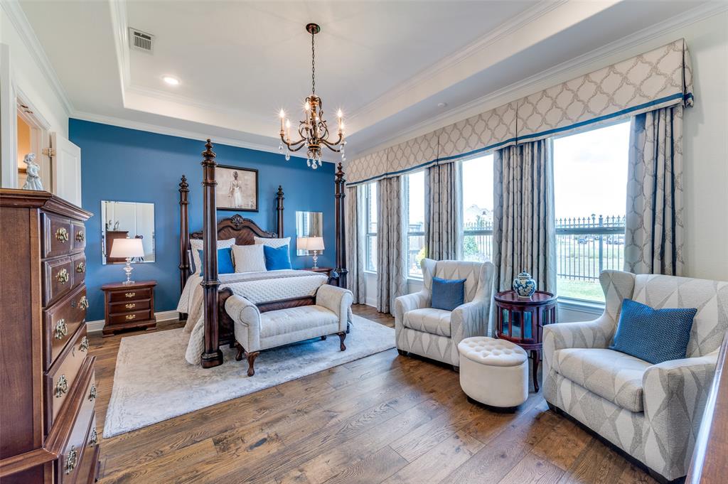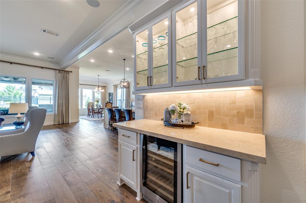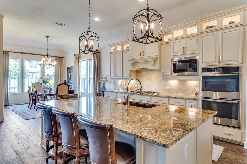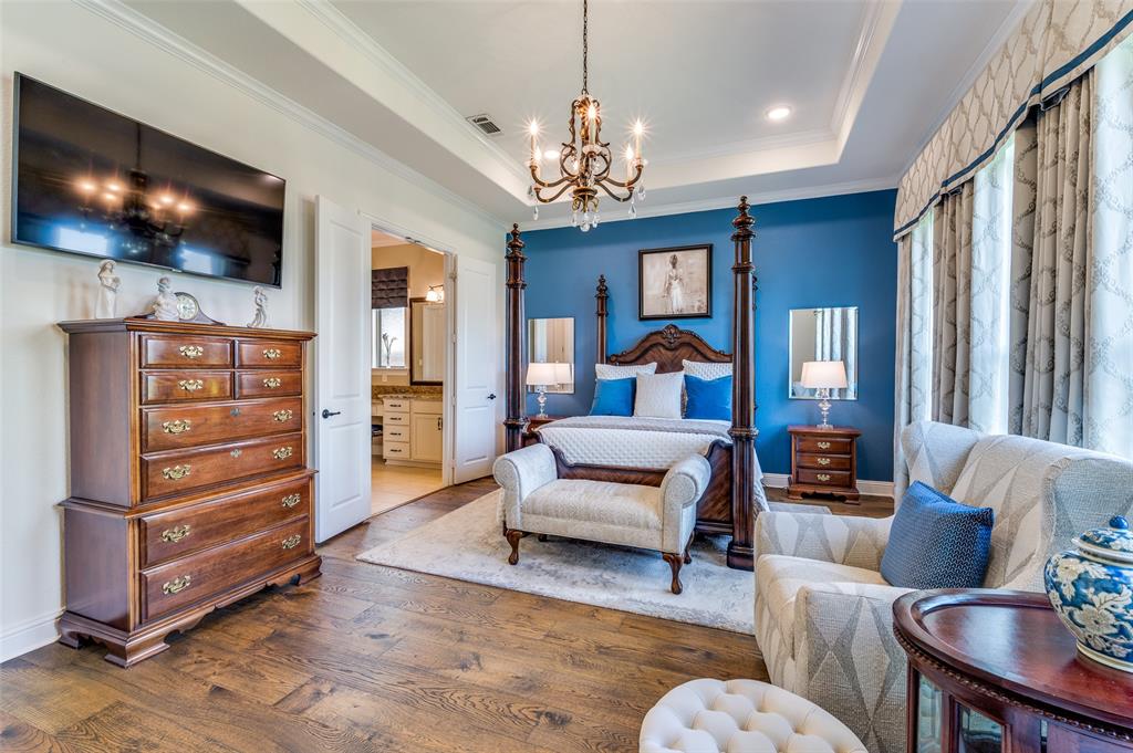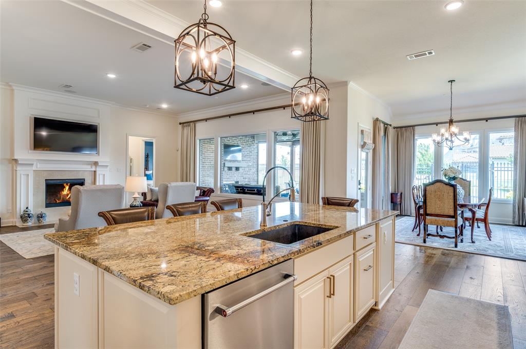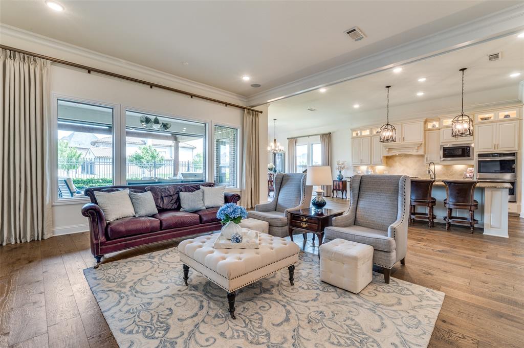 Welcome to 7617 Windsor, a stunning single-story home located in prestigious Waterford Point Village of The Tribute—a resort-style, lakeside, and golf community in the heart of North Dallas. Situated on an oversized lot with no rear neighbors, this home backs to scenic green space and miles of trails, offering privacy and peaceful views of nearby Lake Lewisville. Luxury is evident from the moment you arrive, with brick and stone elevation, stone-paved driveway, lush landscaping, and wrought iron front door that sets the tone. Inside, a bright, airy entry welcomes you with wide plank wood floors, crown molding, upgraded lighting, and custom woodwork that continues throughout the home. The chef’s kitchen is both stylish and functional with an oversized island, granite countertops, and stainless steel appliances including gas cooktop, double oven, built-in microwave, and refrigerator. Floor-to-ceiling custom cabinetry with glass-front uppers, under-cabinet lighting, and decorative pendant lights complete this impressive space. Primary suite is a serene retreat featuring rich wood floors, tray ceiling with chandelier, and wall of windows overlooking the backyard. Spa-like bath includes dual granite vanities, framed mirrors, a dedicated makeup area, and elegant lighting. All secondary bedrooms offer plush carpet, oversized walk-in closets, and ensuite baths. Outdoor living is a highlight with extended covered patio featuring vaulted wood-paneled ceiling, cedar beams, remote screen, stone fireplace, mounted TV, built-in grill, and prep station. Custom stone island is ready for your smoker, making this a perfect space for entertaining year-round. This home offers unmatched attention to detail, premium finishes, and access to exclusive amenities—fitness center, infinity pool, clubhouse, and events—making it a true standout in The Tribute. Don’t miss your opportunity to own this one-of-a-kind home, thoughtfully upgraded with luxury, comfort, and lifestyle in mind.