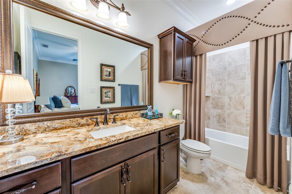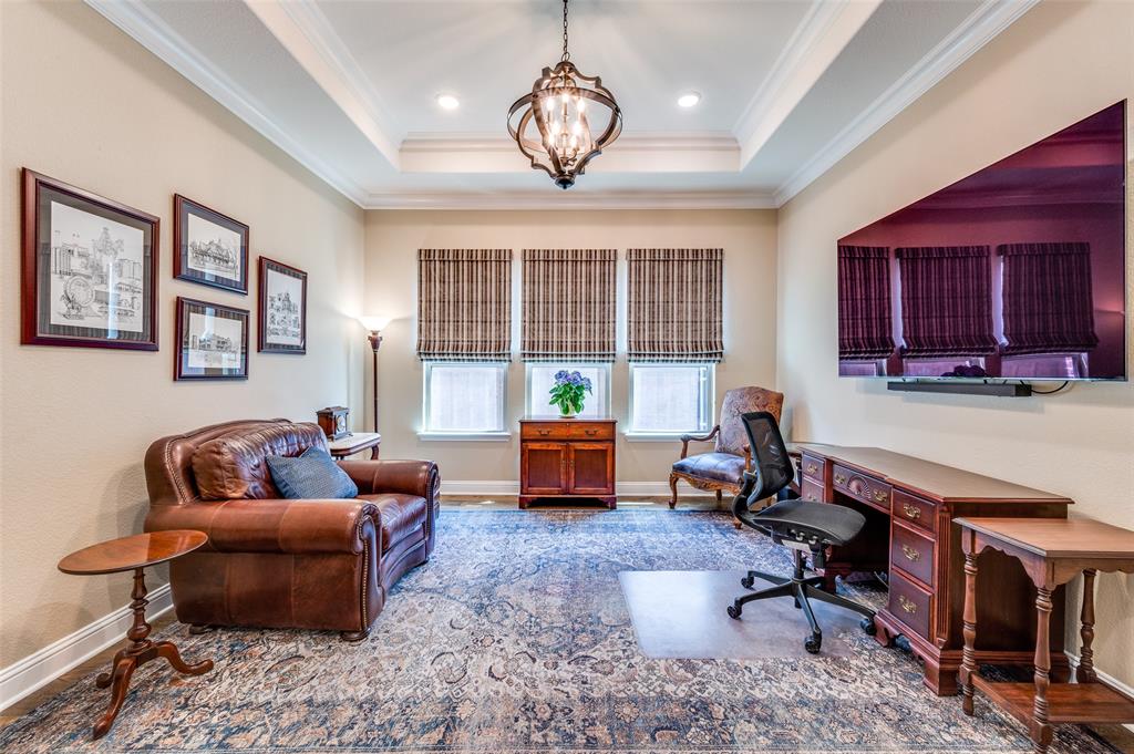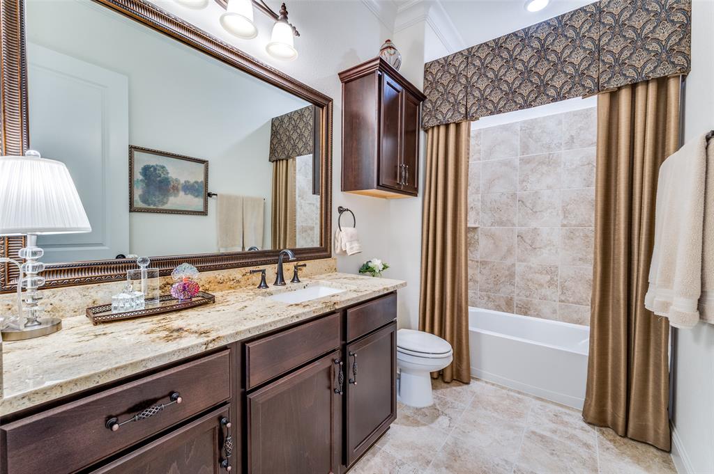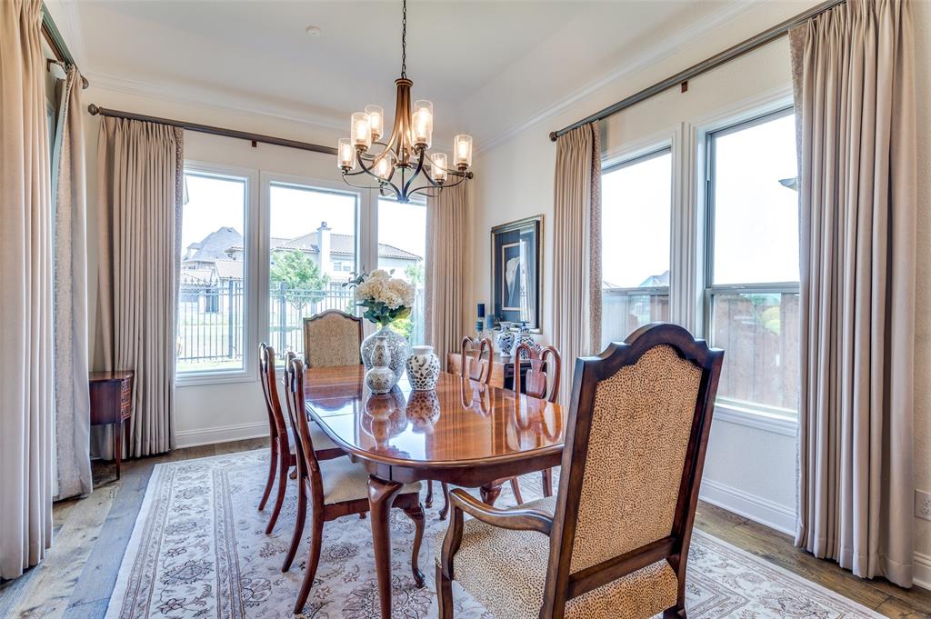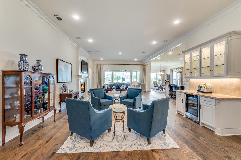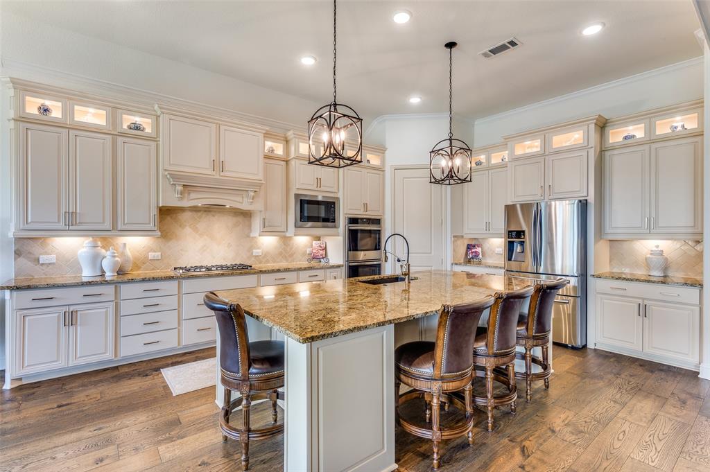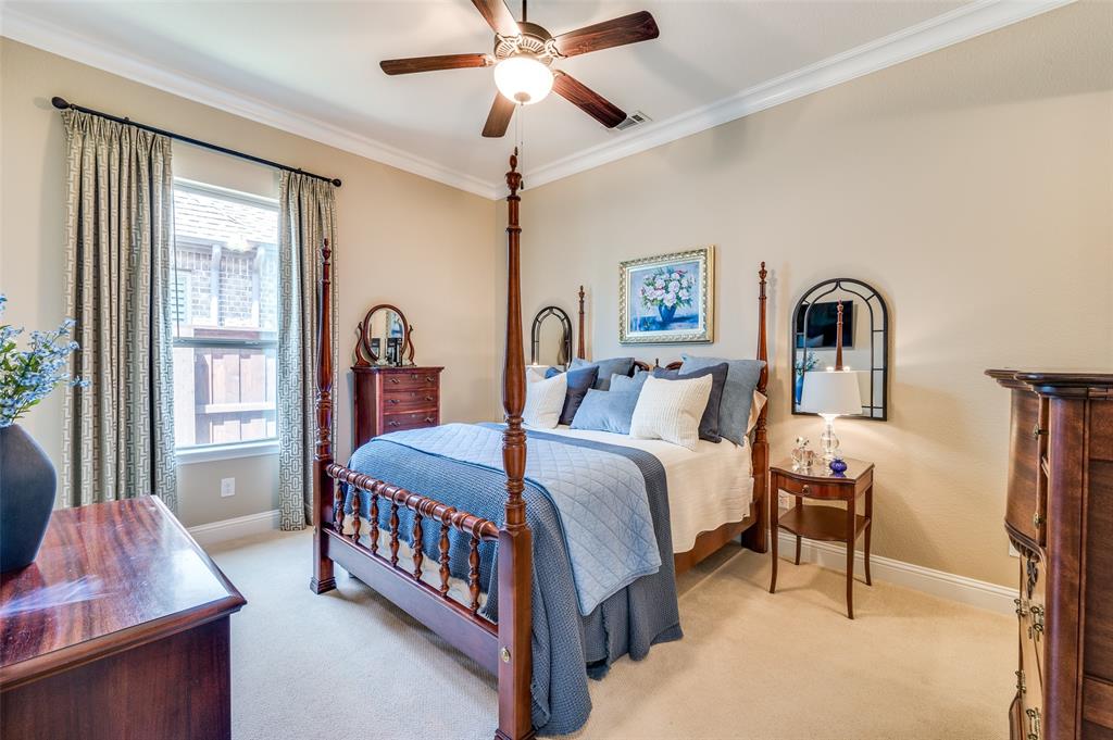 Welcome to 7617 Windsor, a stunning single-story home located in prestigious Waterford Point Village of The Tribute—a resort-style, lakeside, and golf community in the heart of North Dallas. Situated on an oversized lot with no rear neighbors, this home backs to scenic green space and miles of trails, offering privacy and peaceful views of nearby Lake Lewisville. Luxury is evident from the moment you arrive, with brick and stone elevation, stone-paved driveway, lush landscaping, and wrought iron front door that sets the tone. Inside, a bright, airy entry welcomes you with wide plank wood floors, crown molding, upgraded lighting, and custom woodwork that continues throughout the home. The chef’s kitchen is both stylish and functional with an oversized island, granite countertops, and stainless steel appliances including gas cooktop, double oven, built-in microwave, and refrigerator. Floor-to-ceiling custom cabinetry with glass-front uppers, under-cabinet lighting, and decorative pendant lights complete this impressive space. Primary suite is a serene retreat featuring rich wood floors, tray ceiling with chandelier, and wall of windows overlooking the backyard. Spa-like bath includes dual granite vanities, framed mirrors, a dedicated makeup area, and elegant lighting. All secondary bedrooms offer plush carpet, oversized walk-in closets, and ensuite baths. Outdoor living is a highlight with extended covered patio featuring vaulted wood-paneled ceiling, cedar beams, remote screen, stone fireplace, mounted TV, built-in grill, and prep station. Custom stone island is ready for your smoker, making this a perfect space for entertaining year-round. This home offers unmatched attention to detail, premium finishes, and access to exclusive amenities—fitness center, infinity pool, clubhouse, and events—making it a true standout in The Tribute. Don’t miss your opportunity to own this one-of-a-kind home, thoughtfully upgraded with luxury, comfort, and lifestyle in mind.