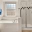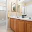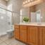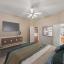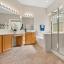 The cozy living room centers around a charming fireplace and offers serene views of the backyard. The primary suite includes a large bathroom with a jetted tub, separate shower, double sinks with generous counter space, a walk-in closet, and a private toilet area.
