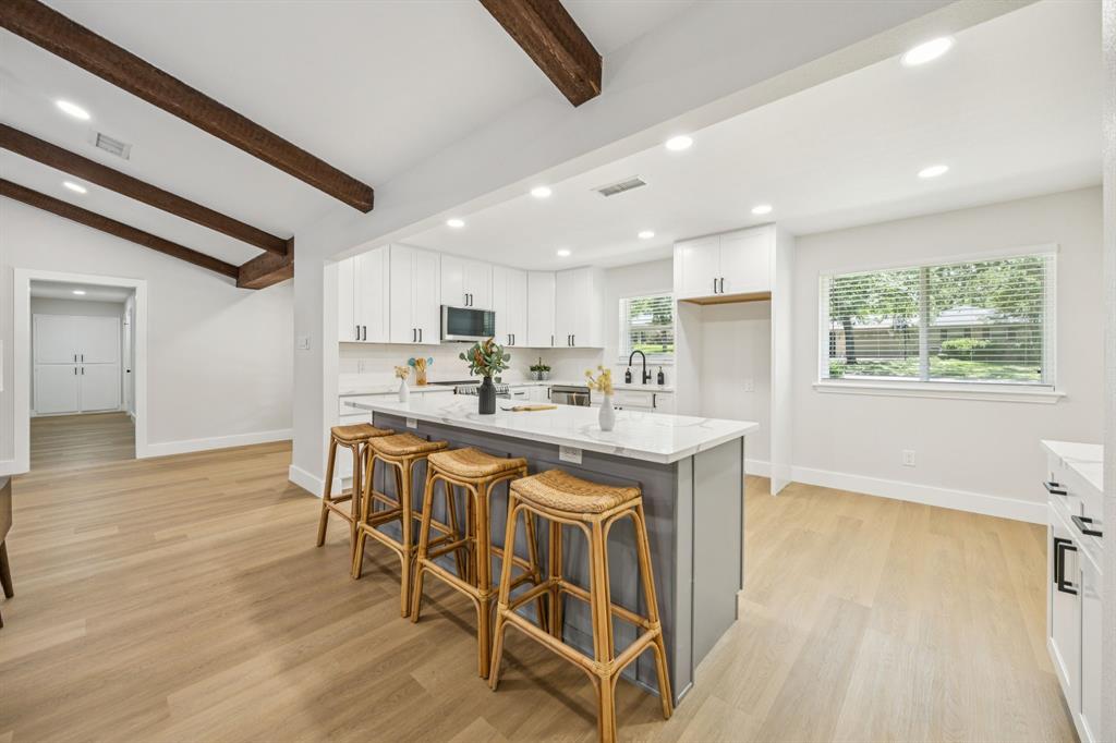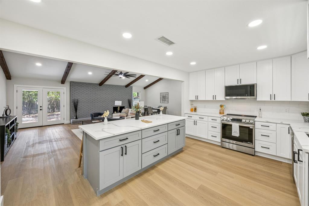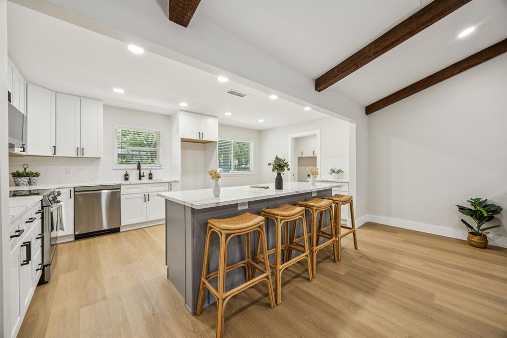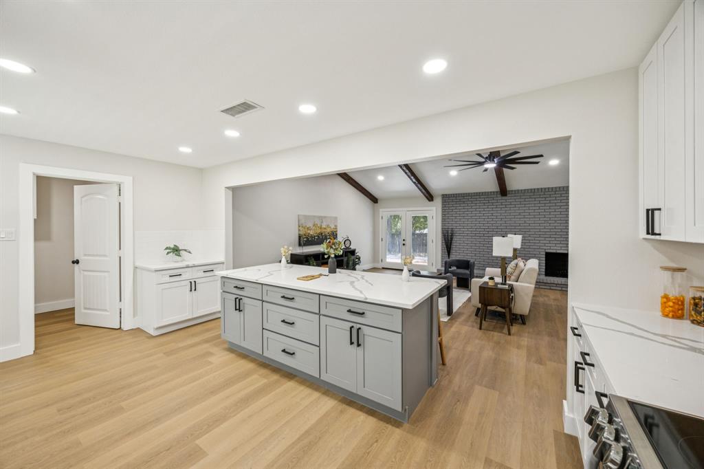 The open floor plan showcases brand-new luxury vinyl plank flooring, fresh interior and exterior paint, stylish new fixtures, and a bright, inviting layout that flows seamlessly into the stunning modern kitchen. Highlights include soft-close cabinetry, quartz countertops, stainless steel appliances, a large center island, and elegant finishes throughout.
