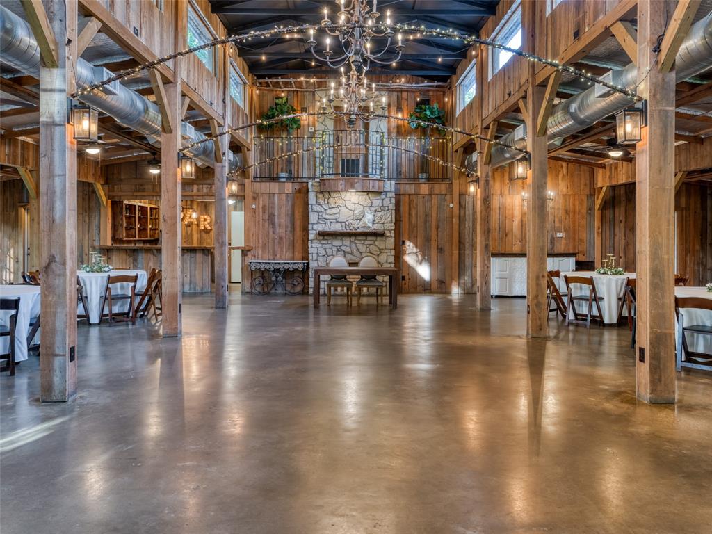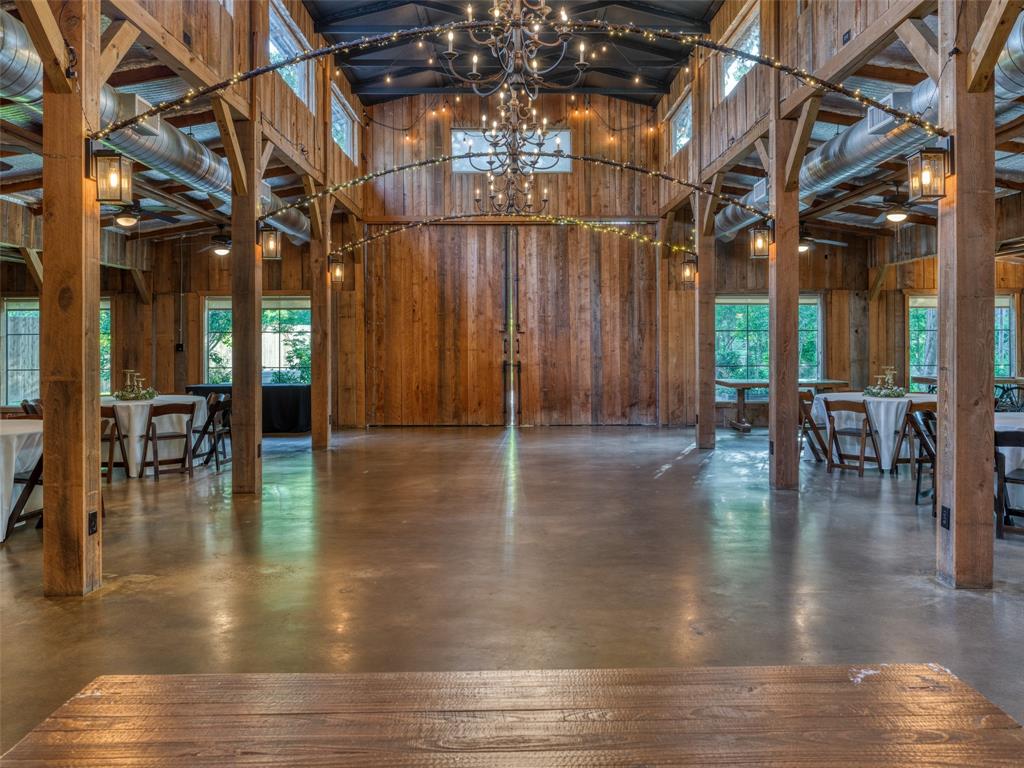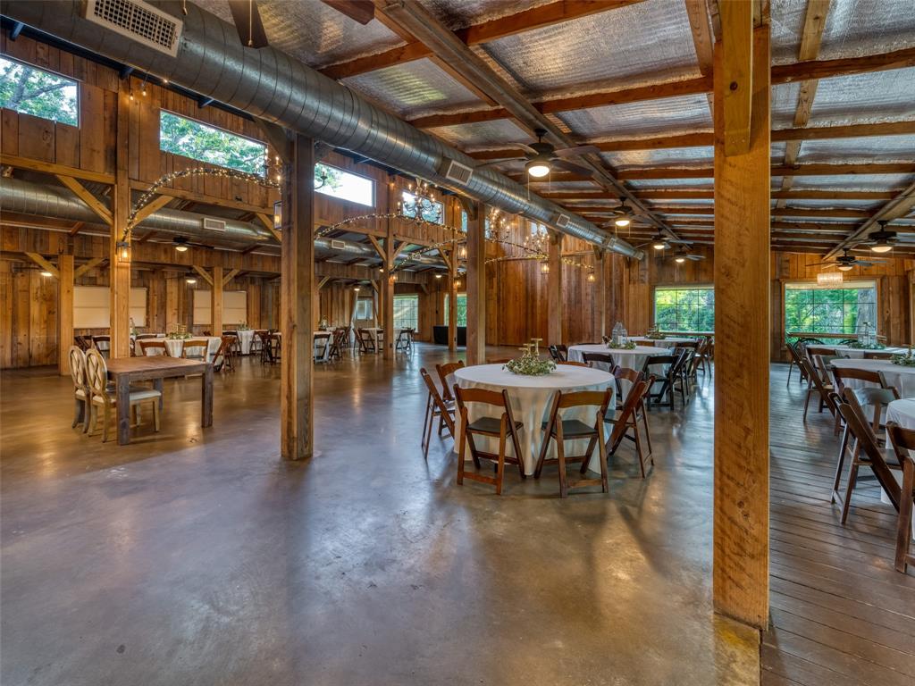 At the heart of the venue is a versatile barn-inspired building that spans approximately 4,137 SF, complete with a food-serving area, a bar for beverage service, and a fully equipped catering kitchen. The main structure captivates with its soaring 19-foot ceiling, providing an open and airy ambiance that is ideal for hosting large gatherings or intimate events.