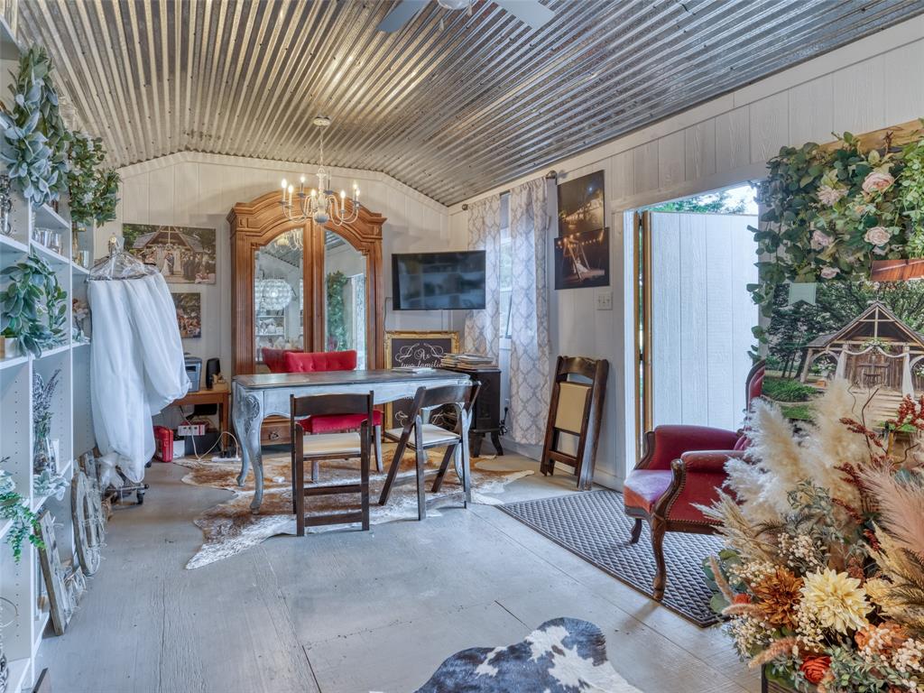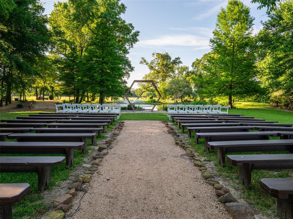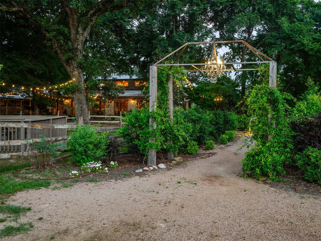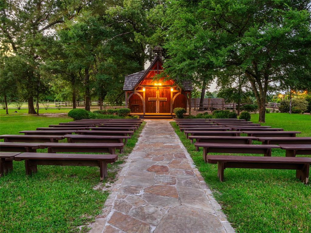 The outdoor amenities include extensive flagstone patios and walkways, creating enchanting paths that lead to a picturesque pond with a fountain, a charming outdoor chapel, and a pergola adorned with string lights and a chandelier – a perfect setting for weddings and ceremonies. The venue is further enhanced by a small office building and two ample parking lots for guests, while an additional structure offers dressing rooms and bathrooms for event participants.