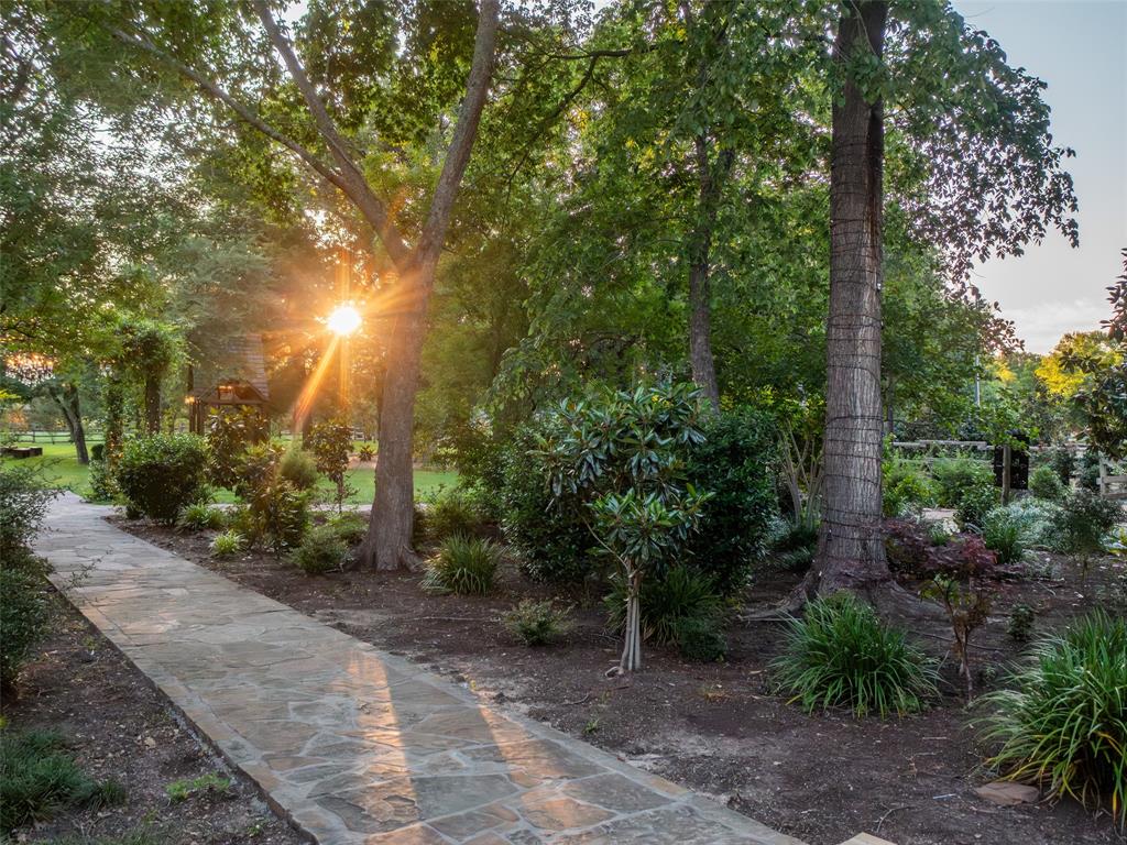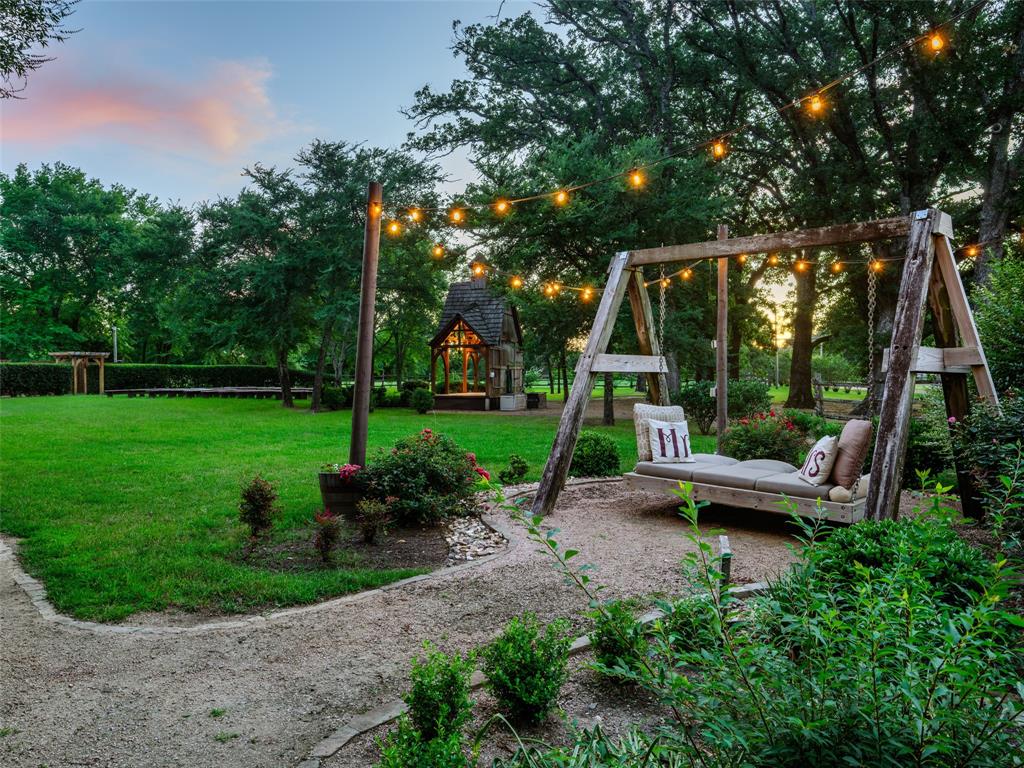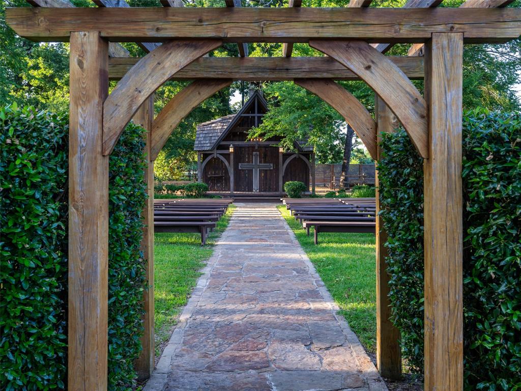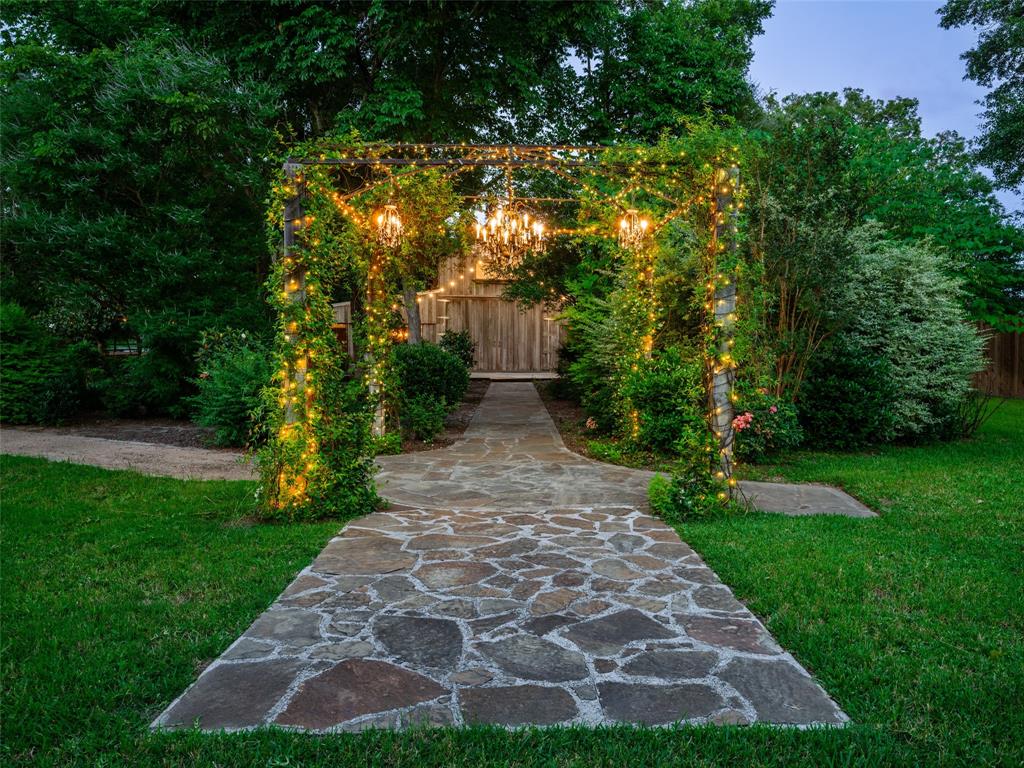 The outdoor amenities include extensive flagstone patios and walkways, creating enchanting paths that lead to a picturesque pond with a fountain, a charming outdoor chapel, and a pergola adorned with string lights and a chandelier – a perfect setting for weddings and ceremonies. The venue is further enhanced by a small office building and two ample parking lots for guests, while an additional structure offers dressing rooms and bathrooms for event participants.