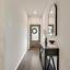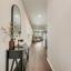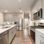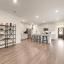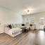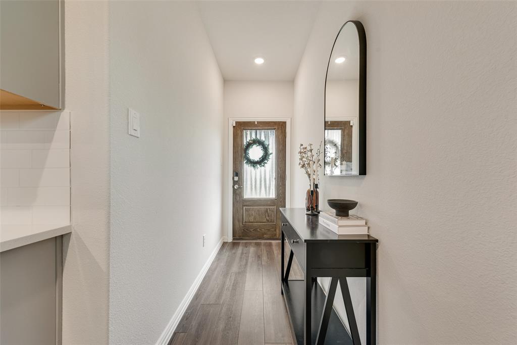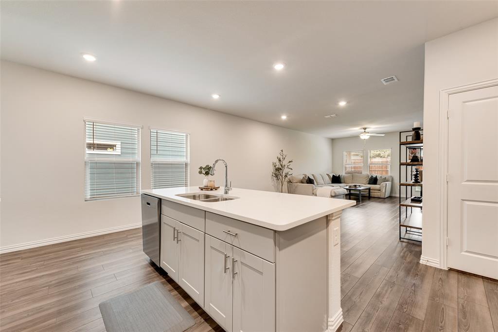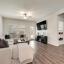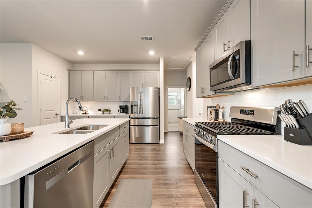 Step inside to find a warm and inviting interior featuring gray-toned cabinets complemented by gleaming white quartz countertops and a classic subway tile backsplash. Elegant EVP flooring pairs beautifully with plush dark gray tweed carpeting, creating a seamless flow throughout the home.