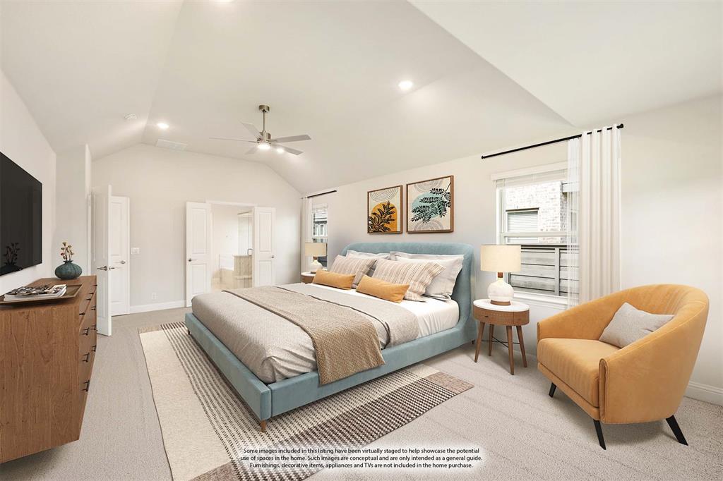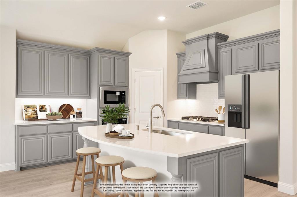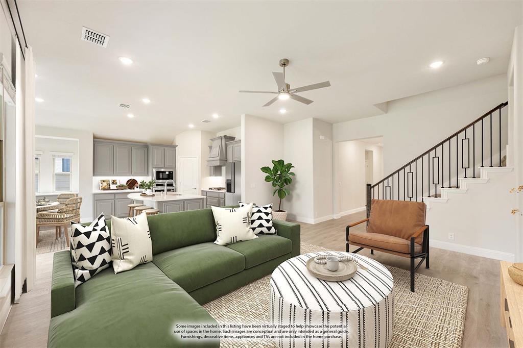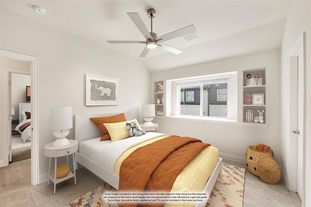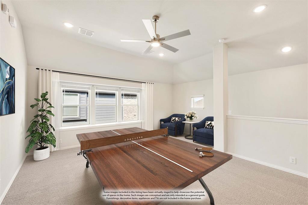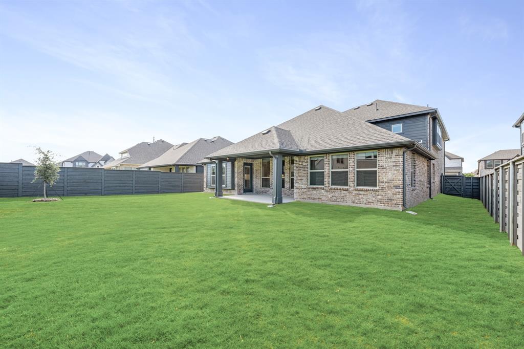 NEW! NEVER LIVED IN & READY for Move-In NOW! Prepare to be impressed by this Carolina IV plan, featuring a striking brick and stone exterior highlighted by exterior lighting and an elegant 8' Front Door, all perfectly situated on a desirable south-facing interior lot. Inside, the open layout is packed with luxurious upgrades and thoughtful finishes. This home offers 4 bedrooms and 3 baths—3 located on the main floor and a private 4th bedroom upstairs—designed to provide comfort and versatility for families of all sizes. The Deluxe Kitchen is equipped for all entertaining needs, showcasing exquisite cabinetry with Quartz counters, pot and pan drawers, built-in stainless steel appliances, a spacious island, and a walk-in pantry, with a coordinating buffet adding both charm and functionality. Enhancements abound throughout the home, including beautiful Laminate Wood floors, a tankless water heater for efficiency, and included 2-inch faux wood blinds that add privacy and polish. Dual Doors frame the private Study, and a built-in Tech Center upstairs complements the expansive Game and Media Rooms, creating an ideal balance of work and leisure. Outdoors, the Extended Covered Rear Patio with gas drop is ready for grilling, while full gutters help protect the exterior year-round. All of this within a vibrant master-planned community offering fitness facilities, scenic trails, pickleball courts, and more—this home truly delivers on both lifestyle and luxury.