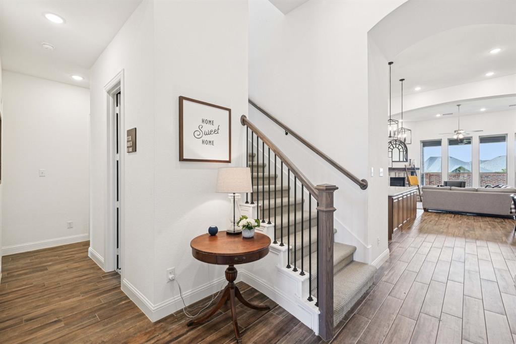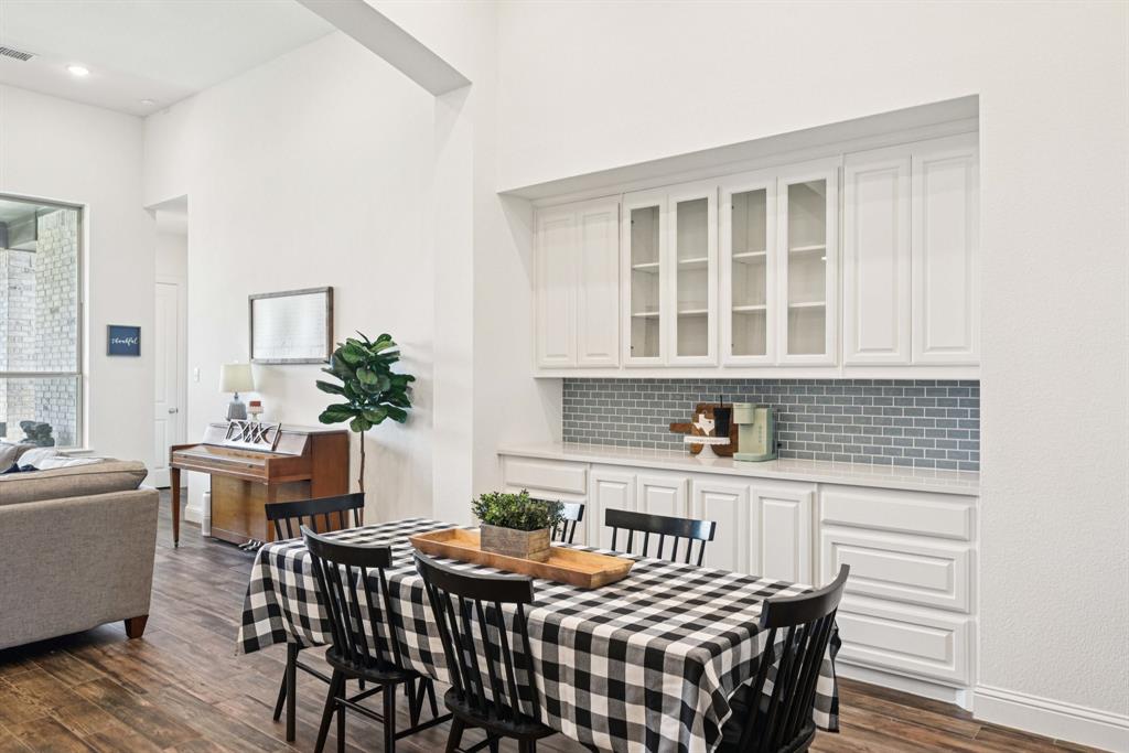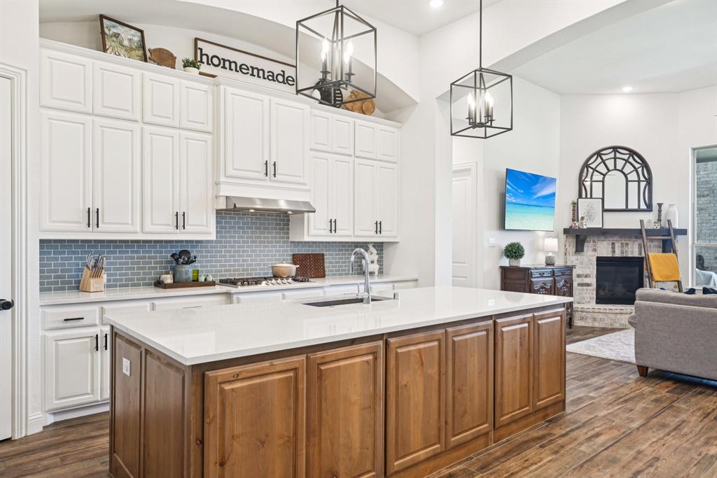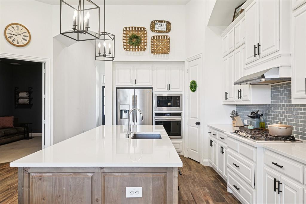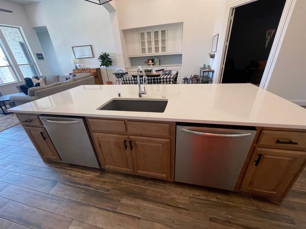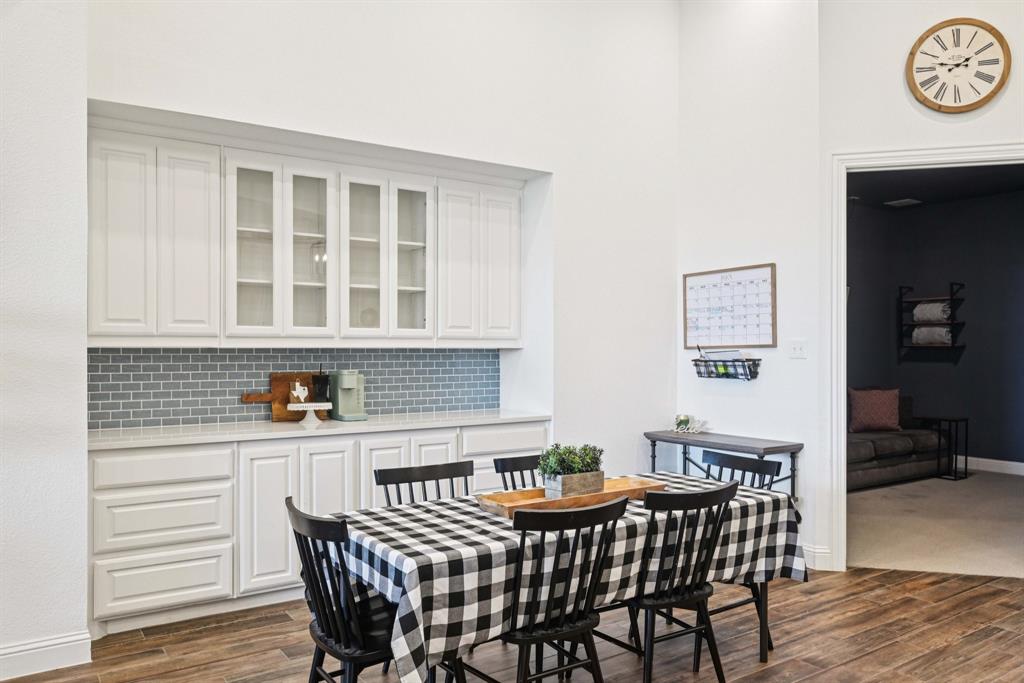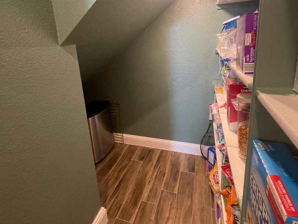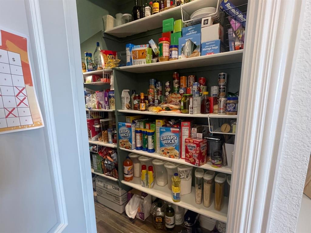 The large kitchen has tons of storage, upgraded cabinetry, a custom island with 2 dishwashers and lots storage , and a built-in dining hutch. The walk-in pantry extends under the stairs for additional storage.