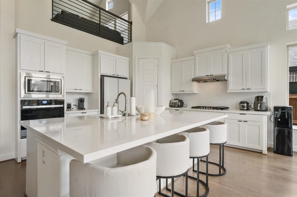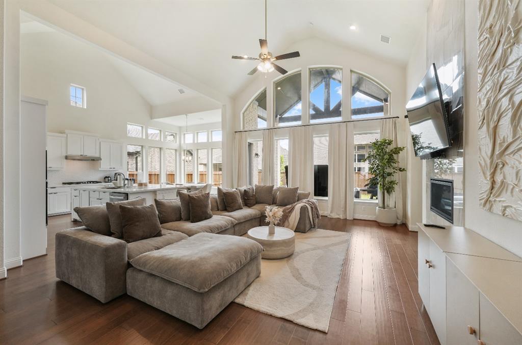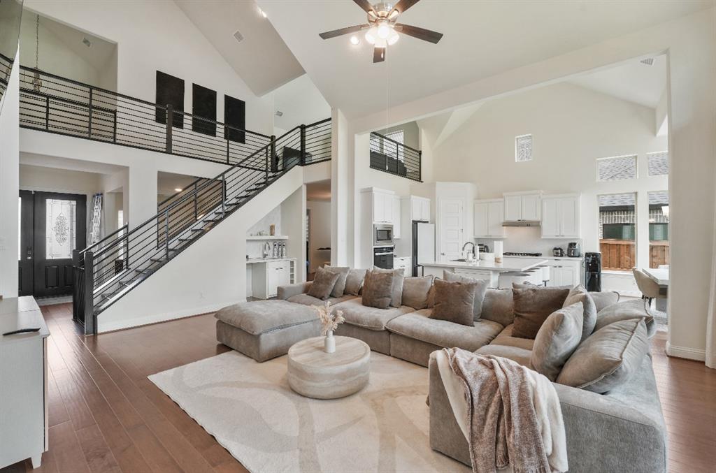 The heart of the home is a bright and airy open floor plan that seamlessly connects the living room, dining area, and gourmet kitchen—perfect for entertaining guests or relaxing with family. Large windows bring in natural light, highlighting the sleek finishes, high ceilings, and premium flooring throughout.