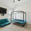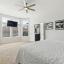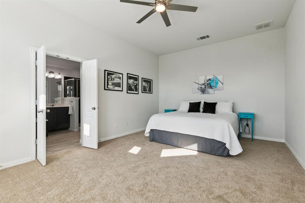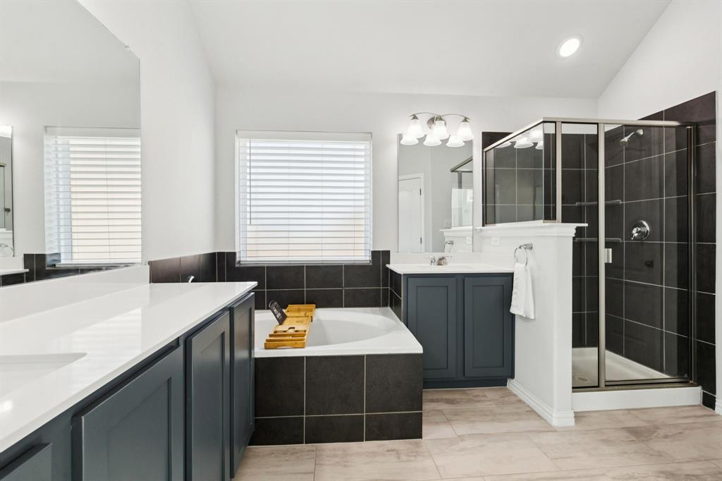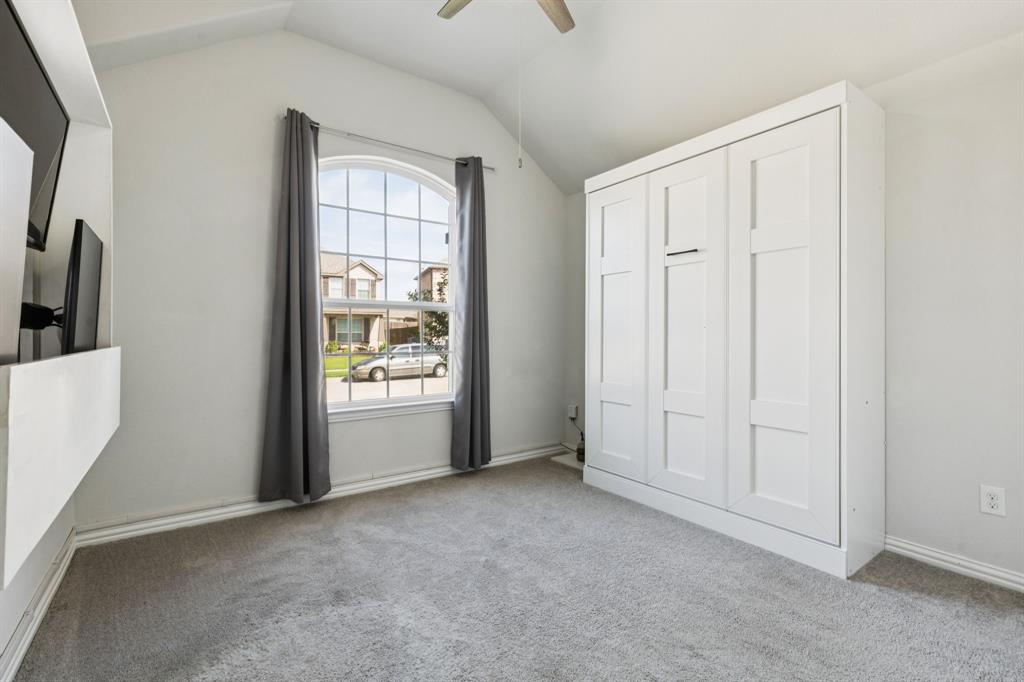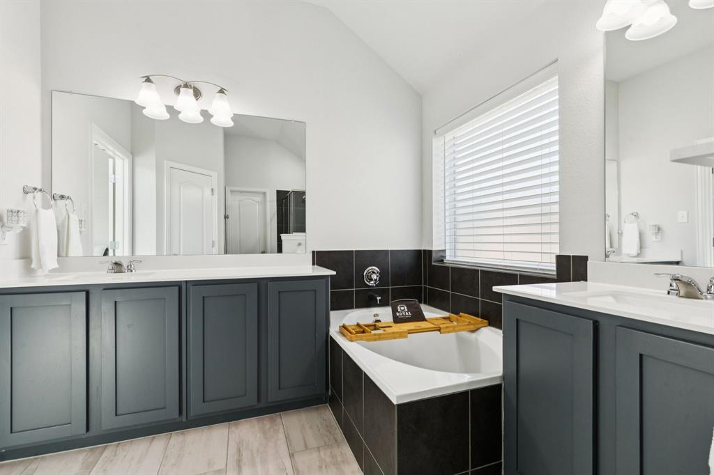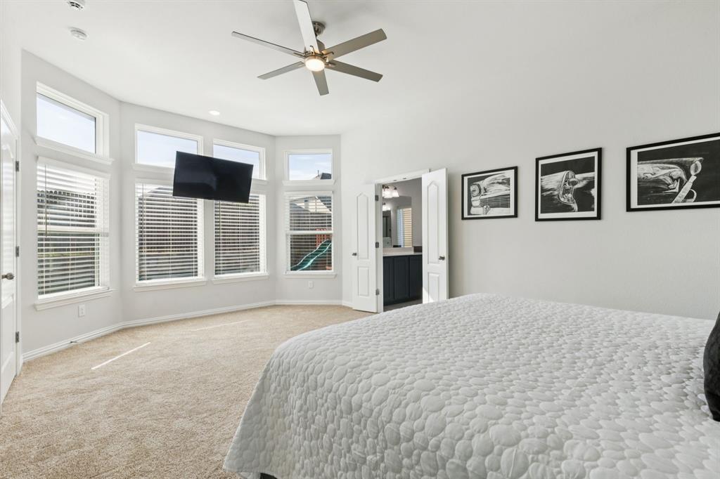 The impressive split-bedroom layout includes two bedrooms at the front, one with a built-in Murphy bed and desk system, and a third bedroom near the kitchen. The private owner’s retreat sits on the opposite side of the home with a bay window sitting area, dual vanities, a soaking garden tub, separate shower, and a massive walk-in closet outfitted with custom built-ins.