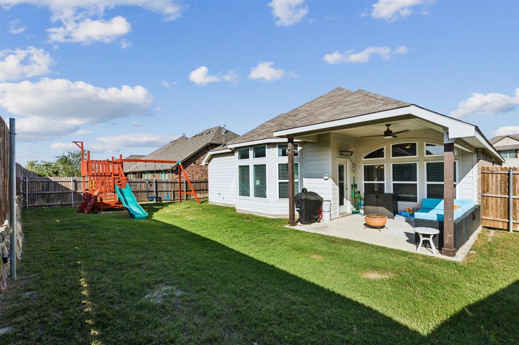 The versatile bonus room includes a spacious closet—perfect for a home office, game room, or optional 5th bedroom. Enjoy outdoor living on the oversized covered patio with ceiling fan, overlooking a generous backyard complete with a playset that will convey.