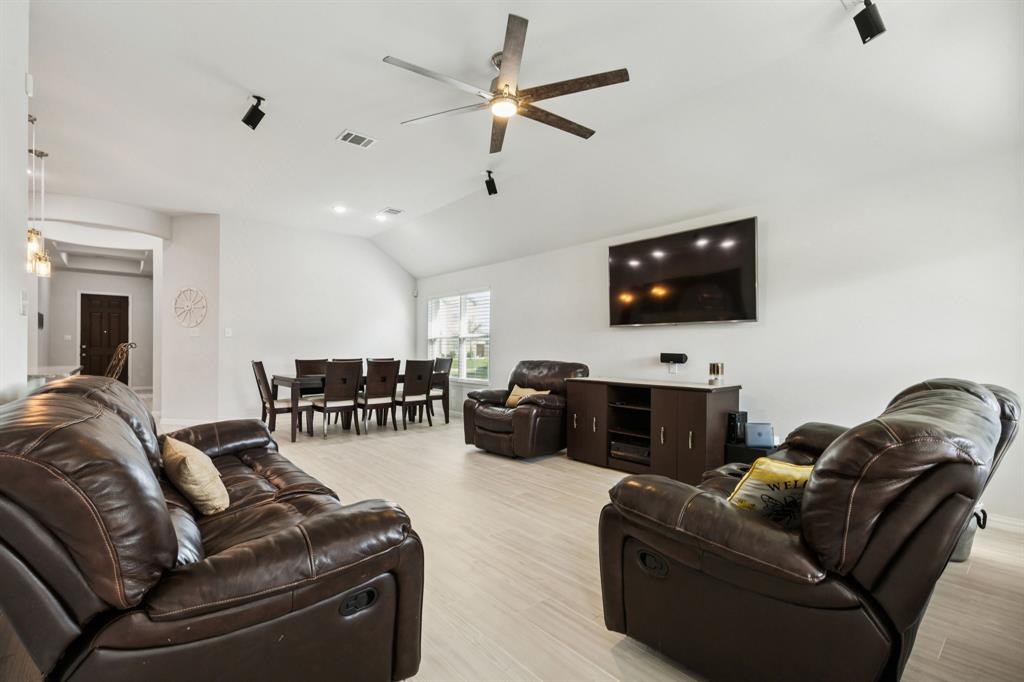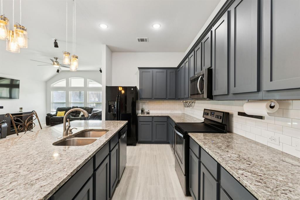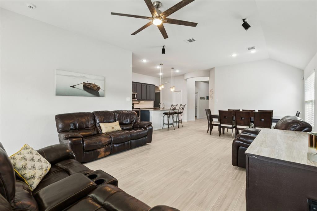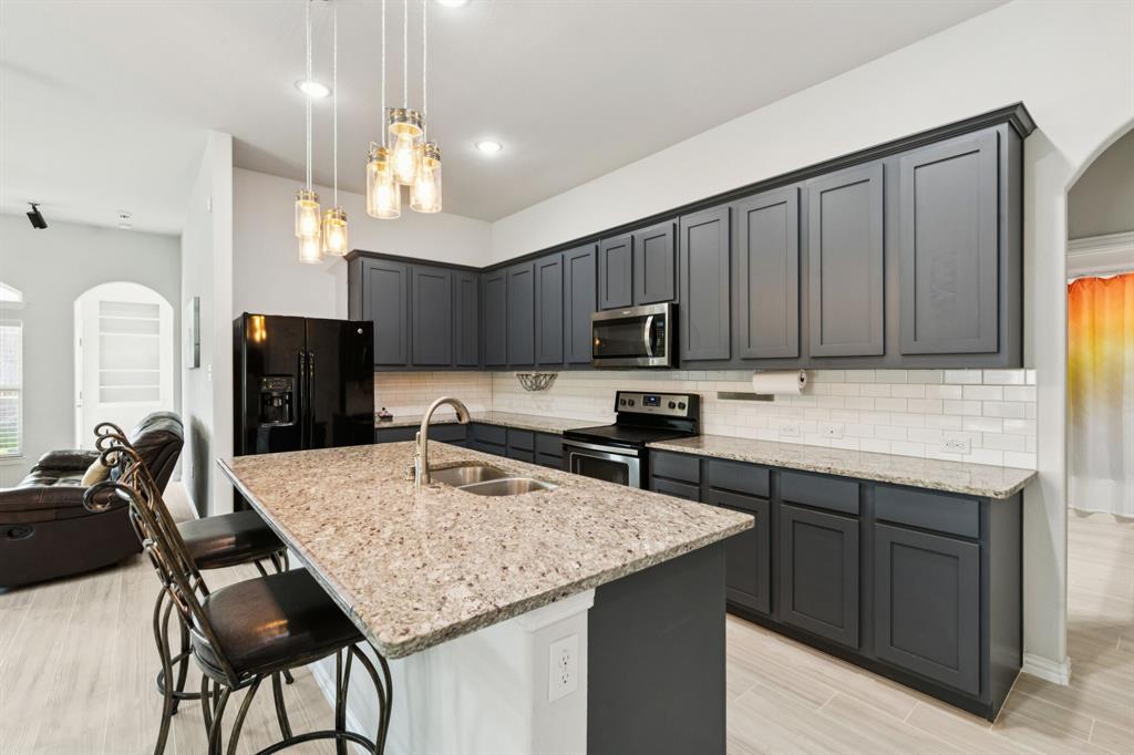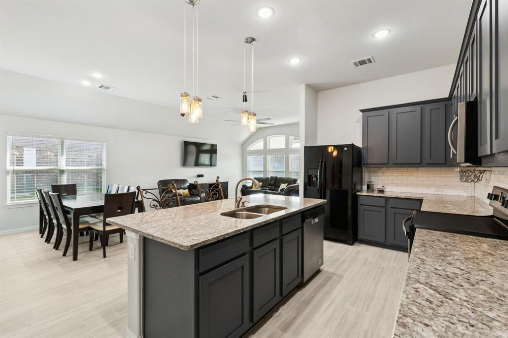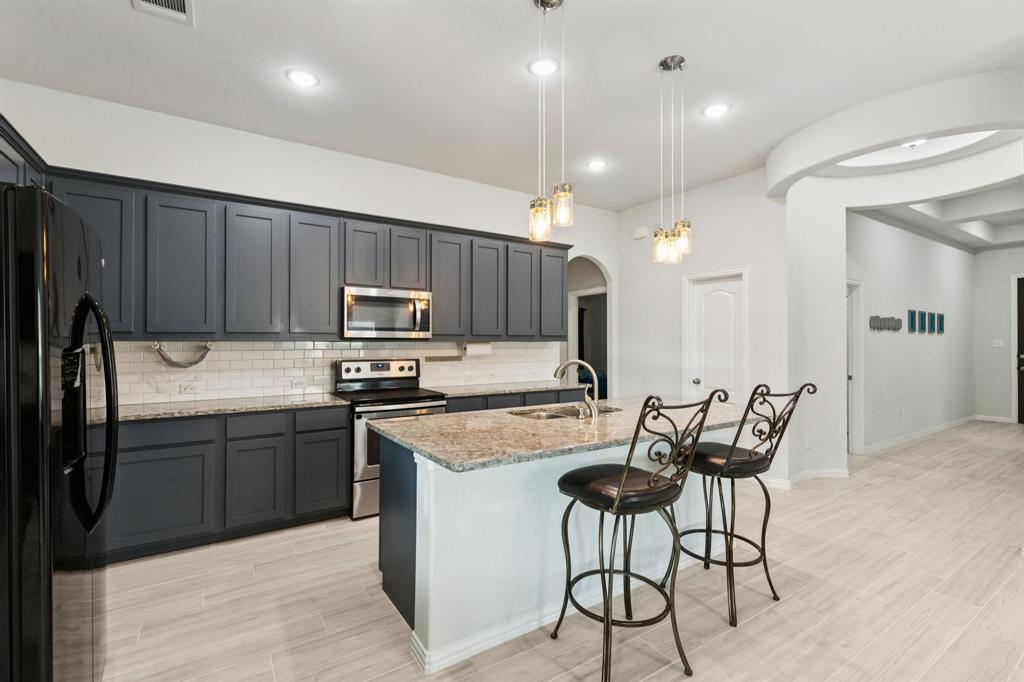 Inside, you'll find an exceptional open-concept layout filled with updates—wood-look tile flooring, new carpet, arched doorways, tray and vaulted ceilings, recessed lighting, and stylish modern fixtures and fans throughout. The heart of the home is the chef’s kitchen featuring a large center island with breakfast bar and decorative pendant lighting, abundant cabinetry, a classic subway tile backsplash, Whirlpool appliances, and seamless flow into the dining and living areas.
