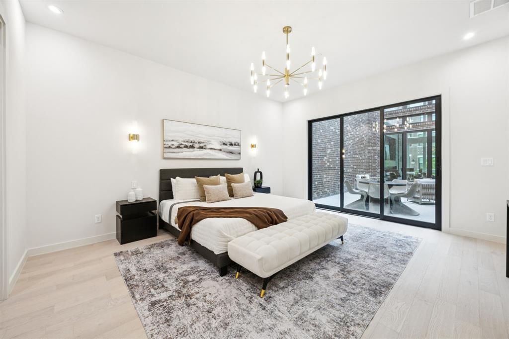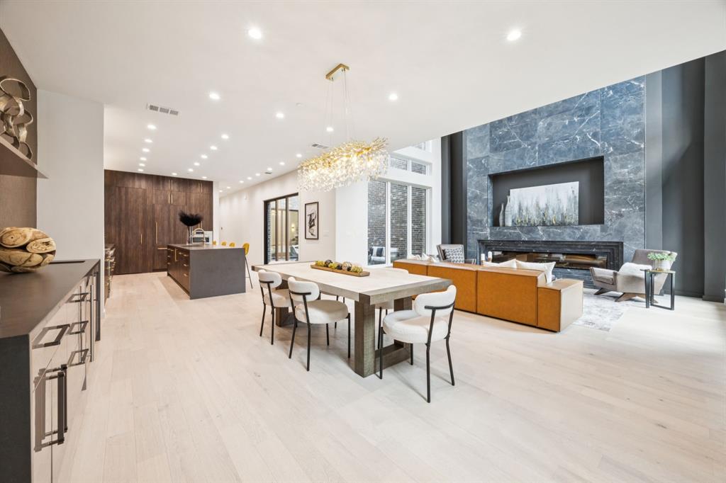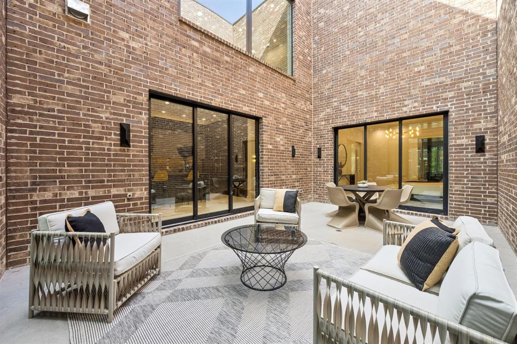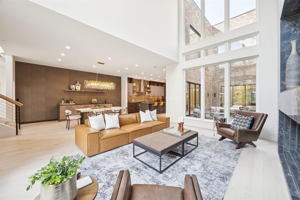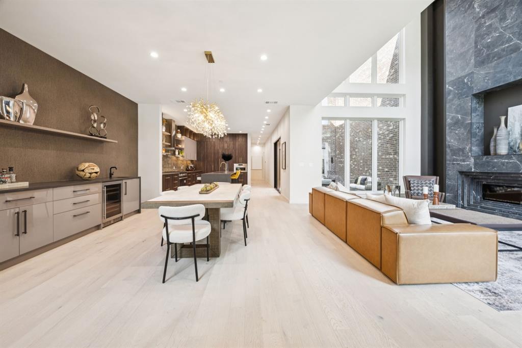 Designer touches abound—from the show-stopping two-story fireplace to statement chandeliers and an upscale bar with wine and beverage fridge. The open-concept kitchen seamlessly connects to a private courtyard via oversized sliding doors—perfect for entertaining or unwinding in style.