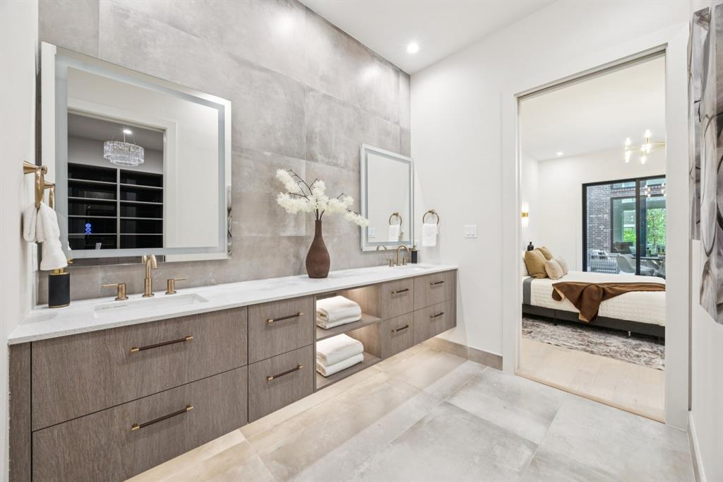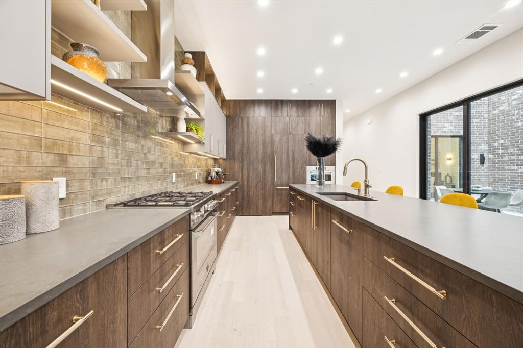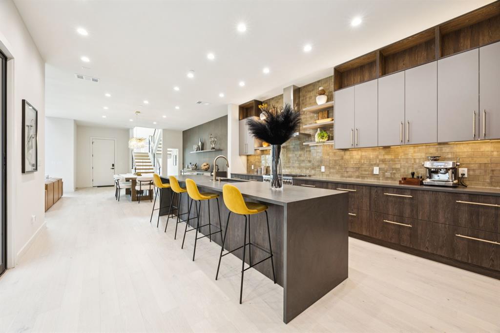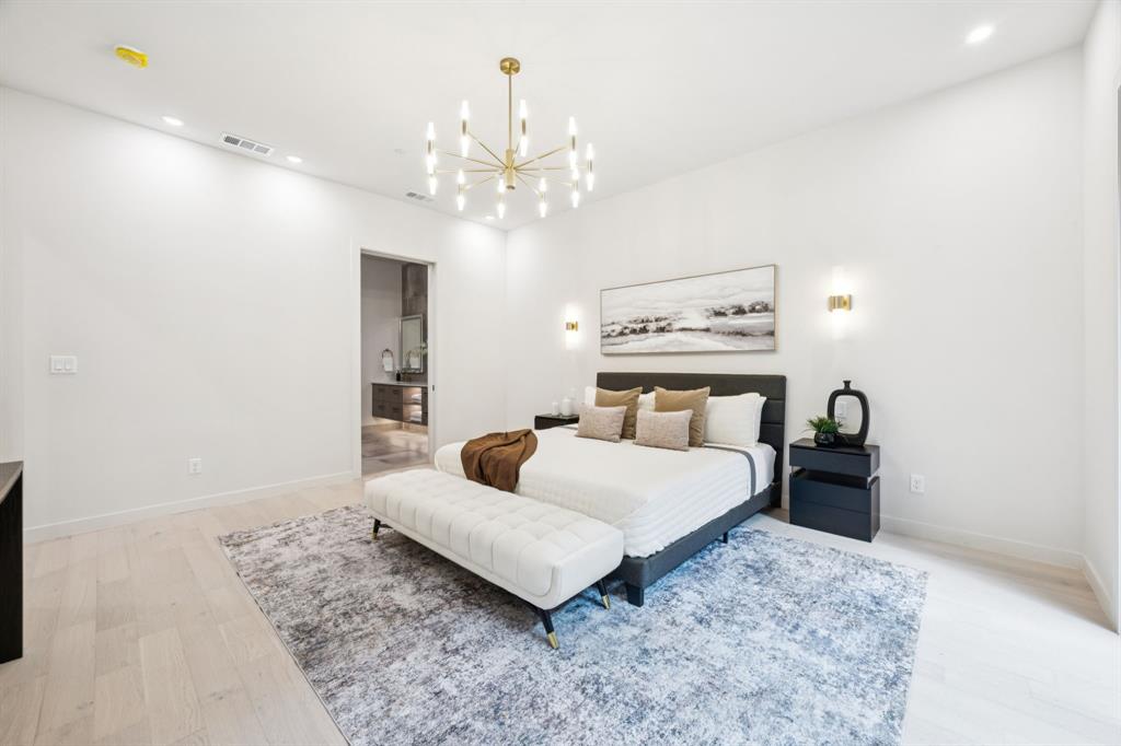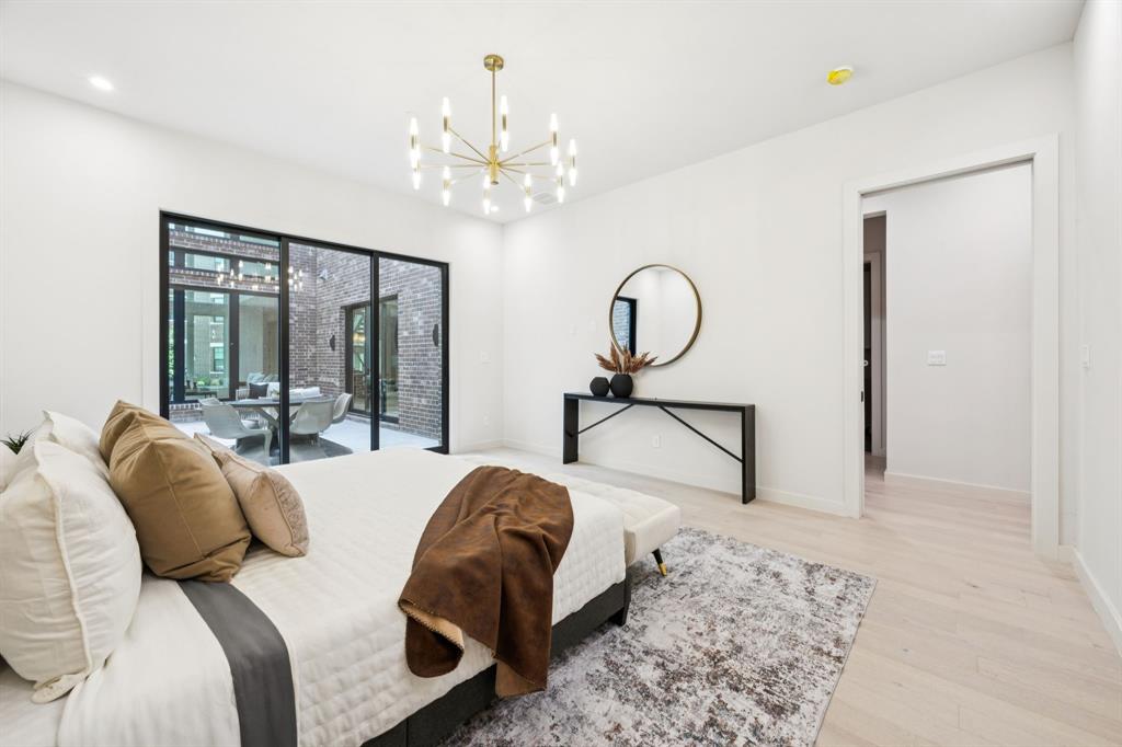 Designer touches abound—from the show-stopping two-story fireplace to statement chandeliers and an upscale bar with wine and beverage fridge. The open-concept kitchen seamlessly connects to a private courtyard via oversized sliding doors—perfect for entertaining or unwinding in style.