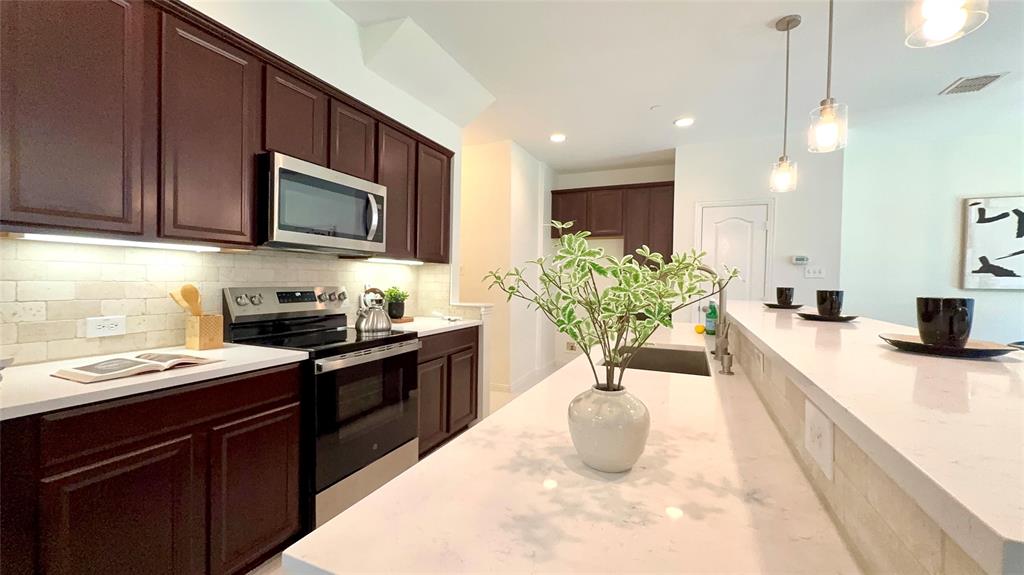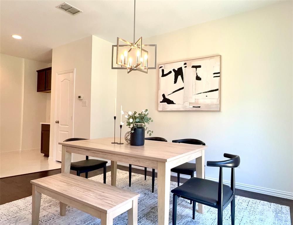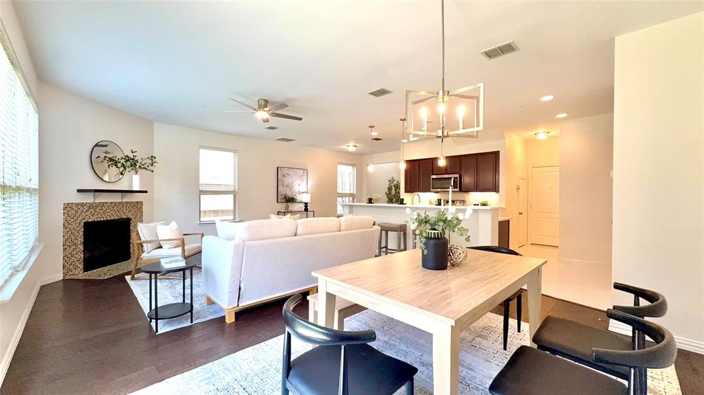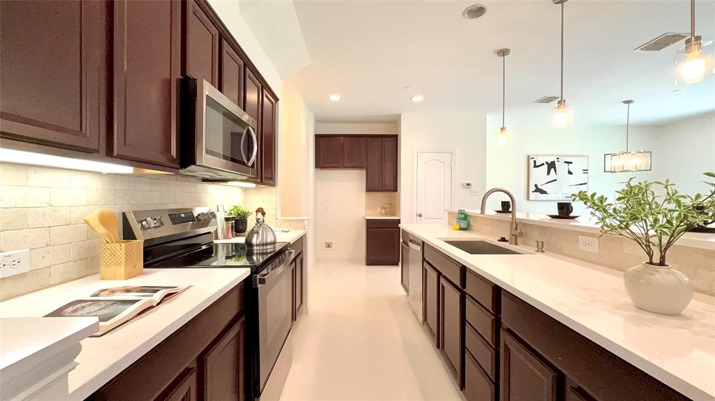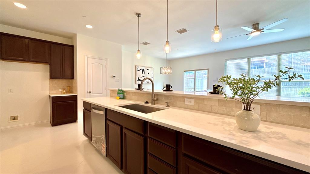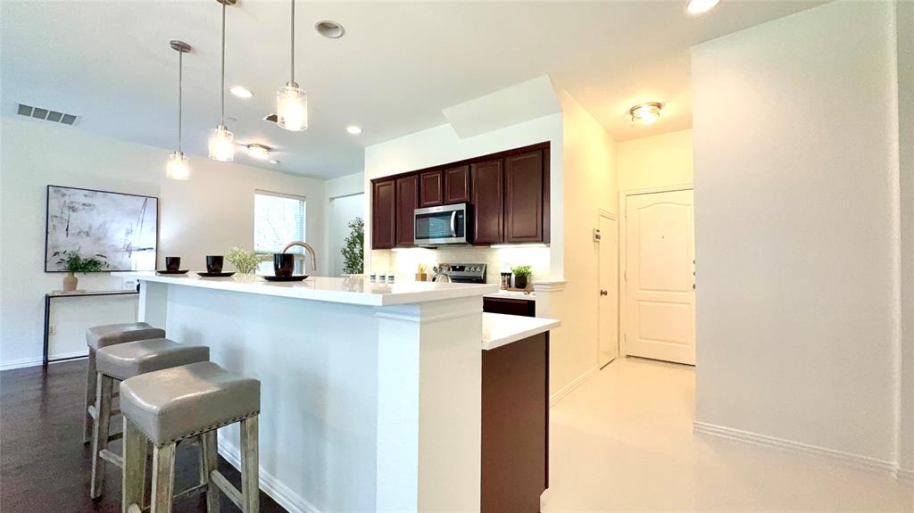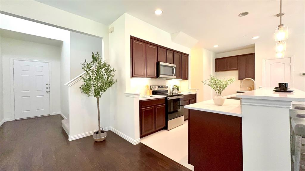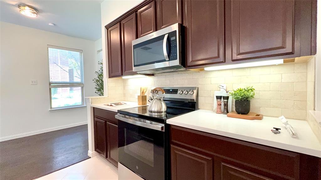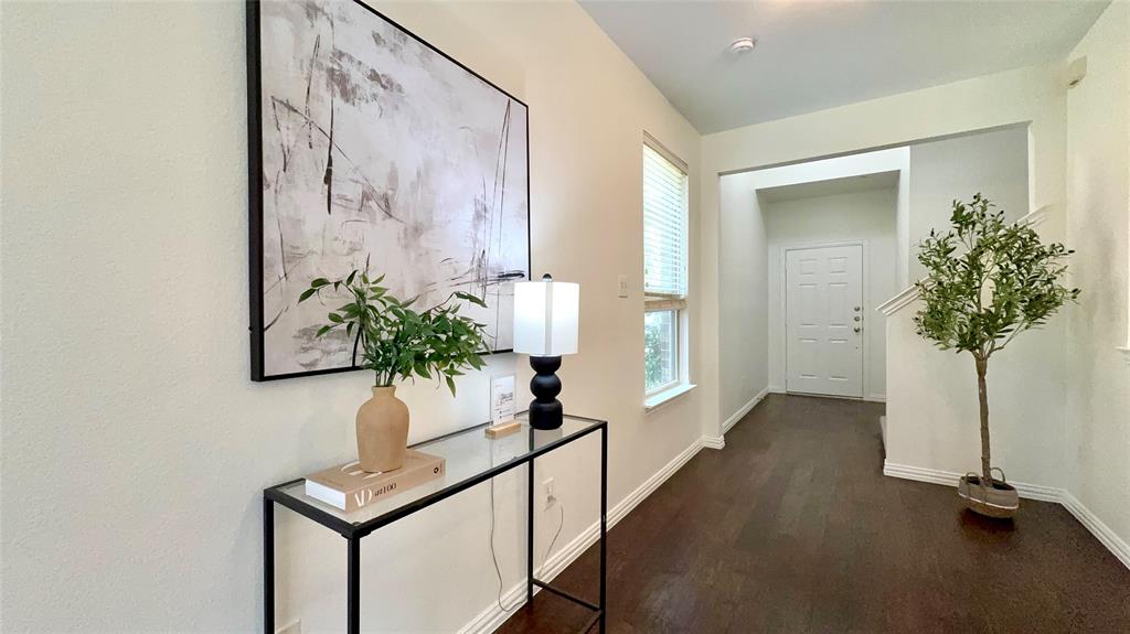 BIG PRICE IMPROVEMENT. This is the OPPORTUNITY you have been waiting for. This REMODELED townhouse is great for a professional like you. House will be professionally cleaned when you move in. Bright Corner Lot Home with Modern Upgrades Near Shops & DFW Airport! Welcome to this beautifully updated 3-bedroom, 2.5-bathroom home offering 1,980 sq ft of stylish, move-in-ready living space on a desirable corner lot in a quiet community. Step inside to discover an open-concept floor plan filled with abundant natural light, fresh new paint throughout the entire house including all doors and trims, and wood flooring on the first floor. New ceiling fan in the living room. The kitchen has been upgraded with a new quartz countertop, new electric oven, new dishwasher, and designer light fixtures, including pendant lights, a stunning chandelier, and ceiling mount. Upstairs features brand-new carpet for cozy comfort, and the spacious game room with structural pre wiring. Enjoy the outdoors in your generously sized backyard, perfect for relaxing or entertaining. This low-maintenance home comes with HOA-covered exterior care, including roof and front yard maintenance. Located within walking distance to the community pool and mailbox, and just minutes from Costco, Zion Market, The Vista, and more — everything you need is less than a mile away! Commuters will love the easy access to Highway 121 and being only 8 miles from DFW Airport. Don’t miss this upgraded gem in a prime location — schedule your tour today! Property Video on Youtube.