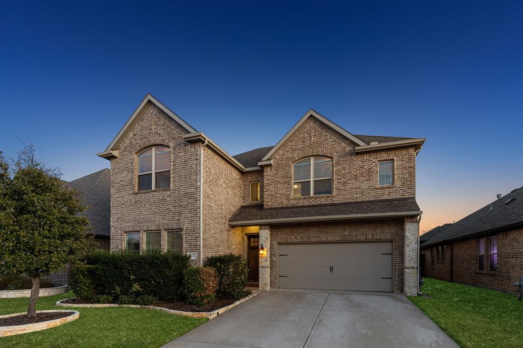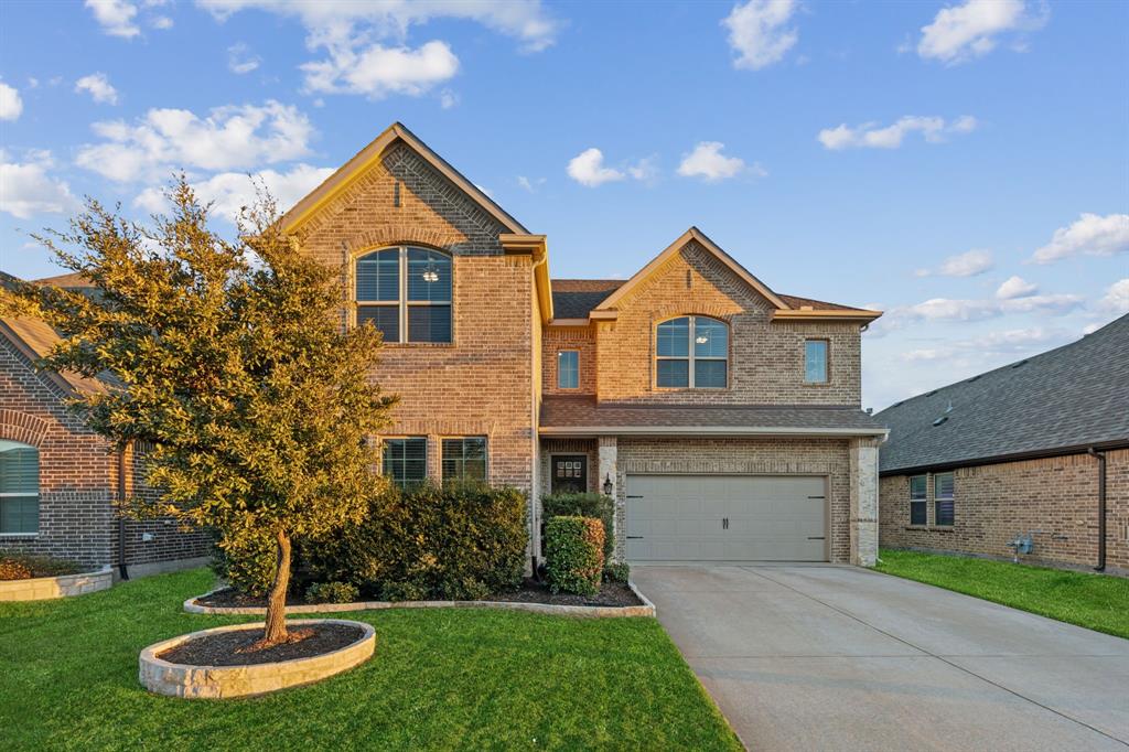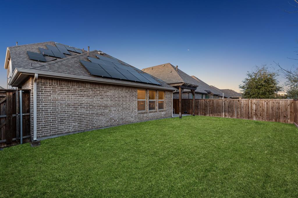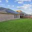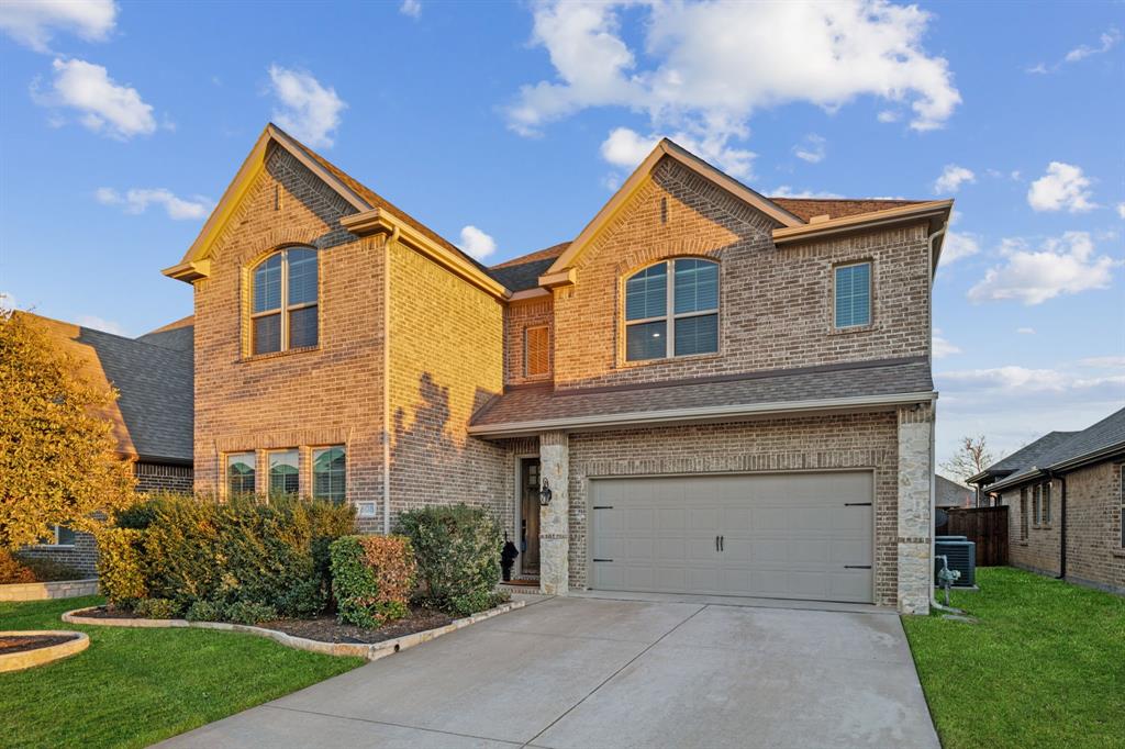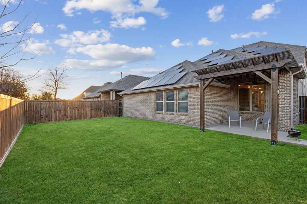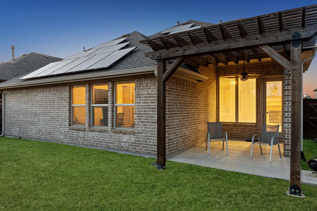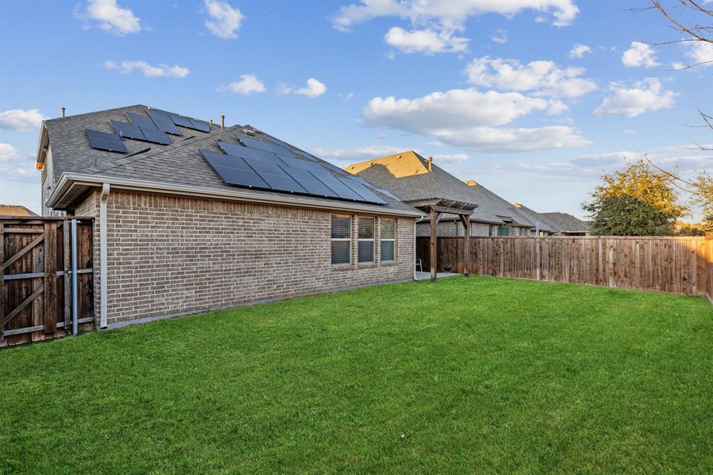 This stunning two-story brick and stone home is move-in ready! The well-designed floor plan includes a spacious first-floor guest bedroom and a private study that can also serve as an additional bedroom. Rich hardwood floors enhance the elegant dining room, which opens to the gorgeous kitchen. The kitchen boasts a large granite island, stylish pendant lighting, a gas cooktop, and stainless steel appliances. The cozy living room is anchored by a warm fireplace, with crown molding adding a touch of sophistication to the ceilings. A full-size utility room with built-in cabinets provides ample storage space. Upstairs, you'll love the expansive game room, accompanied by two generously sized guest bedrooms and a full bathroom. The first-floor primary suite is generously sized, offering plenty of space for a sitting area. The en-suite bath features dual sinks, a garden tub, a separate shower, and a walk-in closet. Step outside to a backyard retreat with a covered patio and an extended pergola, perfect for relaxing or entertaining. The spacious yard provides plenty of room to enjoy the outdoors. Plus, the home includes energy-efficient solar panels!