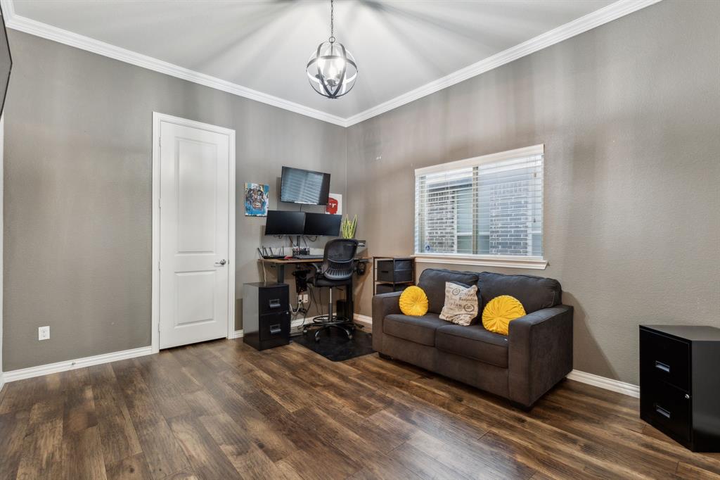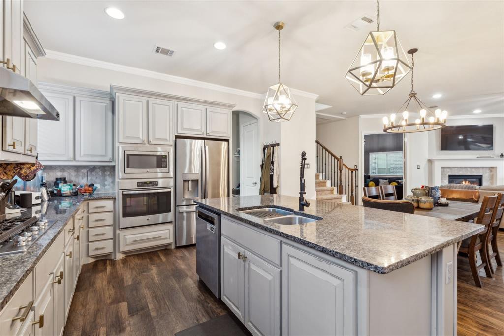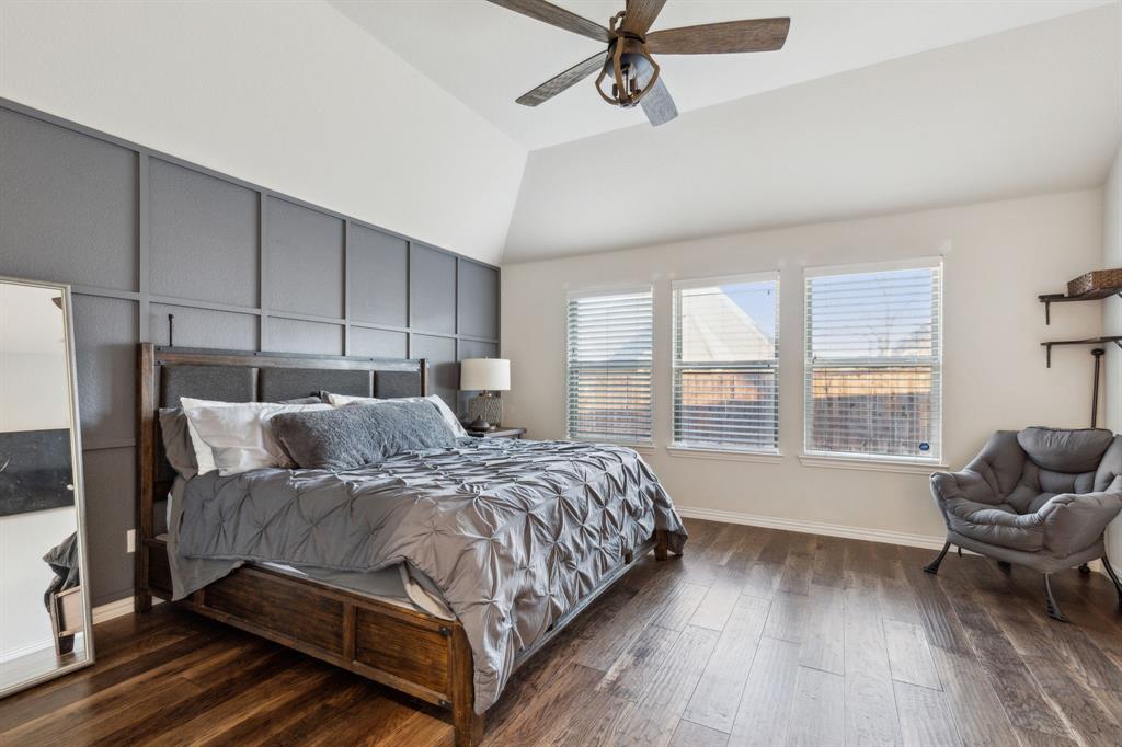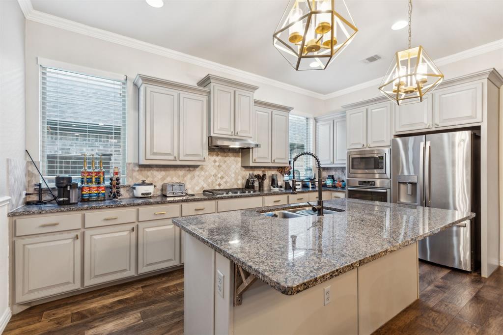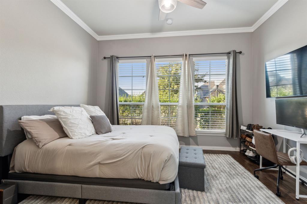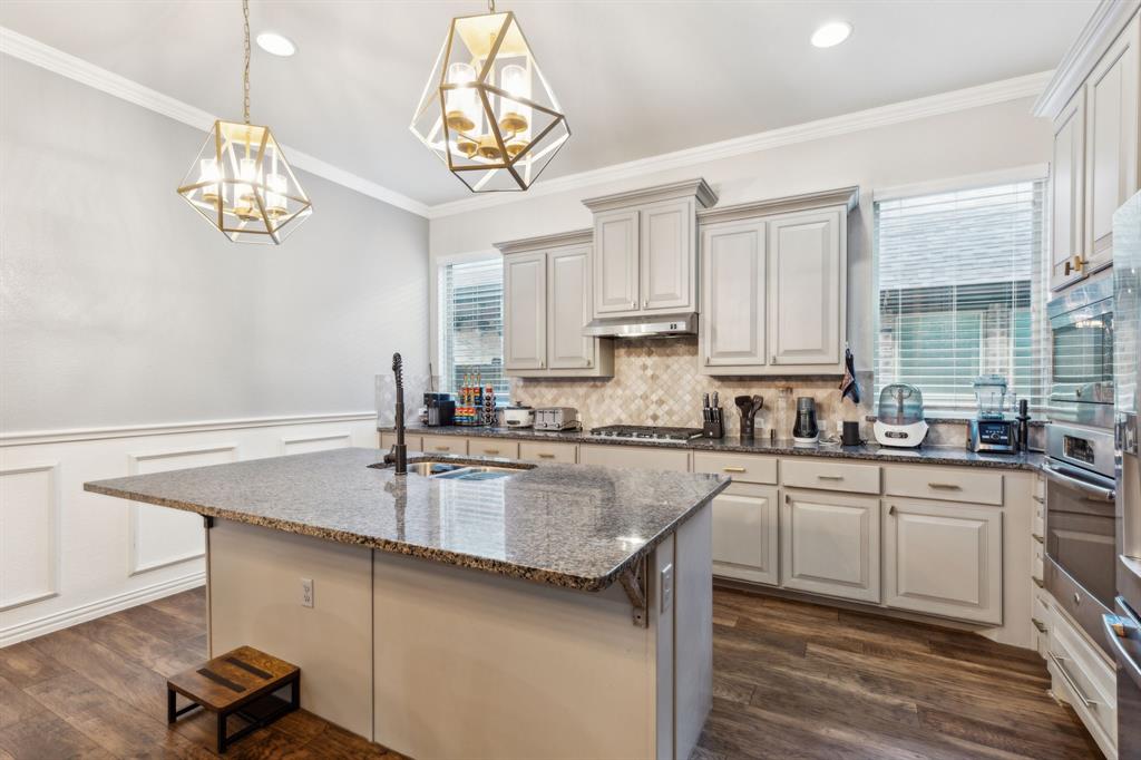 This stunning two-story brick and stone home is move-in ready! The well-designed floor plan includes a spacious first-floor guest bedroom and a private study that can also serve as an additional bedroom. Rich hardwood floors enhance the elegant dining room, which opens to the gorgeous kitchen. The kitchen boasts a large granite island, stylish pendant lighting, a gas cooktop, and stainless steel appliances. The cozy living room is anchored by a warm fireplace, with crown molding adding a touch of sophistication to the ceilings. A full-size utility room with built-in cabinets provides ample storage space. Upstairs, you'll love the expansive game room, accompanied by two generously sized guest bedrooms and a full bathroom. The first-floor primary suite is generously sized, offering plenty of space for a sitting area. The en-suite bath features dual sinks, a garden tub, a separate shower, and a walk-in closet. Step outside to a backyard retreat with a covered patio and an extended pergola, perfect for relaxing or entertaining. The spacious yard provides plenty of room to enjoy the outdoors. Plus, the home includes energy-efficient solar panels!