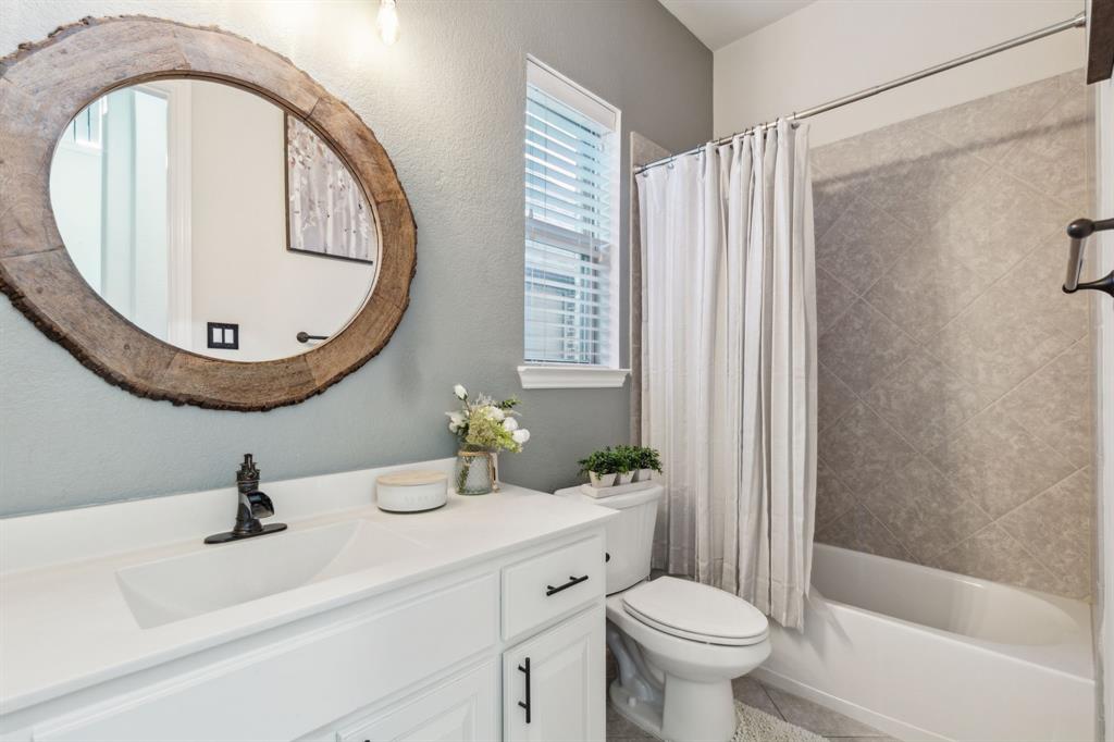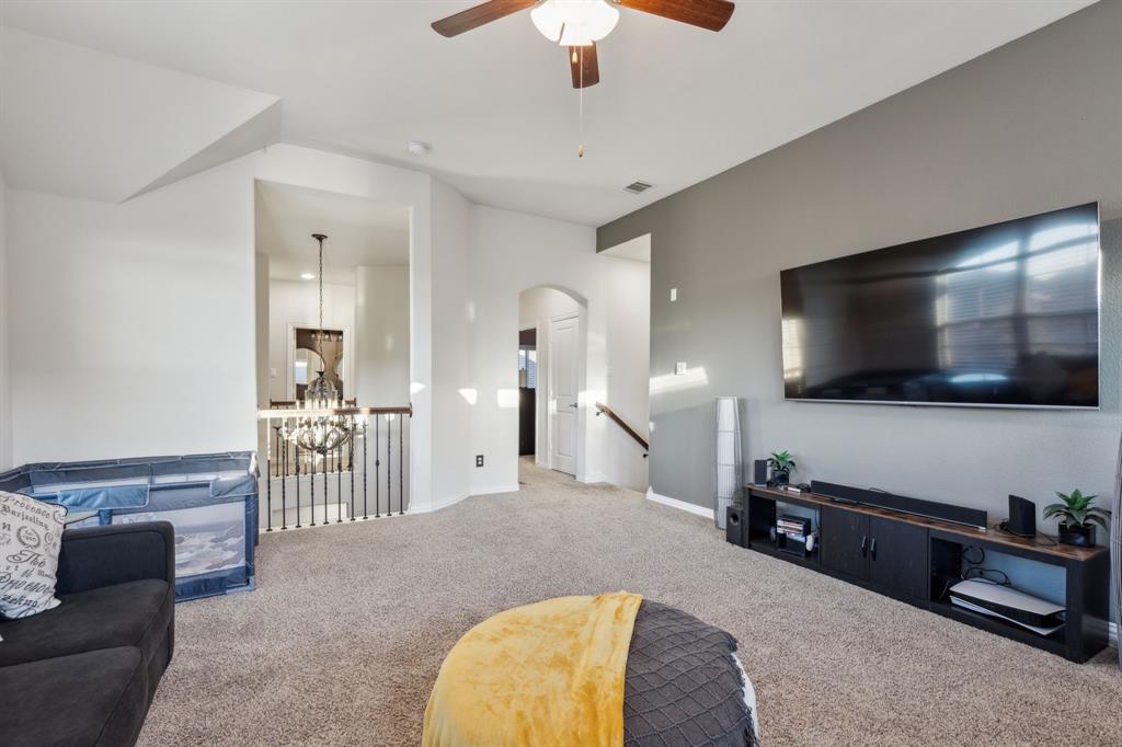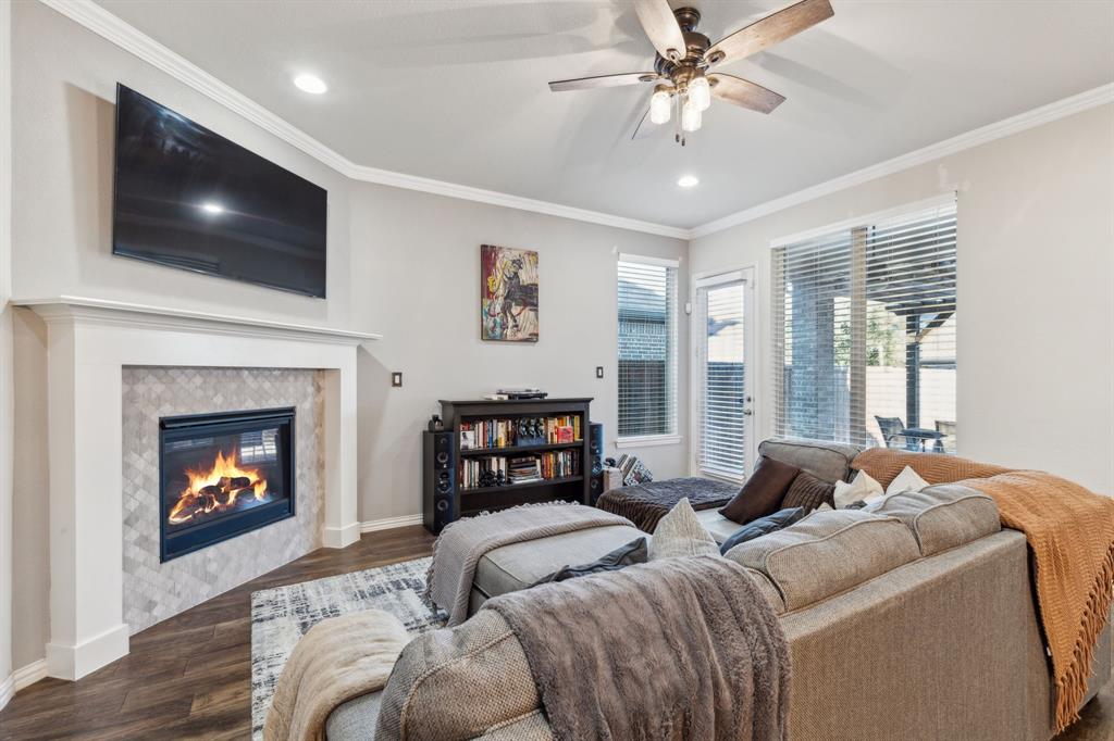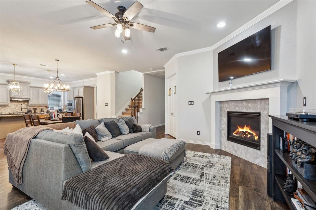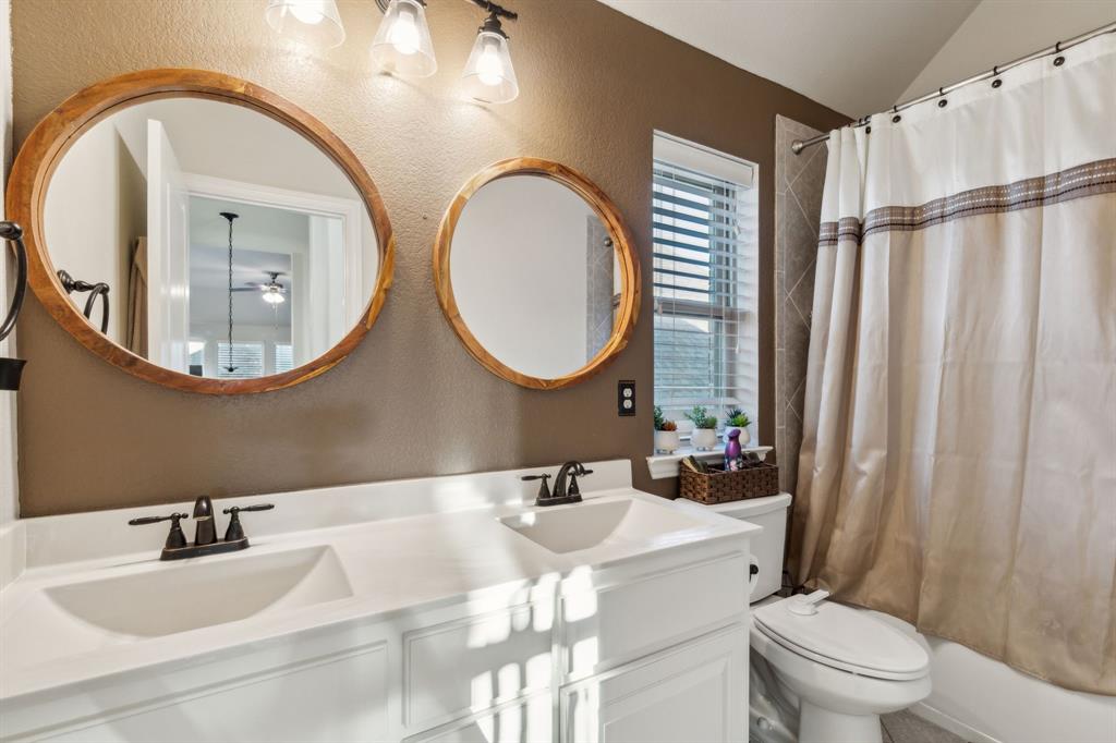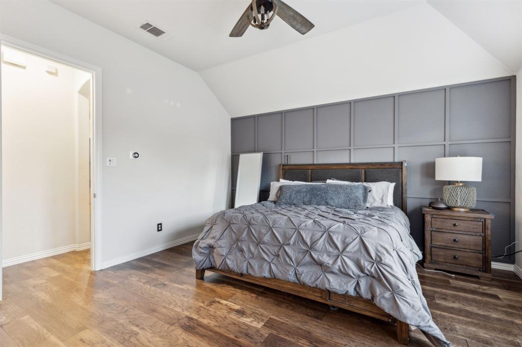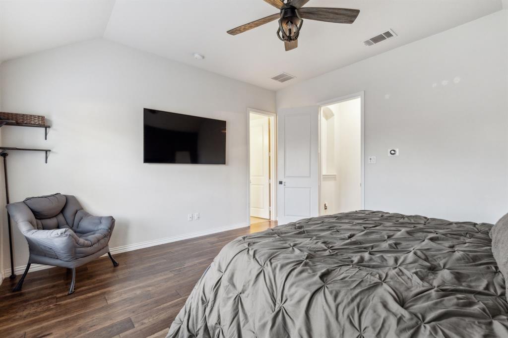 This stunning two-story brick and stone home is move-in ready! The well-designed floor plan includes a spacious first-floor guest bedroom and a private study that can also serve as an additional bedroom. Rich hardwood floors enhance the elegant dining room, which opens to the gorgeous kitchen. The kitchen boasts a large granite island, stylish pendant lighting, a gas cooktop, and stainless steel appliances. The cozy living room is anchored by a warm fireplace, with crown molding adding a touch of sophistication to the ceilings. A full-size utility room with built-in cabinets provides ample storage space. Upstairs, you'll love the expansive game room, accompanied by two generously sized guest bedrooms and a full bathroom. The first-floor primary suite is generously sized, offering plenty of space for a sitting area. The en-suite bath features dual sinks, a garden tub, a separate shower, and a walk-in closet. Step outside to a backyard retreat with a covered patio and an extended pergola, perfect for relaxing or entertaining. The spacious yard provides plenty of room to enjoy the outdoors. Plus, the home includes energy-efficient solar panels!
