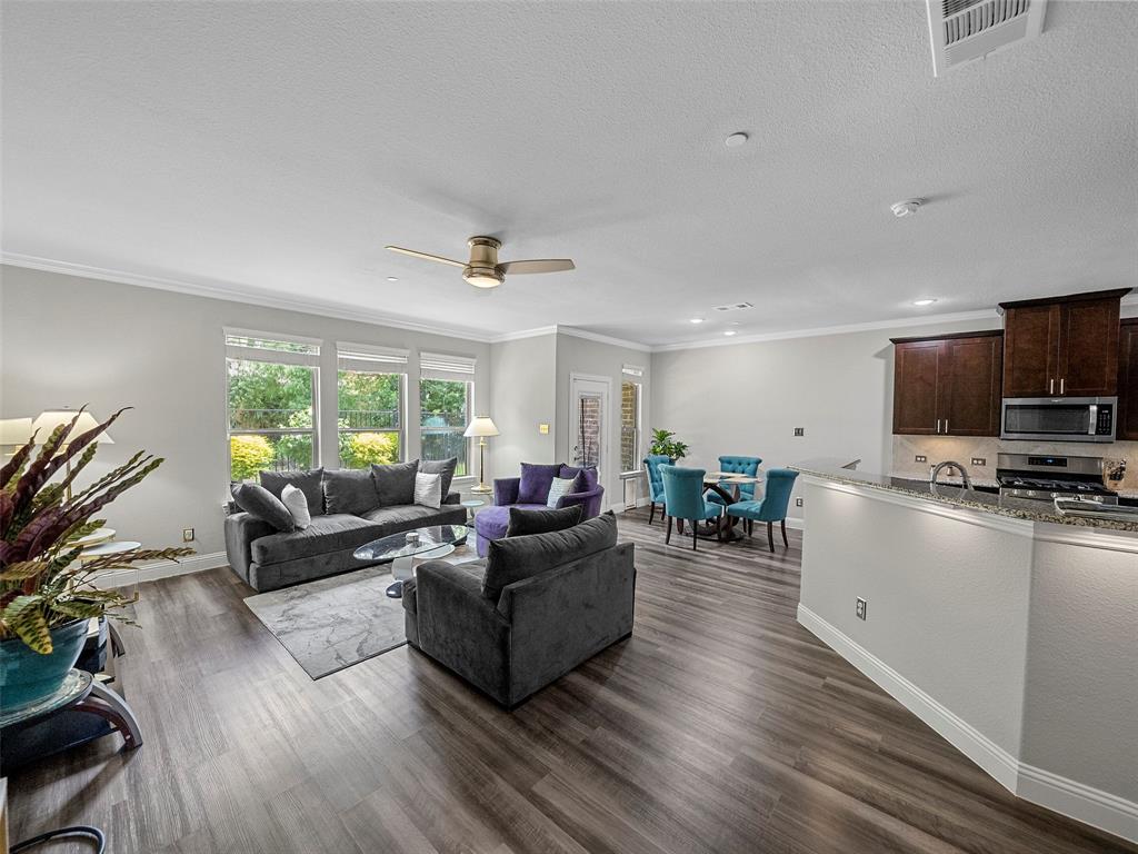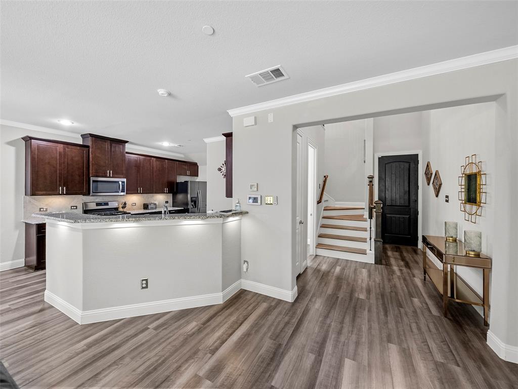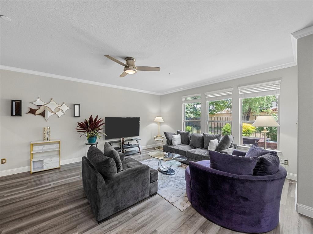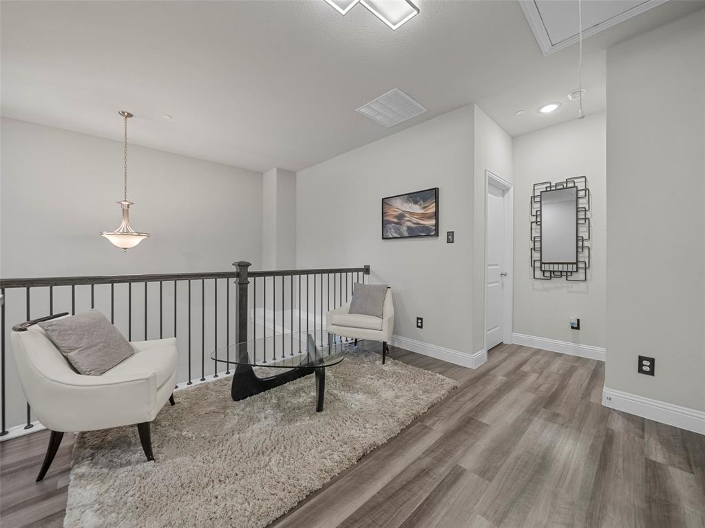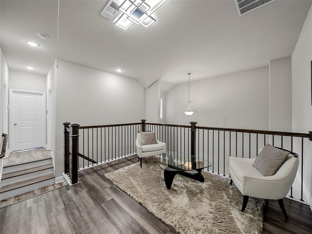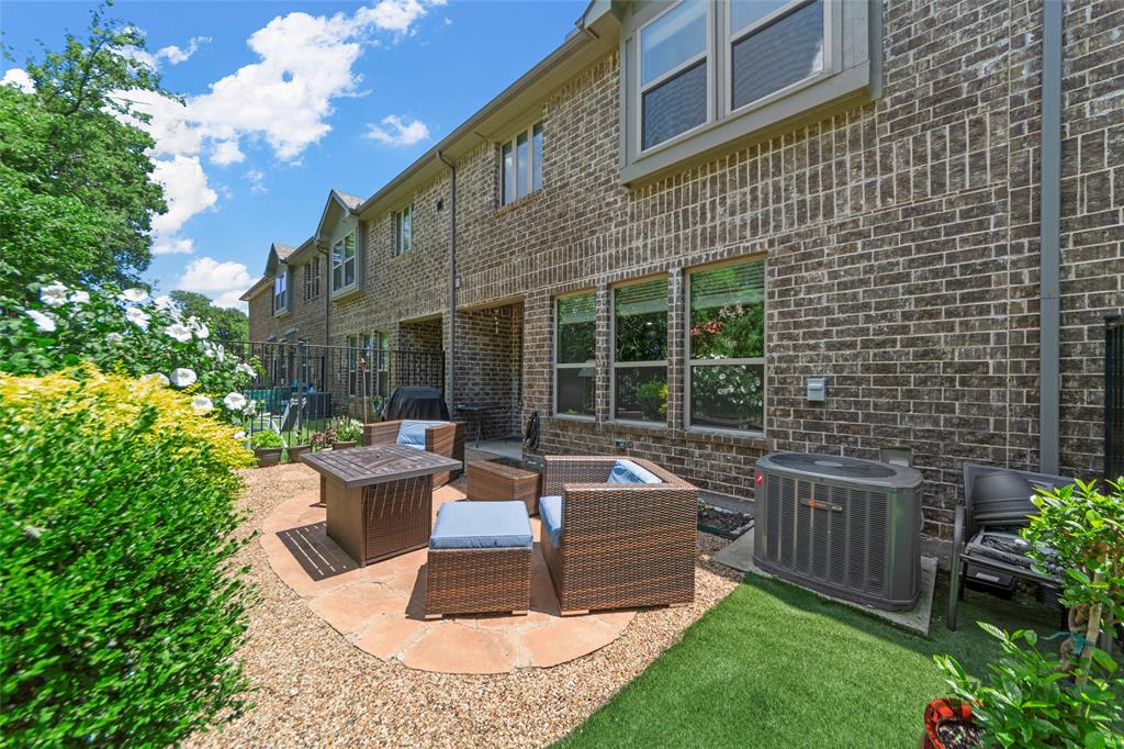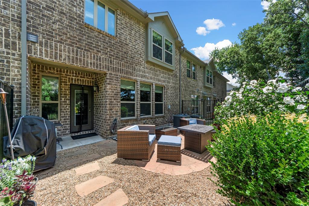 Conveniently located Townhome in the boutique Parkview Lane community in Allen. BEAUTIFUL easy-care backyard with flagstone patio with turf area - no grass mowing! - with views of the greenspace that is HOA maintained. Cute curb appeal including front patio sitting area, covered porch, and cedar garage door add so much character! Entry way with soaring ceilings says 'Welcome Home'! Open concept floor plan is perfect for entertaining. Easy-care luxury vinyl plank flooring throughout majority of the home including the stairs. Large living room with with expansive windows showcasing the lush outdoor greenspace. Kitchen with granite counters, soft-close drawers, gas range, large pantry and dining area. LARGE 18x12 private primary suite with window seat & continued views of the greenspace. Spa-like ensuite primary bathroom with dual vanities, oversized walk-in shower, and big walk-in closet. Loft space with floor plugs makes for a great second living area or flex space in this home. Split floor plan offers additional privacy from primary suite. Half bathroom downstairs is perfect for guests. Attached 2-car garage with storage closet, and additional hanging racks - so much storage! You do not want to miss out on this amazing opportunity in Allen ISD! HOA includes front yard maintenance & blanket insurance - additional benefits to the easy-care lifestyle of townhome living! This community is adjacent to the Cottonwood Creek South Walking Trail - one of the many over 83 miles of trails in Allen TX!