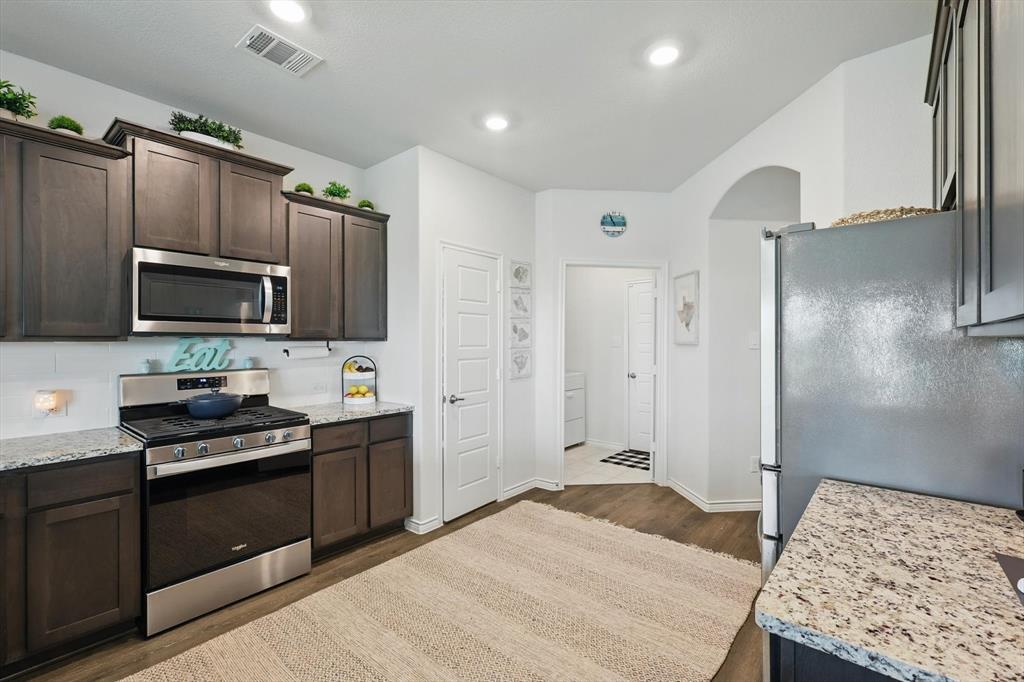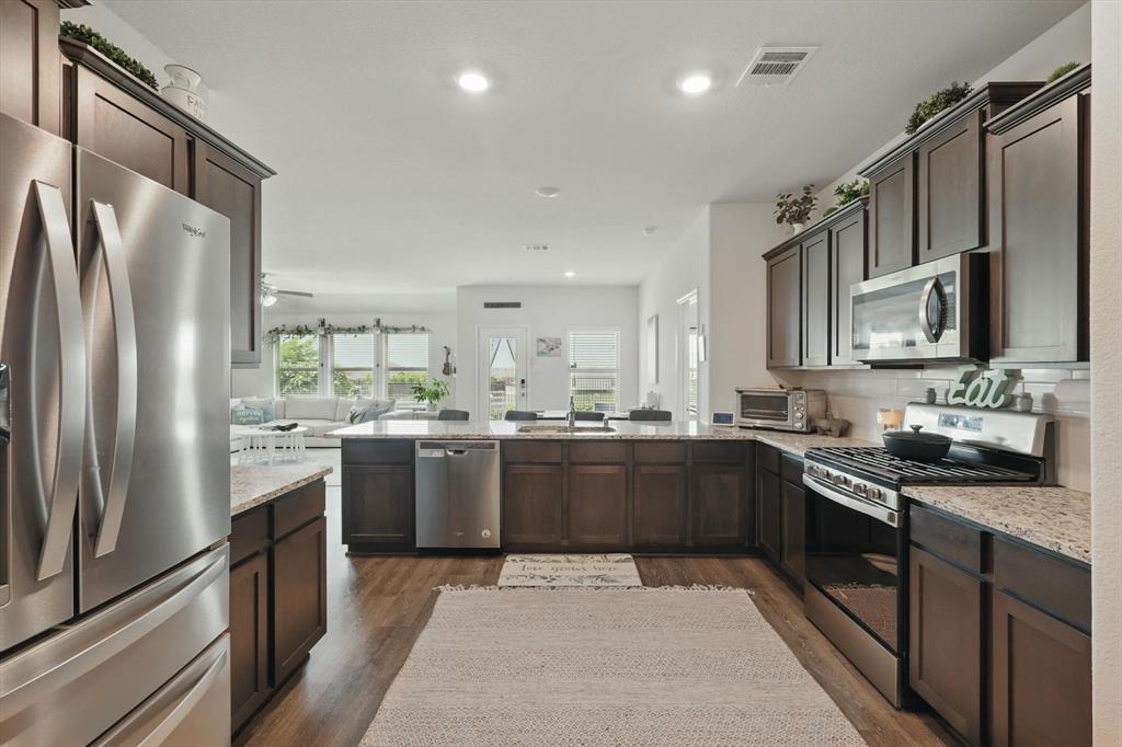 Inside, you’ll find high ceilings, great natural light, and a spacious open-concept layout. The kitchen features granite countertops, Whirlpool stainless steel appliances, a gas range, and a large walk-in pantry — ideal for both daily living and entertaining.