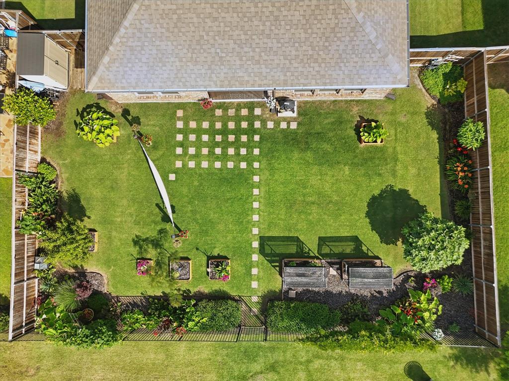 Step outside to your own private retreat: lush tropical perennials, custom hammock posts, raised garden beds, landscape lighting, and wide greenbelt views. The backyard is fully equipped with a Rachio smart irrigation system, French drains, and drip lines for low-maintenance care.