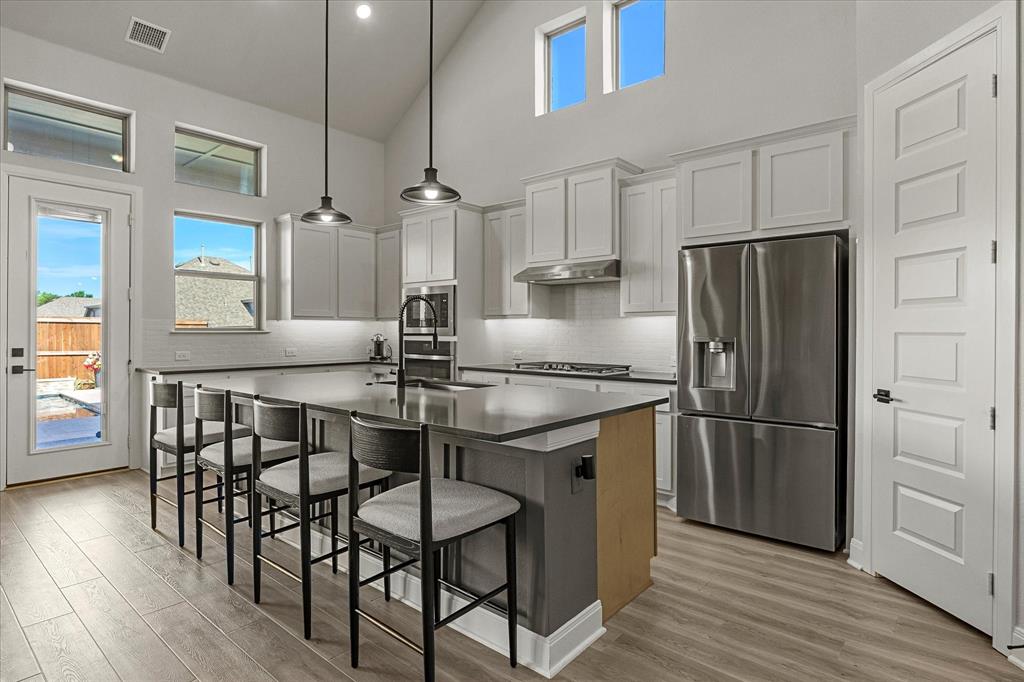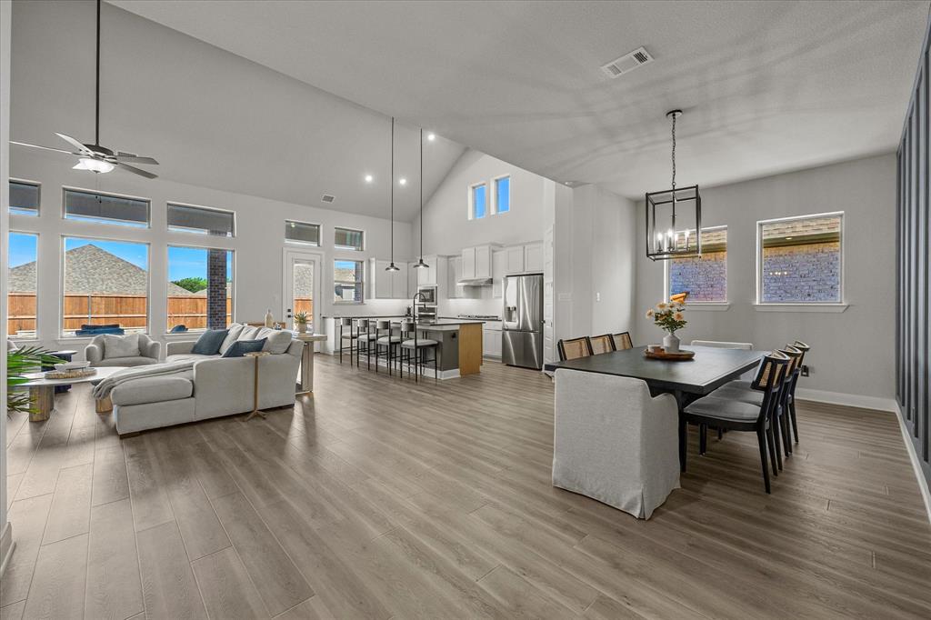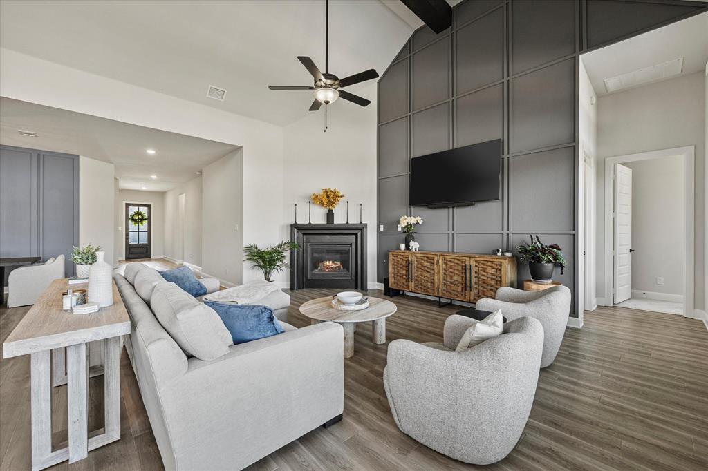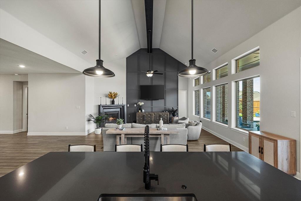 Nestled in a picturesque neighborhood near top-rated schools, charming downtown, and scenic Lake Ray Hubbard, this like-new, modern-style home offers an exceptional lifestyle in one level. A thoughtfully designed open floor plan unfolds as you enter—leading from an inviting covered porch into a stunning living area featuring designer lighting, a raised-panel feature wall, and a cozy fireplace. The seamless flow continues into the heart of the home: a chef-inspired kitchen boasting quartz countertops, custom cabinetry, a center island with breakfast bar, and high-end appliances. Adjacent to the kitchen, the formal dining room sets the stage for memorable family gatherings. A spacious media-game room—also perfect for a second living space—offers versatility and is ideal for everyday relaxation or entertaining guests. The generous owner’s suite overlooks the sparkling pool, opening directly into a spa-style bath with luxurious finishes. Three additional bedrooms feature roomy closets and share easy access to meticulously finished bathrooms. A private home office provides the perfect work-from-home environment. Plus, an expansive mudroom with built-ins adjoins the laundry area and garage—organized living at its best. Step outside to an extended covered patio that overlooks a sparkling pool and spa—perfect for outdoor entertaining or quiet afternoons. The lush, fully fenced backyard offers both privacy and appeal. Every detail of this home has been thoughtfully curated—from the designer fixtures to the desirable floor plan and tranquil outdoor oasis. This truly is a must-see home for discerning buyers seeking modern comfort and exceptional lifestyle amenities.