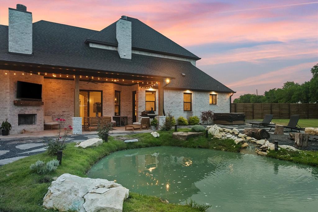 Backyard boasts a stunning water feature and a large paver stone covered patio with fire pit. Front and side land provide green space with a pond, while cross fenced animal areas include water and electricity access. A private water well ELIMINATES monthly water bills, and septic system has been professionally serviced by its original installer. House also features underground fiber internet, irrigation system, and BRAND NEW roof installed April 2025.